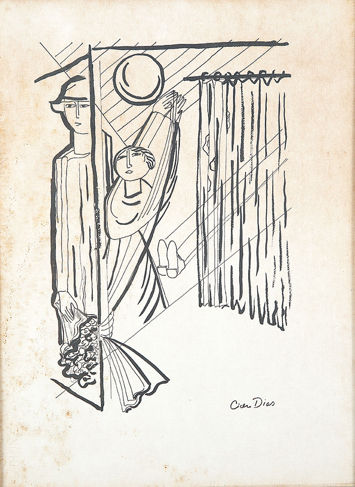Cicero dos Santos Dias (Escada PE 1907 - Paris França 2003). Pintor, gravador, desenhista, ilustrador, cenógrafo e professor. Inicia estudos de desenho em sua terra natal. Em 1920, muda-se para o Rio de Janeiro, onde matricula-se, em 1925, nos cursos de arquitetura e pintura da Escola Nacional de Belas Artes - Enba, mas não os conclui. Entra em contato com o grupo modernista e, em 1929, colabora com a Revista de Antropofagia. Em 1931, no Salão Revolucionário, na Enba, expõe o polêmico painel, tanto por sua dimensão quanto pela temática, Eu Vi o Mundo... Ele Começava no Recife. A partir de 1932, no Recife, leciona desenho em seu ateliê. Ilustra, em 1933, Casa Grande & Senzala, de Gilberto Freyre (1900- 1987).