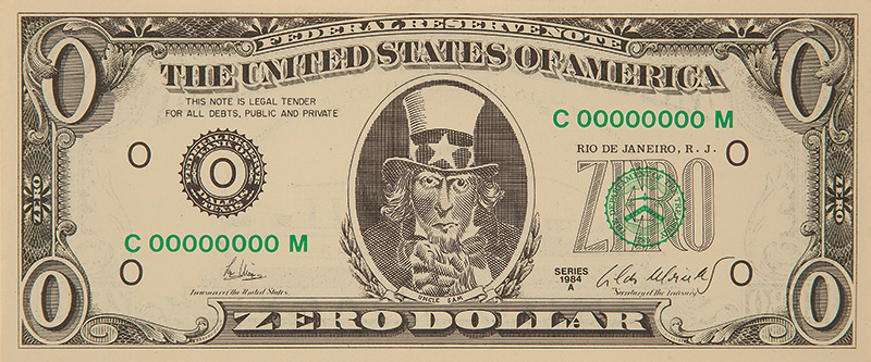 Cildo Meireles - Zero dollar - Impressão offset sobre papel moeda - Assinado canto inferior direito - 6,5 x 15 cm.