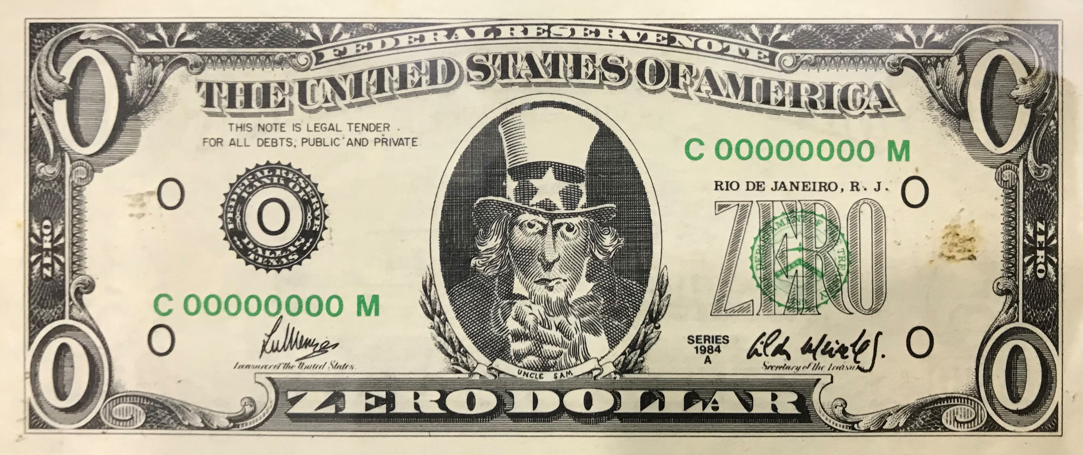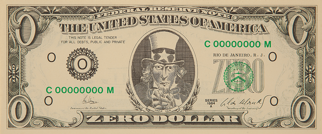 Cildo Meireles - Zero dollar - Impressão offset sobre papel moeda - Assinado canto inferior direito - 6,5 x 15 cm.