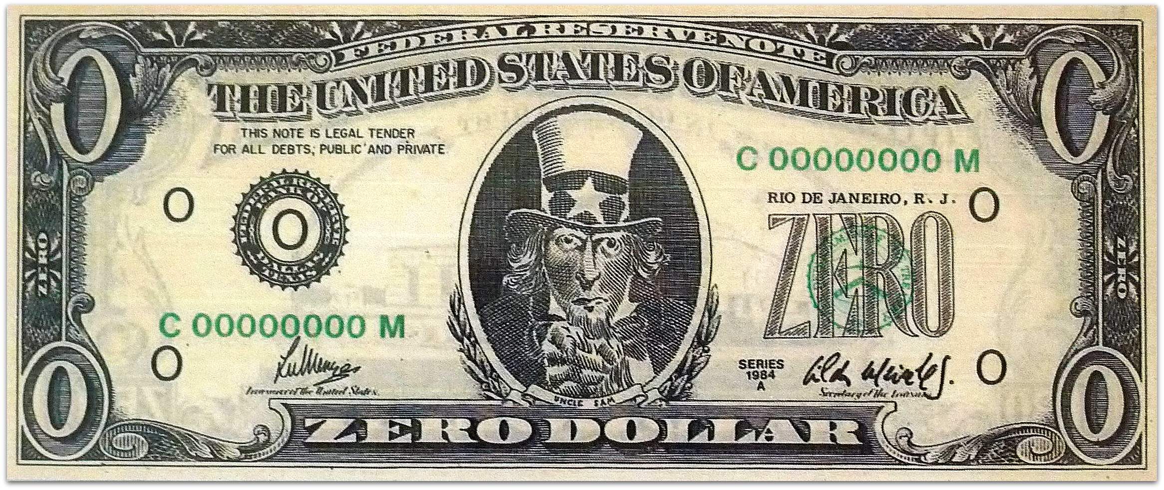 Cildo Meireles - Zero dollar - Impressão offset sobre papel moeda - Assinado canto inferior direito - 6,5 x 15 cm.