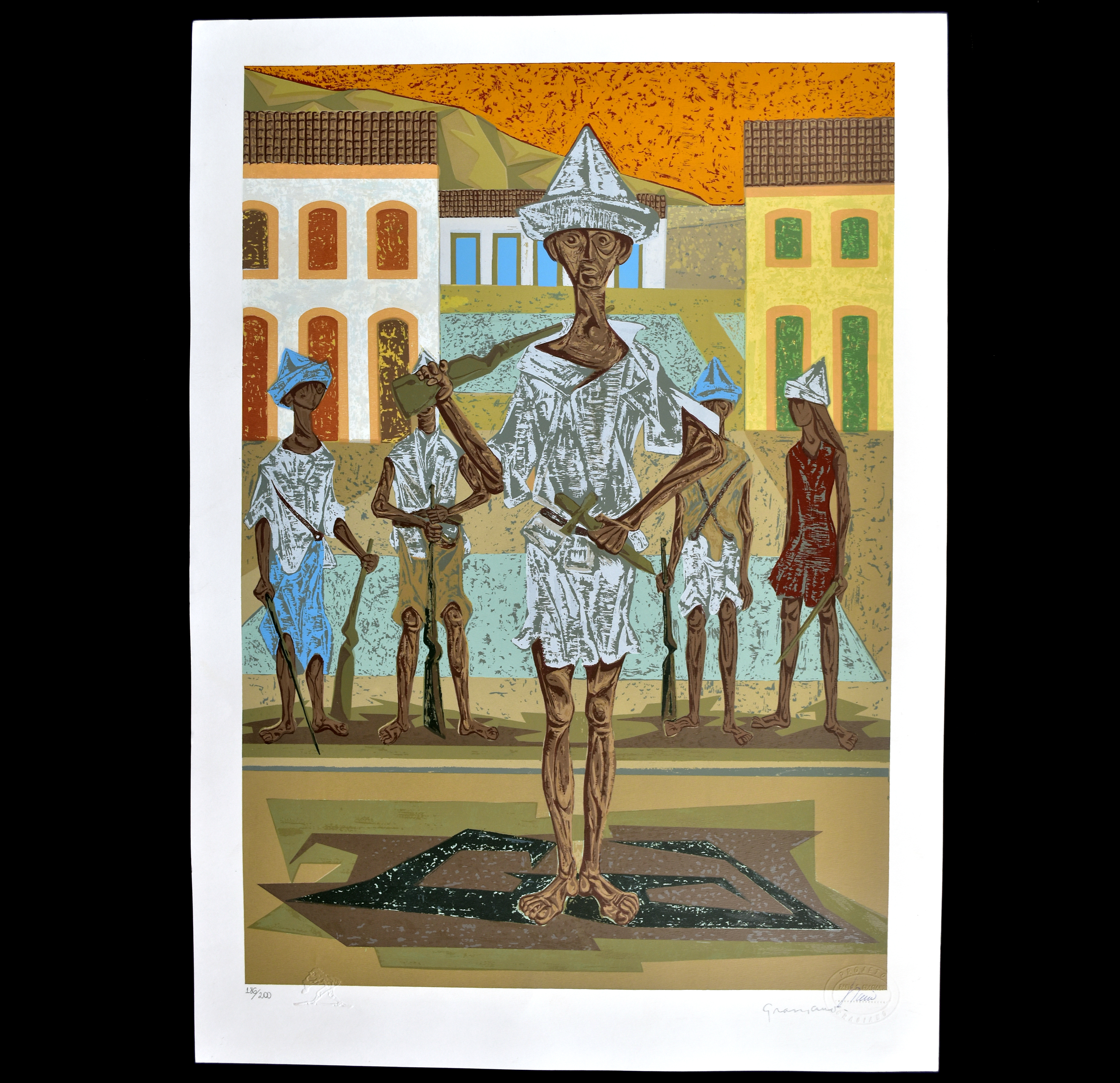 CLOVIS GRACIANO "SOLDADOS CABEÇA DE PAPEL". SERIGRAFIA LIMITADA: 186-200. CARIMBO NO VERSO: "EDIÇAO CENTENARIO" MARCA D'ÁGUA: PROJETO GRACIANO 2007. MED: 70 X 50 CM.