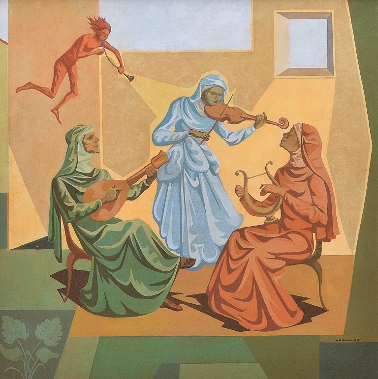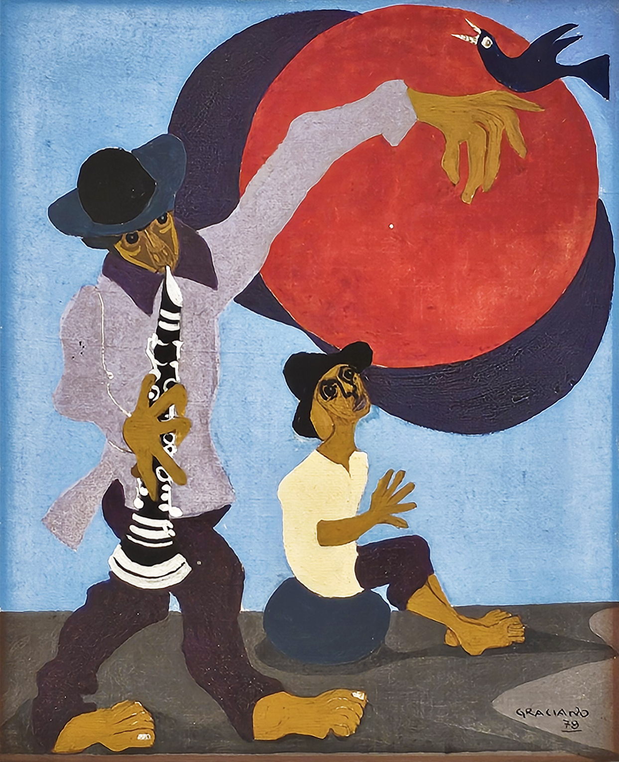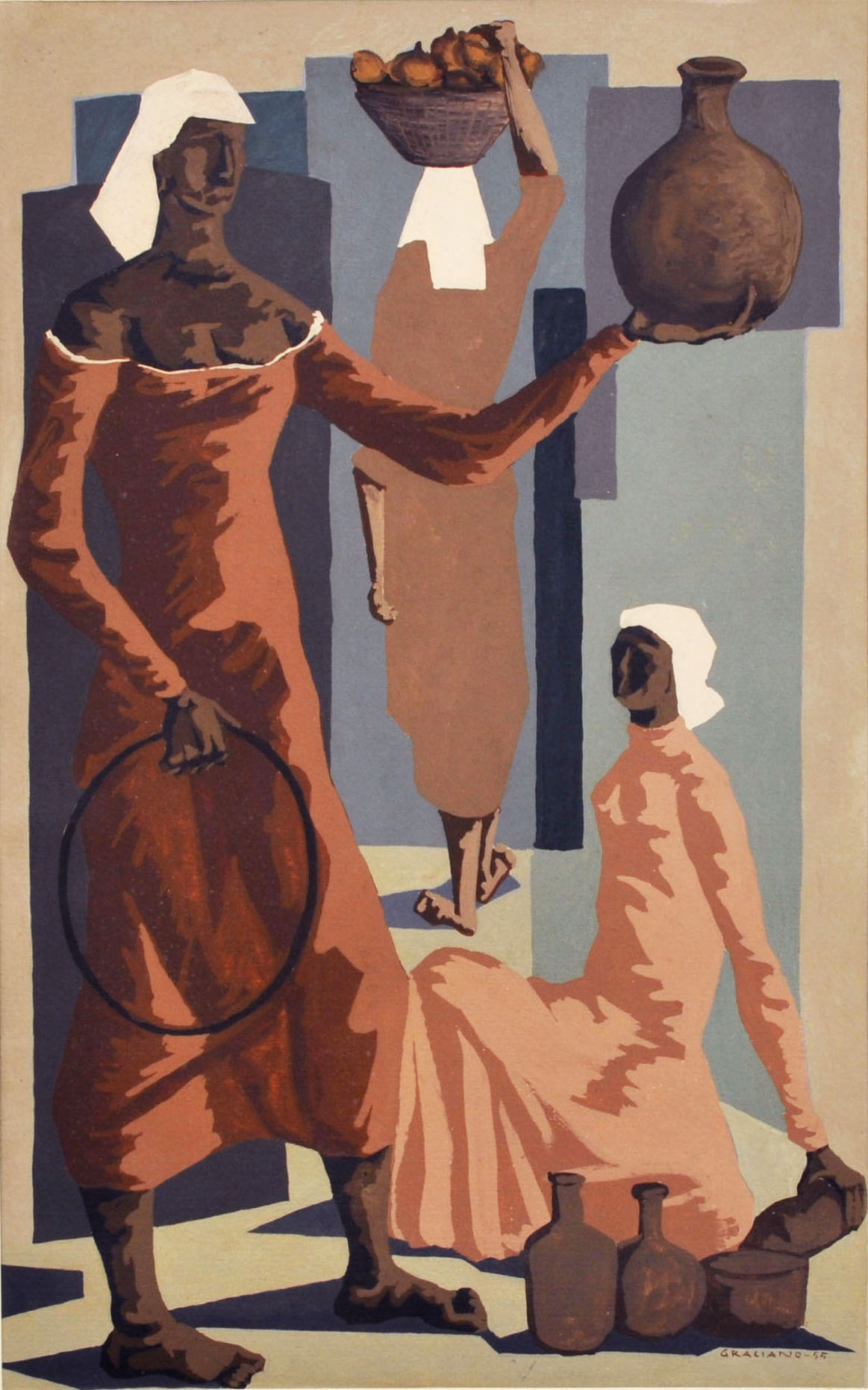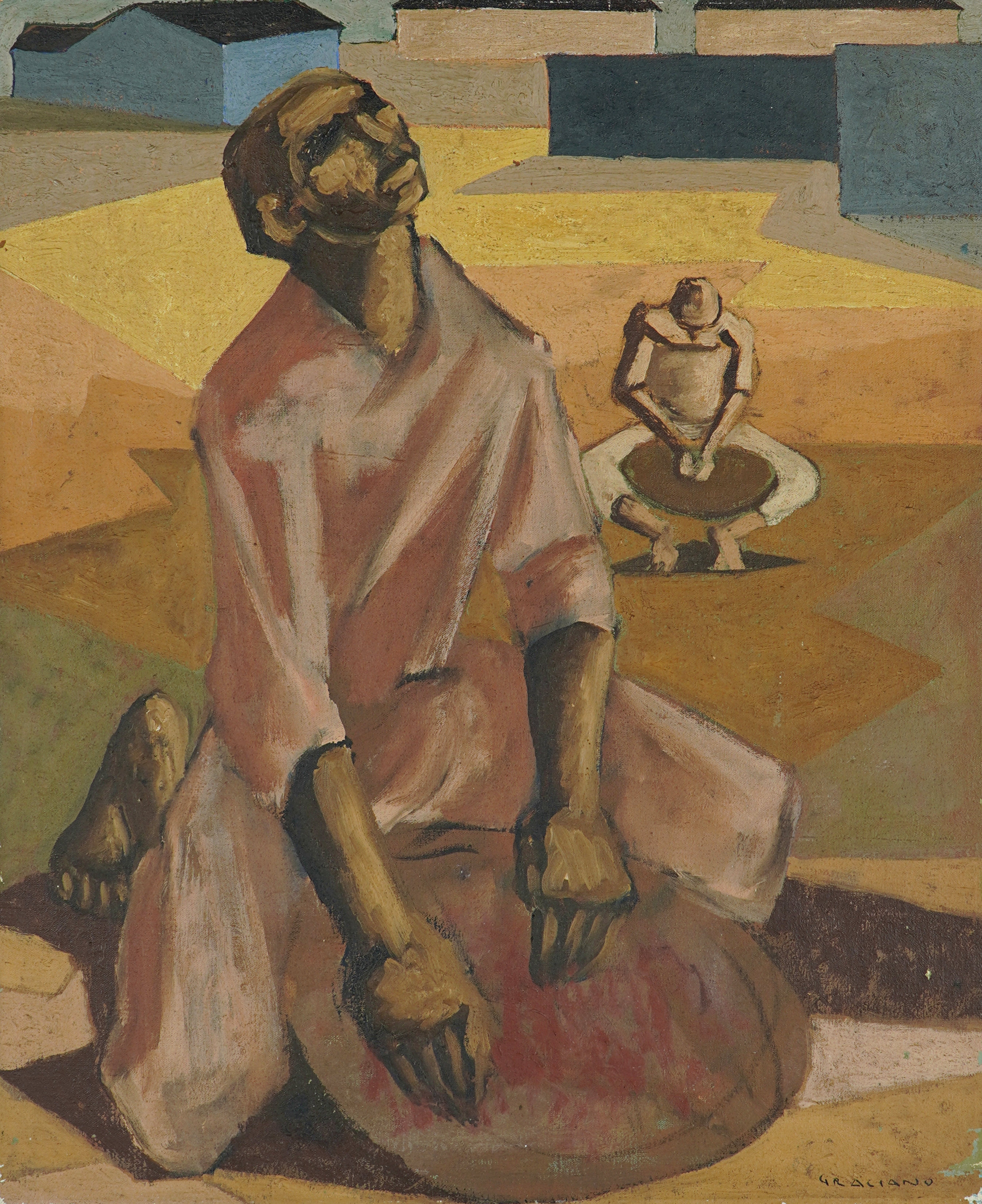 Clóvis Graciano (Araras SP 1907 - São Paulo SP 1988). Pintor, desenhista, cenógrafo, gravador, ilustrador. Em 1934, muda-se para a cidade de São Paulo onde realiza estudos com o pintor Waldemar da Costa (1904 - 1982), entre 1935 e 1937. Com Francisco Rebolo, Mario Zanini e Bonadei, integra o Grupo Santa Helena, em 1937. Na Escola Paulista de Belas Artes freqüenta como aluno ouvinte o curso de desenho até 1938. Em 1939 é eleito presidente da Família Artística Paulista-FAP. Em 1941, realiza sua primeira exposição individual e em 1948 é sócio-fundador do Museu de Arte Moderna de São Paulo-MAM/SP. Recebe prêmio no Salão Nacional de Belas Artes de viagem á Europa, em 1949. Estuda gravura e pintura mural por dois anos em Paris. Nos anos 1950 dedica-se especialmente a pintura mural. Transita pela ilustração de obras literárias, como Cancioneiro da Bahia de Dorival Caymmi e Terras do Sem Fim de Jorge Amado. Assume a direção da Pinacoteca do Estado de São Paulo, em 1971. Entre 1976 e 1978 é adido cultural em Paris. A obra de Clóvis Graciano caracteriza-se pela fidelidade ao figurativismo onde predominam os temas sociais. Produz paisagens e naturezas- mortas, cuja particularidade reside na singularidade do corte, no grafismo sintético e na rapidez da execução. Sua arte apresenta influência de Candido Portinari, uma vez que recorre ao pós-cubismo, à superposição de planos, e desconstrói a perspectiva por meio da deformação das figuras, especialmente de mãos e pés. A arte de Clóvis Graciano, principalmente a produção dos anos 1940, é marcada por temas sociais e pela figura humana, nas quais figuram os retirantes. Também produziu auto-retratos que expressam pouca tensão, mas apresentam variações psicológicas. Nos anos 1950 a produção é voltada à pintura mural como Arsmistício de Iperoig, na Fundação Armando Álvares Penteado-FAAP, entre outros, cuja inspiração advém do Renascimento.