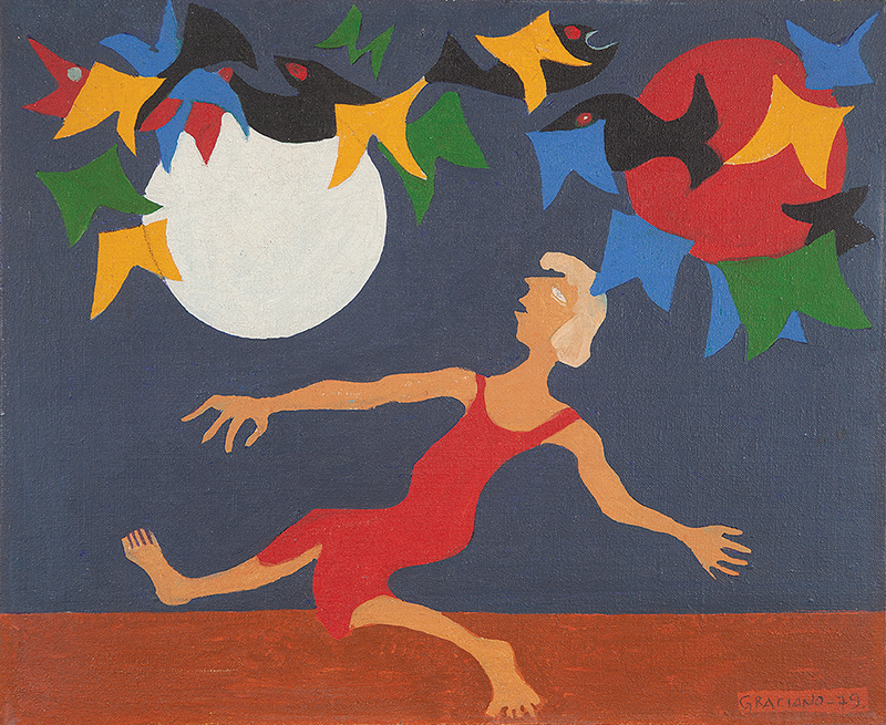 CLOVIS GRACIANO, Figura Femina e Pássaros, Guache sobre Papel, ACID, 25,5 x 17cm (m.i). Datado 1955 (com selo de catalogação da Obra de Clovis Graciano no verso, numerada 584/665) (com fungos)