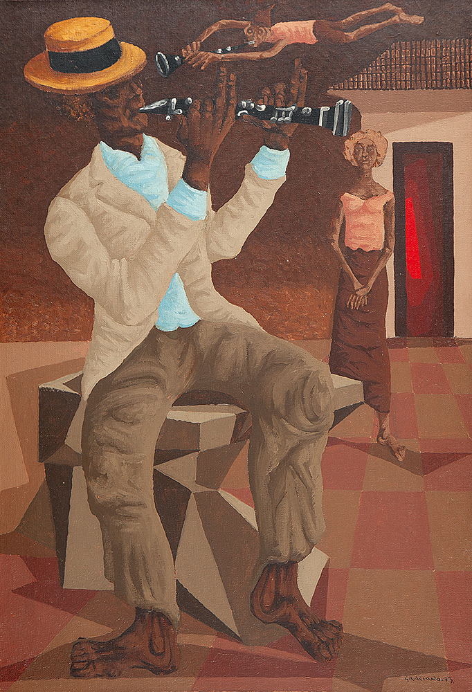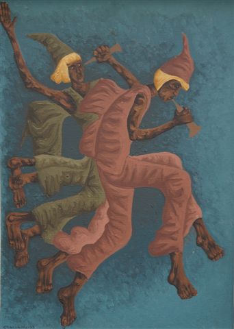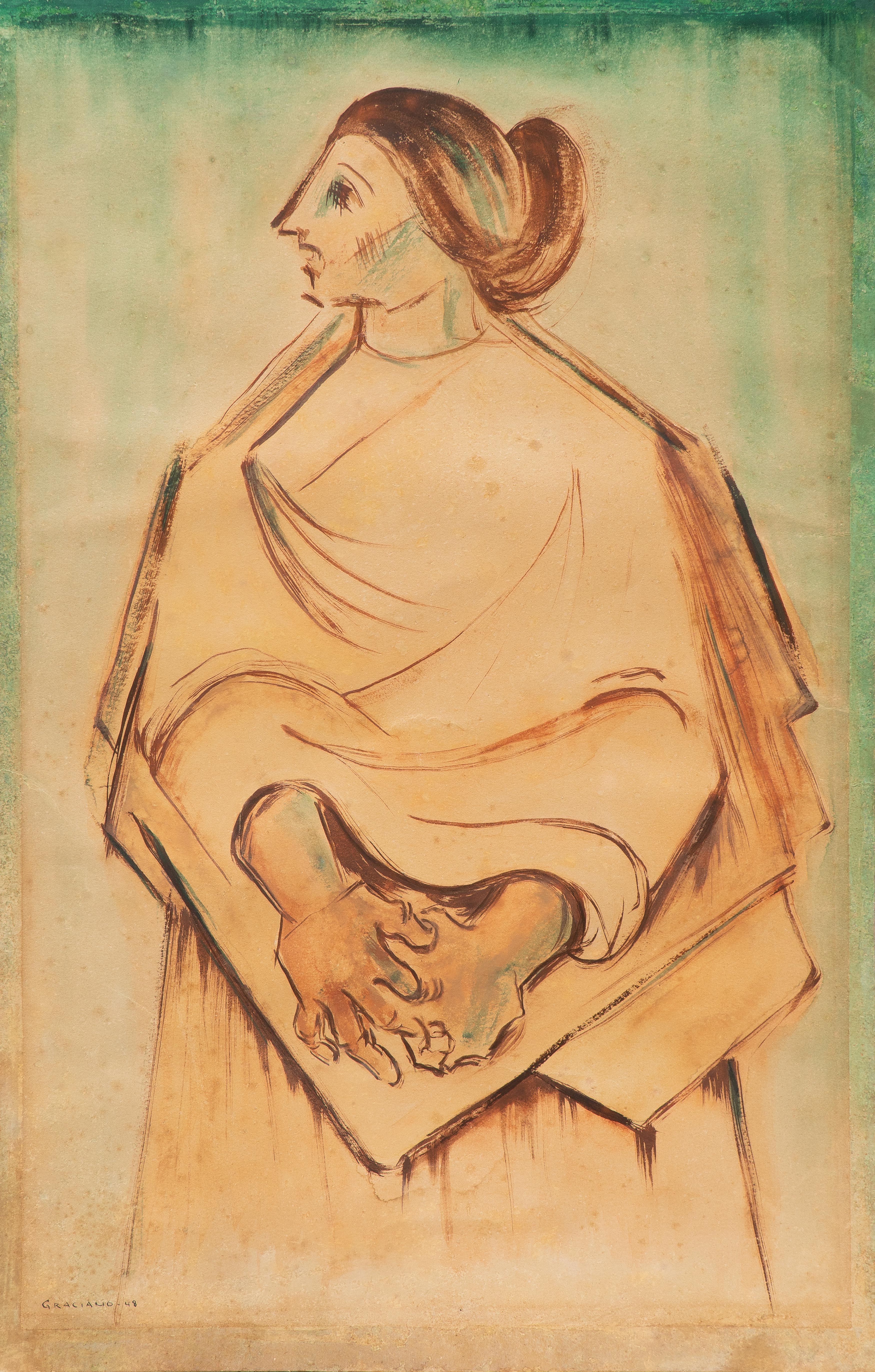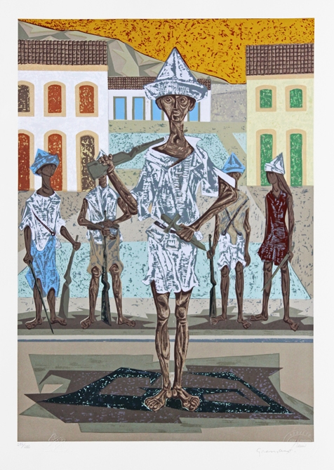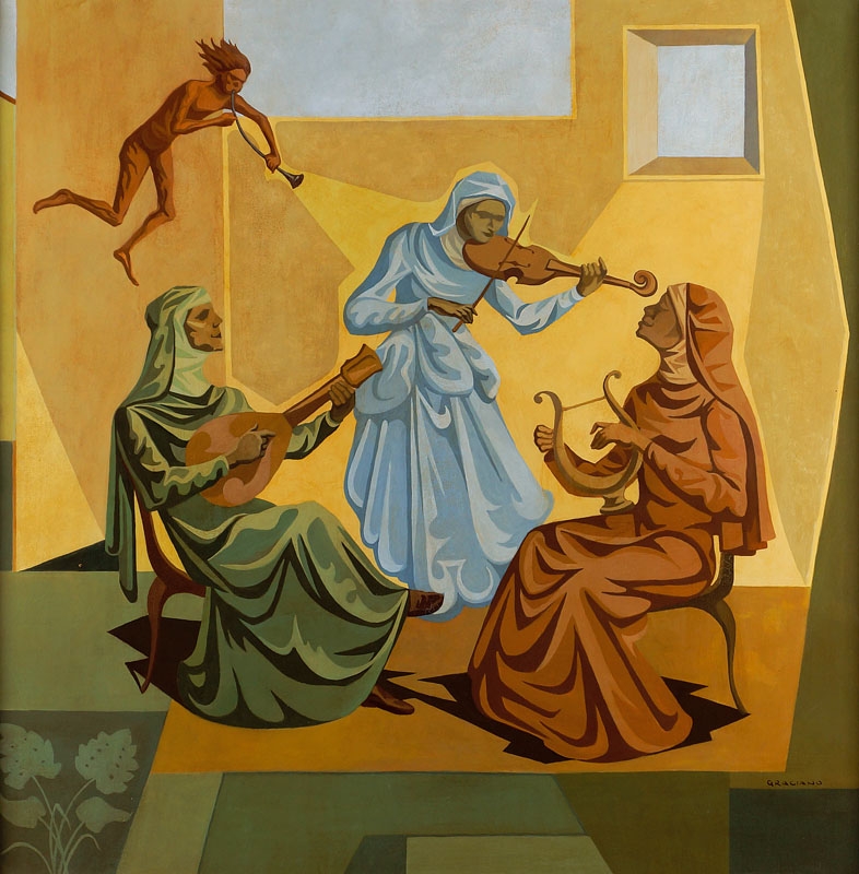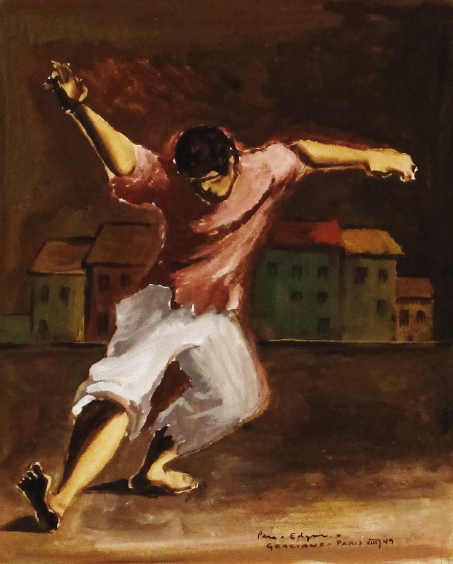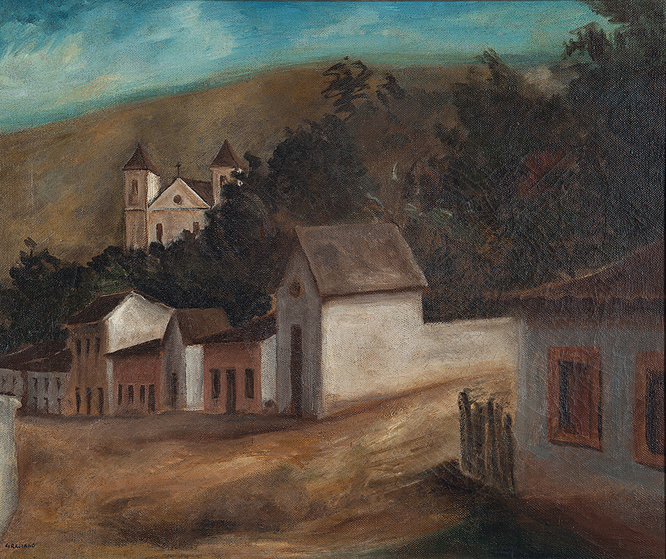 Clóvis Graciano (Araras SP 1907 - São Paulo SP 1988). Pintor, desenhista, cenógrafo, gravador, ilustrador. Em 1934, muda-se para a cidade de São Paulo onde realiza estudos com o pintor Waldemar da Costa (1904 - 1982), entre 1935 e 1937. Com Francisco Rebolo, Mario Zanini e Bonadei, integra o Grupo Santa Helena, em 1937. Na Escola Paulista de Belas Artes freqüenta como aluno ouvinte o curso de desenho até 1938. Em 1939 é eleito presidente da Família Artística Paulista-FAP. Em 1941, realiza sua primeira exposição individual e em 1948 é sócio-fundador do Museu de Arte Moderna de São Paulo-MAM/SP. Recebe prêmio no Salão Nacional de Belas Artes de viagem á Europa, em 1949. Estuda gravura e pintura mural por dois anos em Paris. Nos anos 1950 dedica-se especialmente a pintura mural. Transita pela ilustração de obras literárias, como Cancioneiro da Bahia de Dorival Caymmi e Terras do Sem Fim de Jorge Amado. Assume a direção da Pinacoteca do Estado de São Paulo, em 1971. Entre 1976 e 1978 é adido cultural em Paris. A obra de Clóvis Graciano caracteriza-se pela fidelidade ao figurativismo onde predominam os temas sociais. Produz paisagens e naturezas- mortas, cuja particularidade reside na singularidade do corte, no grafismo sintético e na rapidez da execução. Sua arte apresenta influência de Candido Portinari, uma vez que recorre ao pós-cubismo, à superposição de planos, e desconstrói a perspectiva por meio da deformação das figuras, especialmente de mãos e pés. A arte de Clóvis Graciano, principalmente a produção dos anos 1940, é marcada por temas sociais e pela figura humana, nas quais figuram os retirantes. Também produziu auto-retratos que expressam pouca tensão, mas apresentam variações psicológicas. Nos anos 1950 a produção é voltada à pintura mural como Arsmistício de Iperoig, na Fundação Armando Álvares Penteado-FAAP, entre outros, cuja inspiração advém do Renascimento.