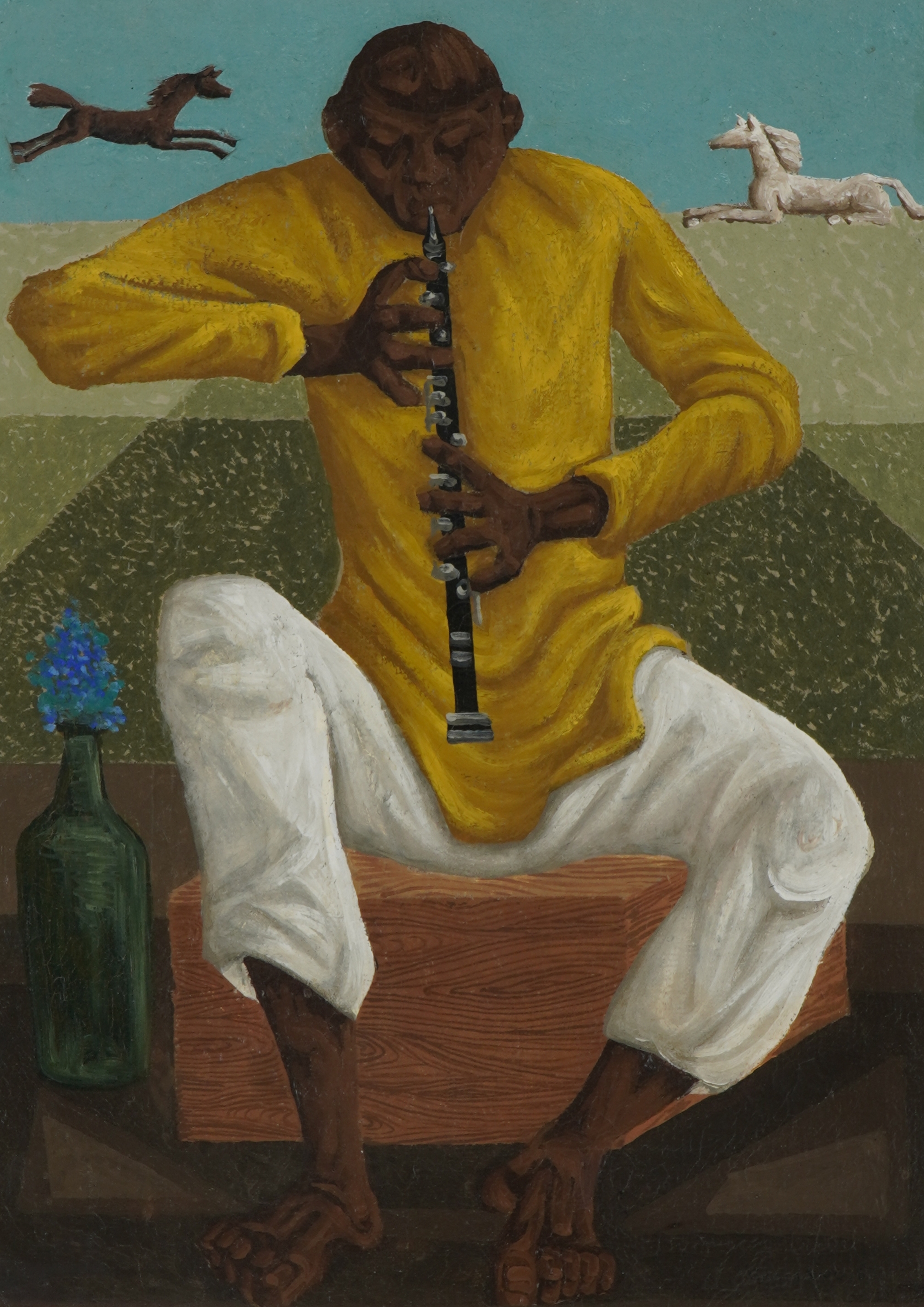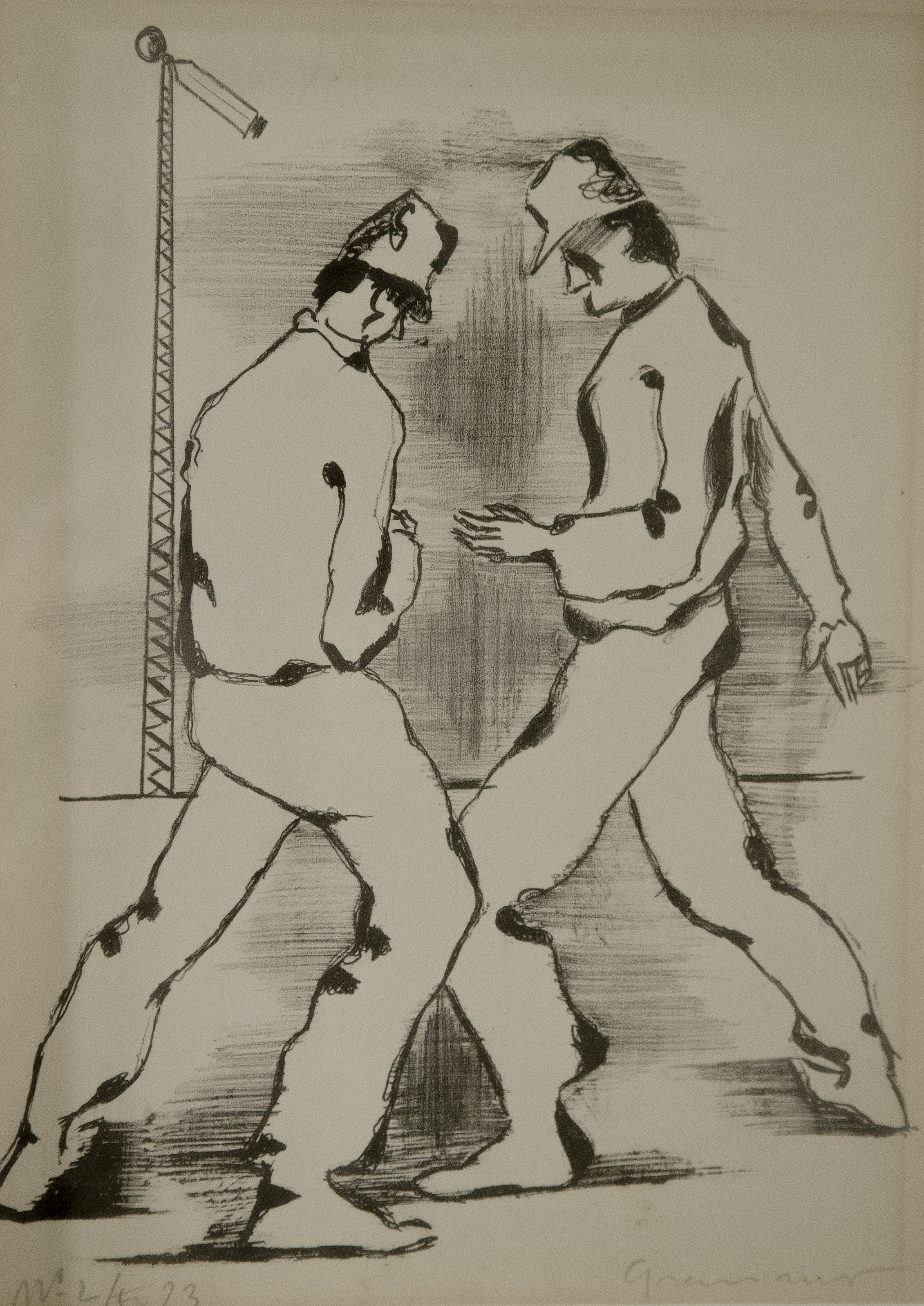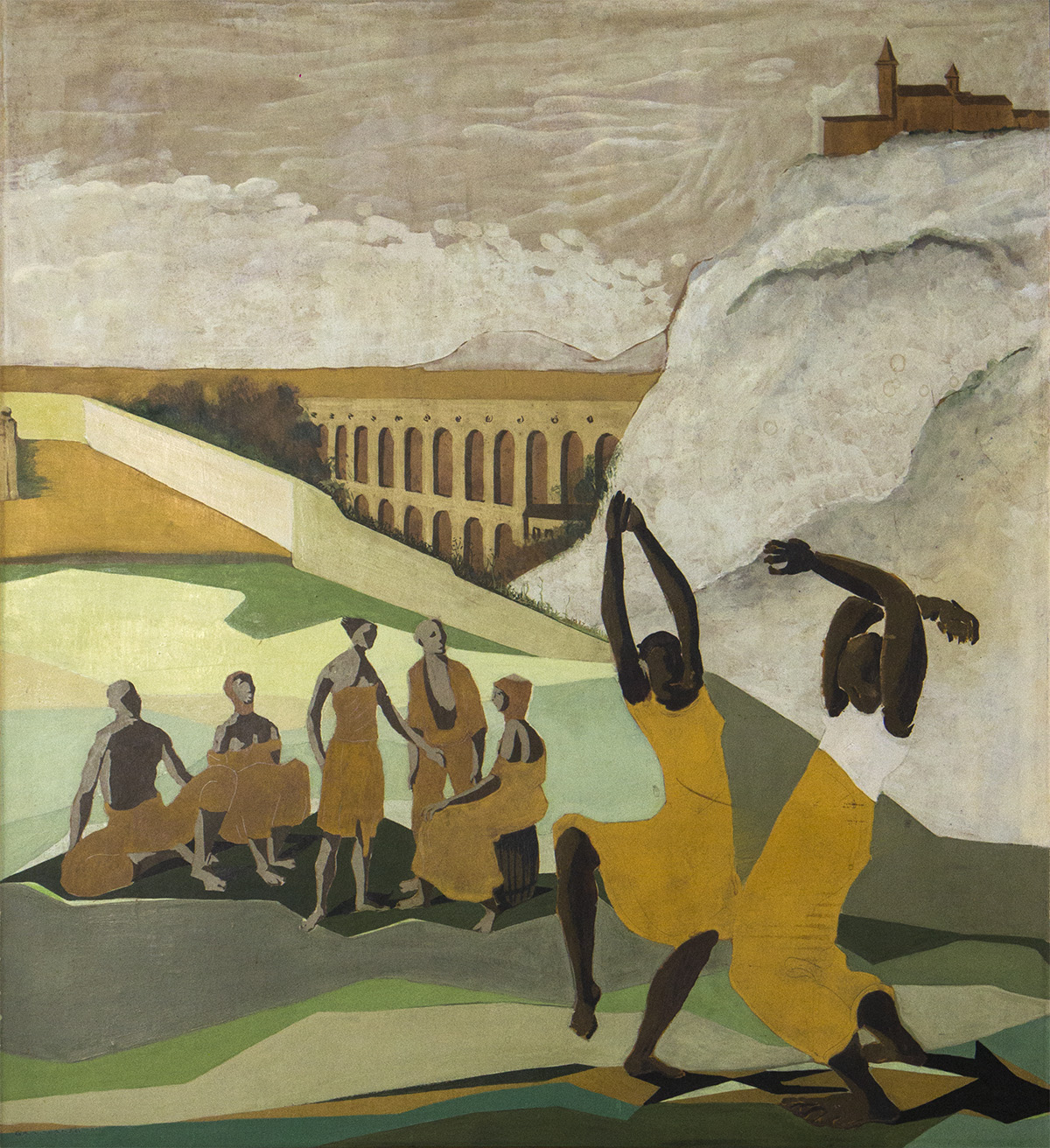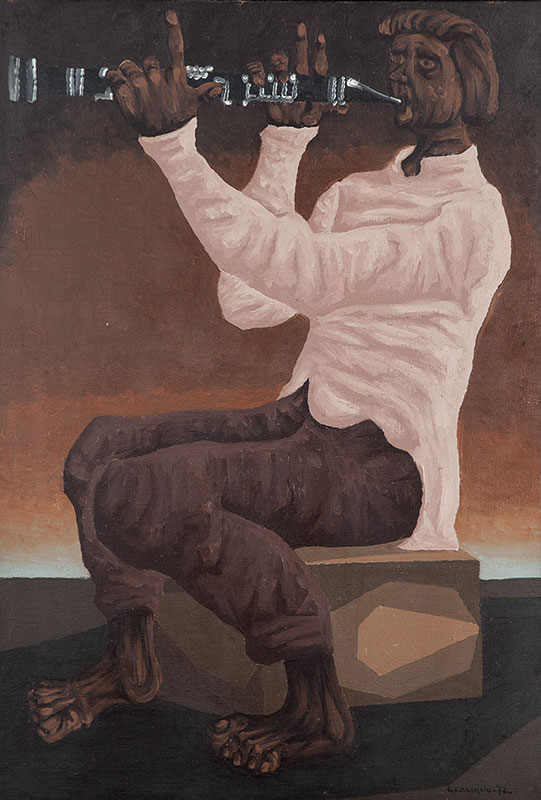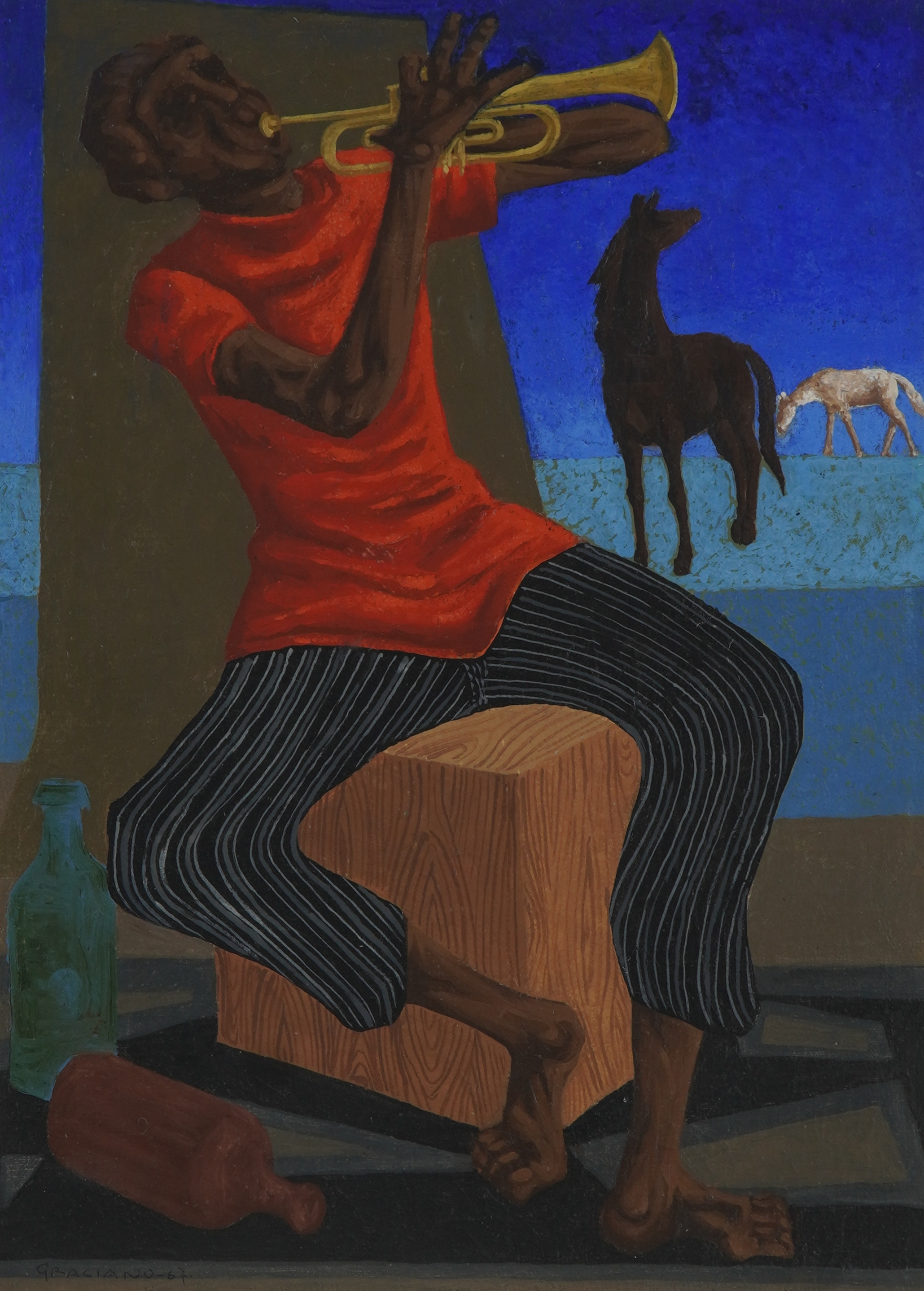 Clóvis Graciano (Araras SP 1907 - São Paulo SP 1988). Pintor, desenhista, cenógrafo, gravador, ilustrador. Em 1934, muda-se para a cidade de São Paulo onde realiza estudos com o pintor Waldemar da Costa (1904 - 1982), entre 1935 e 1937. Com Francisco Rebolo, Mario Zanini e Bonadei, integra o Grupo Santa Helena, em 1937. Na Escola Paulista de Belas Artes freqüenta como aluno ouvinte o curso de desenho até 1938. Em 1939 é eleito presidente da Família Artística Paulista-FAP. Em 1941, realiza sua primeira exposição individual e em 1948 é sócio-fundador do Museu de Arte Moderna de São Paulo-MAM/SP. Recebe prêmio no Salão Nacional de Belas Artes de viagem á Europa, em 1949. Estuda gravura e pintura mural por dois anos em Paris. Nos anos 1950 dedica-se especialmente a pintura mural. Transita pela ilustração de obras literárias, como Cancioneiro da Bahia de Dorival Caymmi e Terras do Sem Fim de Jorge Amado. Assume a direção da Pinacoteca do Estado de São Paulo, em 1971. Entre 1976 e 1978 é adido cultural em Paris. A obra de Clóvis Graciano caracteriza-se pela fidelidade ao figurativismo onde predominam os temas sociais. Produz paisagens e naturezas- mortas, cuja particularidade reside na singularidade do corte, no grafismo sintético e na rapidez da execução. Sua arte apresenta influência de Candido Portinari, uma vez que recorre ao pós-cubismo, à superposição de planos, e desconstrói a perspectiva por meio da deformação das figuras, especialmente de mãos e pés. A arte de Clóvis Graciano, principalmente a produção dos anos 1940, é marcada por temas sociais e pela figura humana, nas quais figuram os retirantes. Também produziu auto-retratos que expressam pouca tensão, mas apresentam variações psicológicas. Nos anos 1950 a produção é voltada à pintura mural como Arsmistício de Iperoig, na Fundação Armando Álvares Penteado-FAAP, entre outros, cuja inspiração advém do Renascimento.