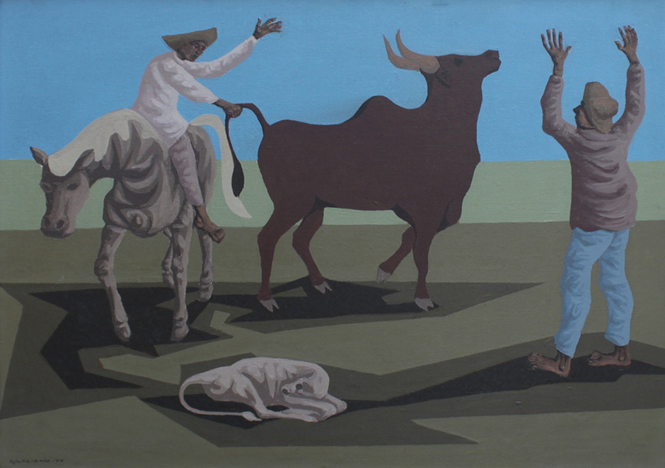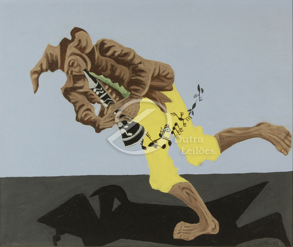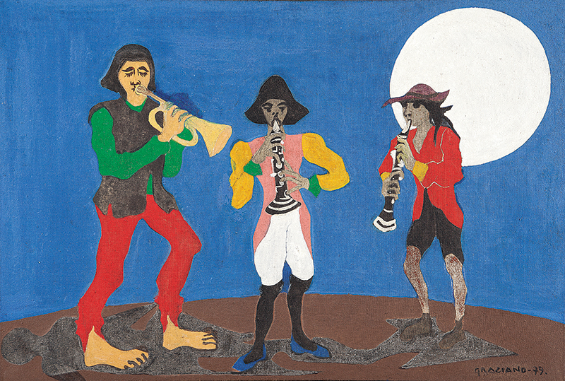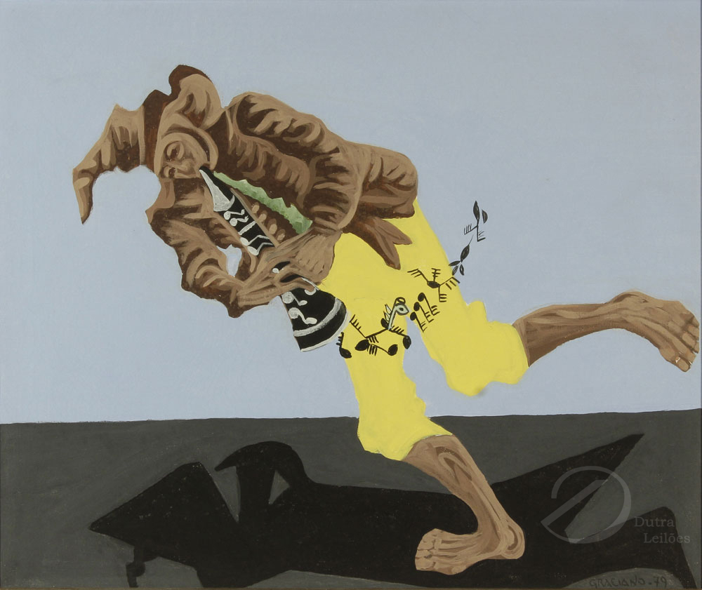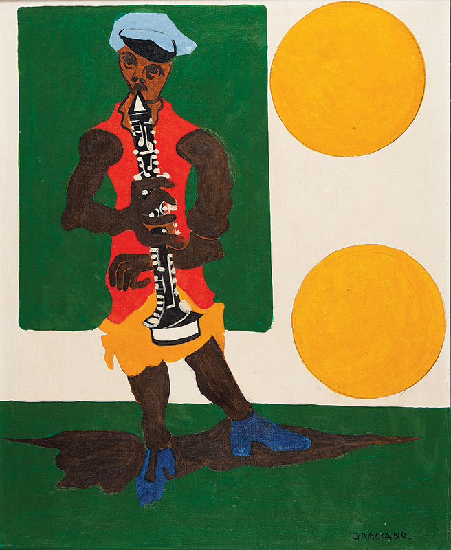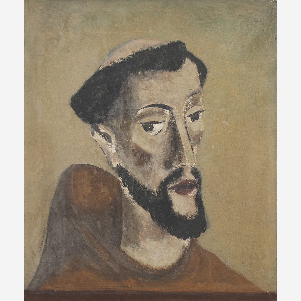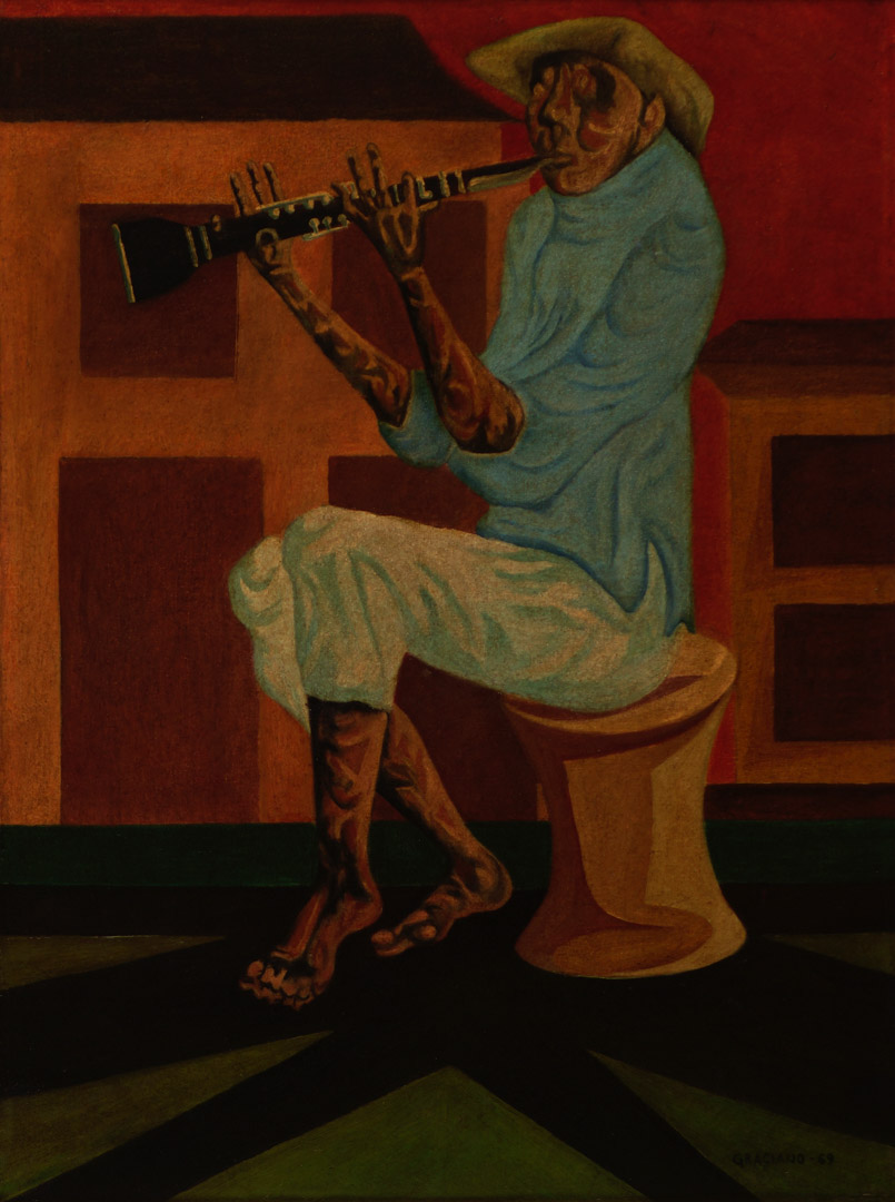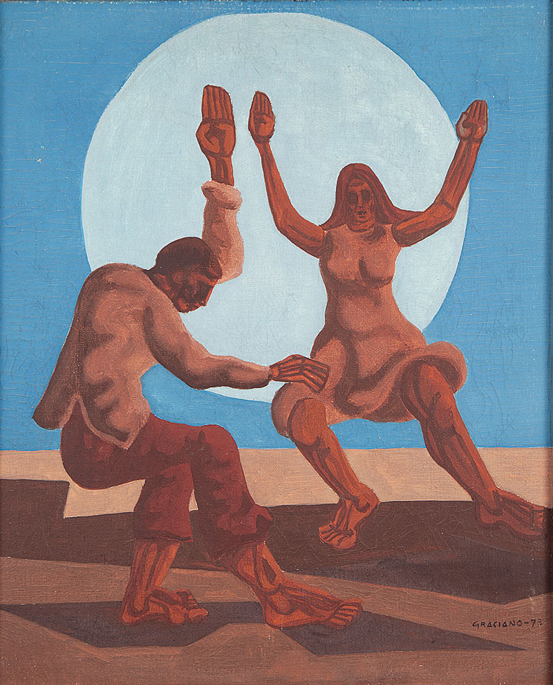 Clóvis Graciano (Araras SP 1907 - São Paulo SP 1988). Pintor, desenhista, cenógrafo, gravador, ilustrador. Em 1934, muda-se para a cidade de São Paulo onde realiza estudos com o pintor Waldemar da Costa (1904 - 1982), entre 1935 e 1937. Com Francisco Rebolo, Mario Zanini e Bonadei, integra o Grupo Santa Helena, em 1937. Na Escola Paulista de Belas Artes freqüenta como aluno ouvinte o curso de desenho até 1938. Em 1939 é eleito presidente da Família Artística Paulista-FAP. Em 1941, realiza sua primeira exposição individual e em 1948 é sócio-fundador do Museu de Arte Moderna de São Paulo-MAM/SP. Recebe prêmio no Salão Nacional de Belas Artes de viagem á Europa, em 1949. Estuda gravura e pintura mural por dois anos em Paris. Nos anos 1950 dedica-se especialmente a pintura mural. Transita pela ilustração de obras literárias, como Cancioneiro da Bahia de Dorival Caymmi e Terras do Sem Fim de Jorge Amado. Assume a direção da Pinacoteca do Estado de São Paulo, em 1971. Entre 1976 e 1978 é adido cultural em Paris. A obra de Clóvis Graciano caracteriza-se pela fidelidade ao figurativismo onde predominam os temas sociais. Produz paisagens e naturezas- mortas, cuja particularidade reside na singularidade do corte, no grafismo sintético e na rapidez da execução. Sua arte apresenta influência de Candido Portinari, uma vez que recorre ao pós-cubismo, à superposição de planos, e desconstrói a perspectiva por meio da deformação das figuras, especialmente de mãos e pés. A arte de Clóvis Graciano, principalmente a produção dos anos 1940, é marcada por temas sociais e pela figura humana, nas quais figuram os retirantes. Também produziu auto-retratos que expressam pouca tensão, mas apresentam variações psicológicas. Nos anos 1950 a produção é voltada à pintura mural como Arsmistício de Iperoig, na Fundação Armando Álvares Penteado-FAAP, entre outros, cuja inspiração advém do Renascimento.