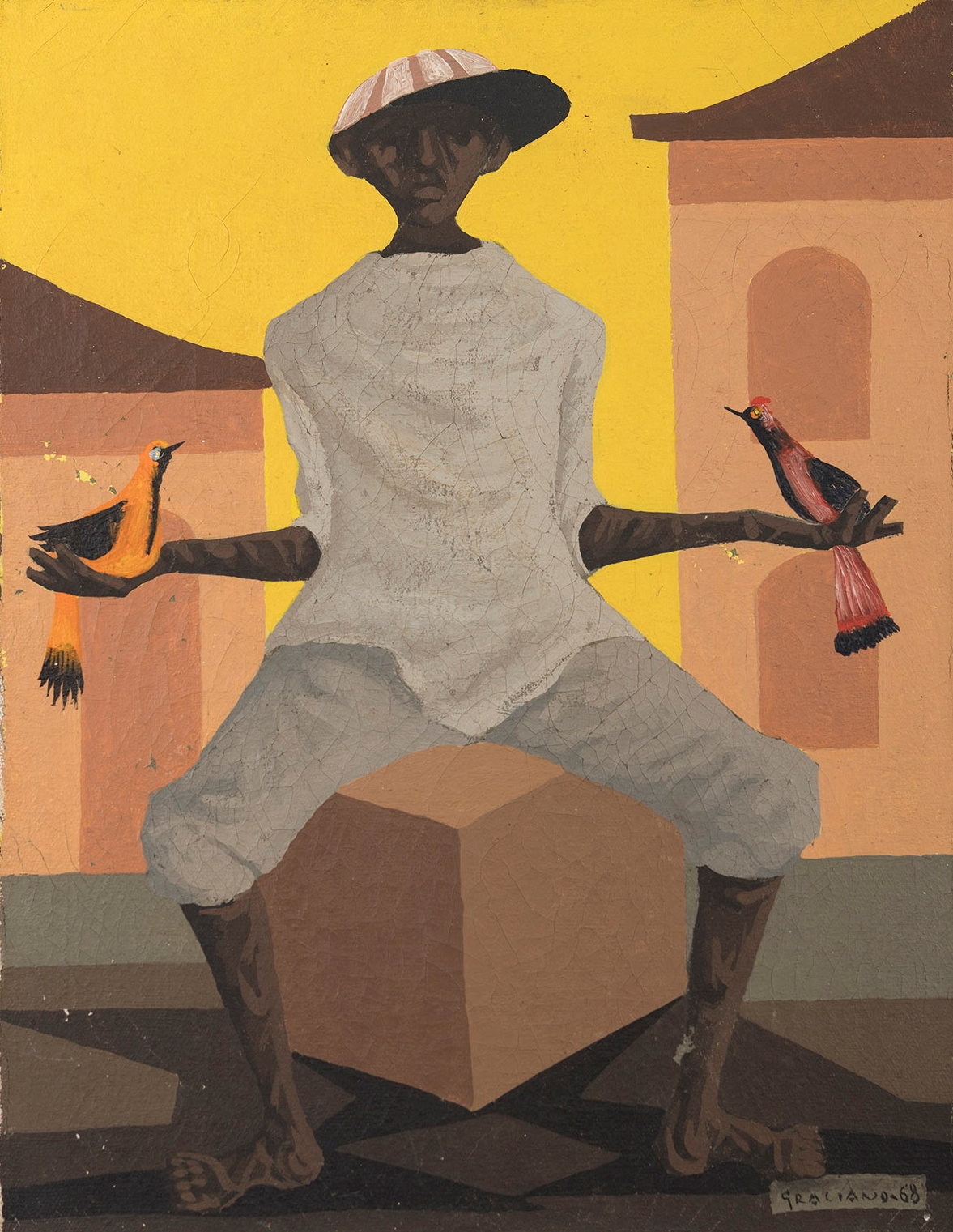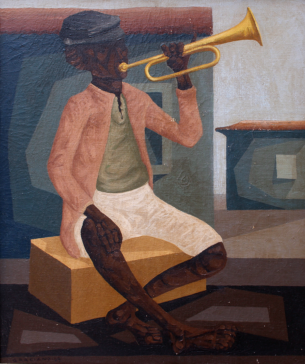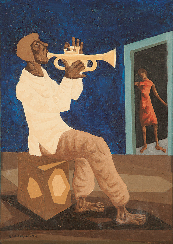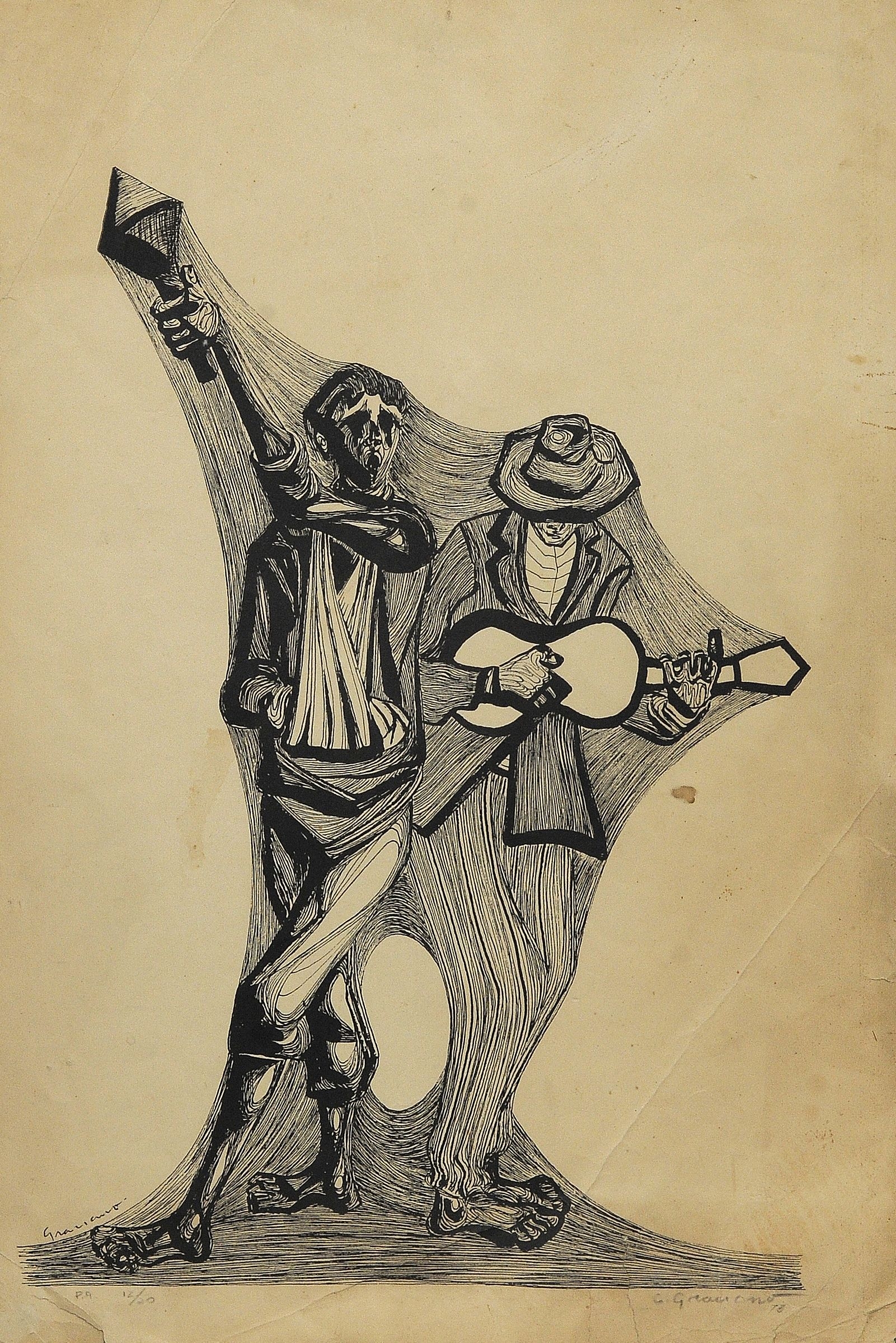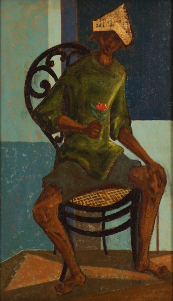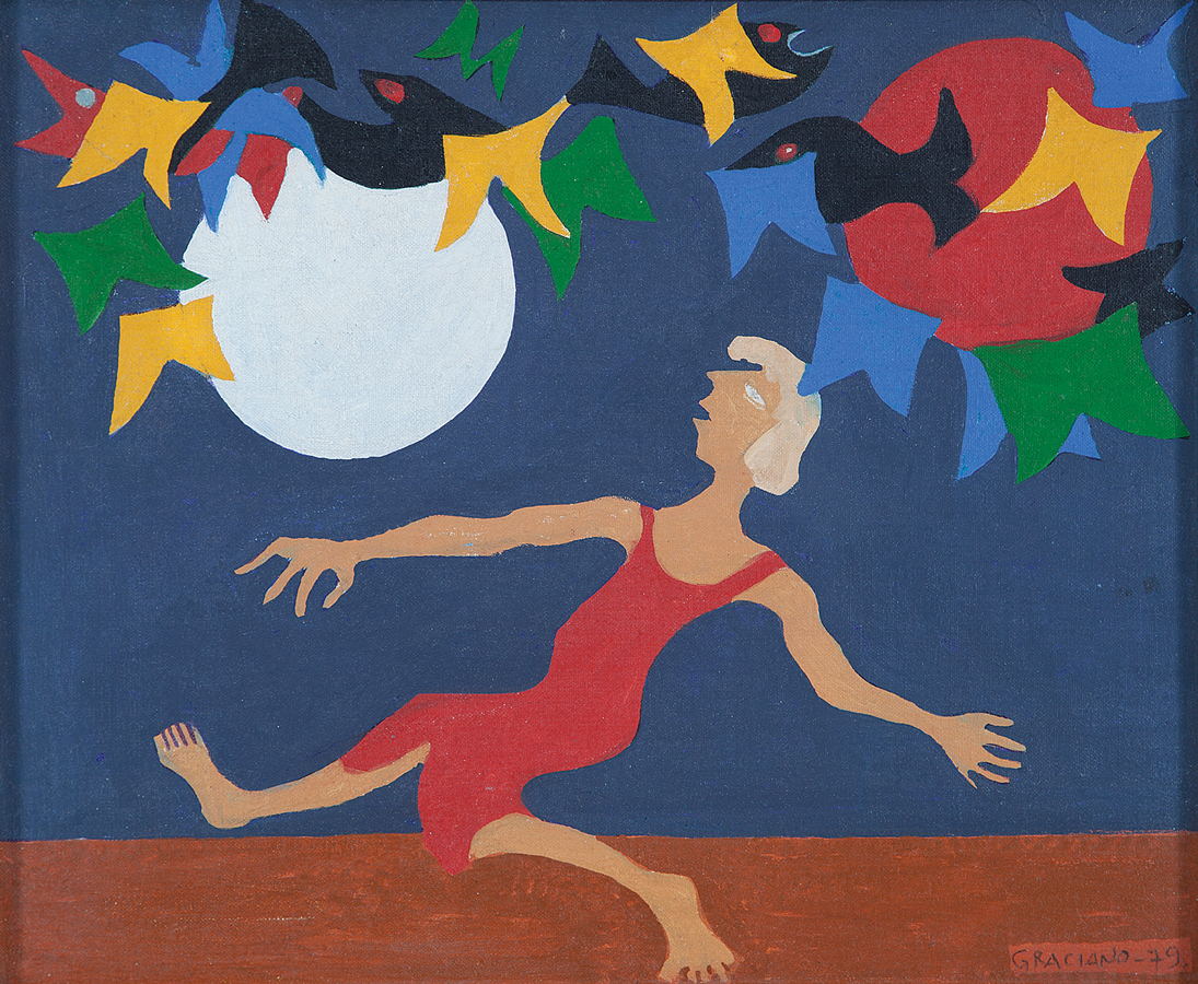Clóvis Graciano (Araras SP 1907 - São Paulo SP 1988). Pintor, desenhista, cenógrafo, gravador, ilustrador. Em 1934, muda-se para a cidade de São Paulo onde realiza estudos com o pintor Waldemar da Costa (1904 - 1982), entre 1935 e 1937. Com Francisco Rebolo, Mario Zanini e Bonadei, integra o Grupo Santa Helena, em 1937. Na Escola Paulista de Belas Artes freqüenta como aluno ouvinte o curso de desenho até 1938. Em 1939 é eleito presidente da Família Artística Paulista-FAP. Em 1941, realiza sua primeira exposição individual e em 1948 é sócio-fundador do Museu de Arte Moderna de São Paulo-MAM/SP. Recebe prêmio no Salão Nacional de Belas Artes de viagem á Europa, em 1949. Estuda gravura e pintura mural por dois anos em Paris. Nos anos 1950 dedica-se especialmente a pintura mural. Transita pela ilustração de obras literárias, como Cancioneiro da Bahia de Dorival Caymmi e Terras do Sem Fim de Jorge Amado. Assume a direção da Pinacoteca do Estado de São Paulo, em 1971. Entre 1976 e 1978 é adido cultural em Paris. A obra de Clóvis Graciano caracteriza-se pela fidelidade ao figurativismo onde predominam os temas sociais. Produz paisagens e naturezas- mortas, cuja particularidade reside na singularidade do corte, no grafismo sintético e na rapidez da execução. Sua arte apresenta influência de Candido Portinari, uma vez que recorre ao pós-cubismo, à superposição de planos, e desconstrói a perspectiva por meio da deformação das figuras, especialmente de mãos e pés. A arte de Clóvis Graciano, principalmente a produção dos anos 1940, é marcada por temas sociais e pela figura humana, nas quais figuram os retirantes. Também produziu auto-retratos que expressam pouca tensão, mas apresentam variações psicológicas. Nos anos 1950 a produção é voltada à pintura mural como Arsmistício de Iperoig, na Fundação Armando Álvares Penteado-FAAP, entre outros, cuja inspiração advém do Renascimento.