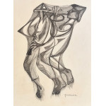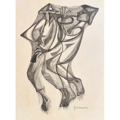 Clóvis Graciano - Figuras - OSC - 86 x 70 cm - Acid, 1954 Clóvis Graciano cria aqui uma composição emblemática com figuras monumentais e volumes geométricos. O uso de tons terrosos e contrastes fortes reflete sua preocupação com temas humanos e coletivos. A homenagem a Ruth de Souza confere valor histórico adicional à obra, associando-a a um contexto social e cultural relevante.