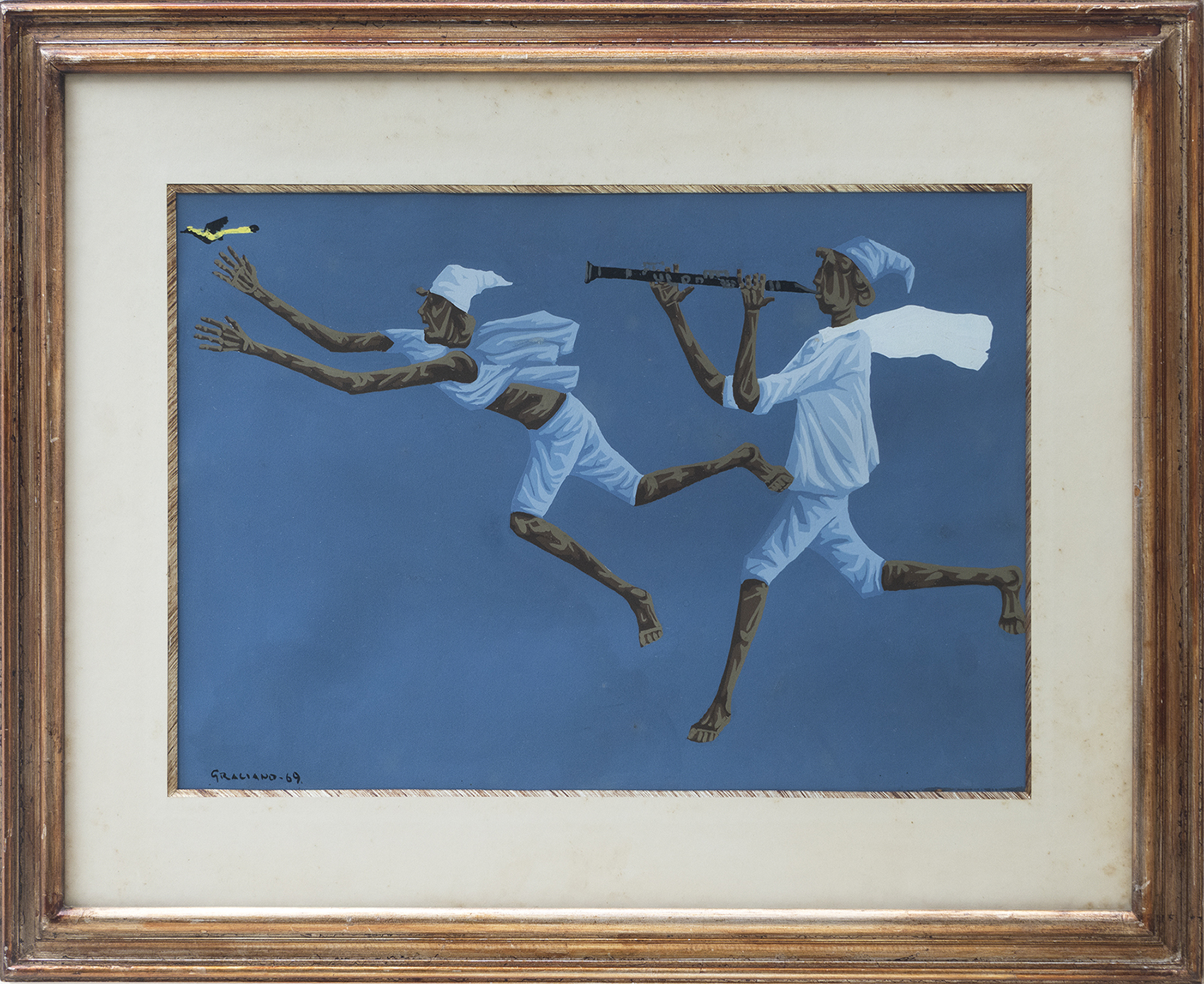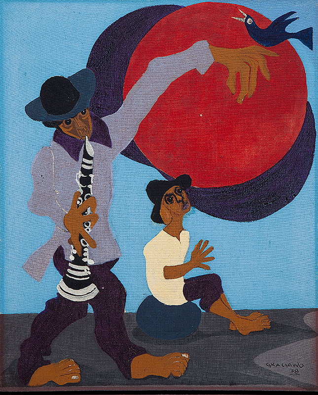 Clóvis Graciano (Araras SP 1907 - São Paulo SP 1988). Pintor, desenhista, cenógrafo, gravador, ilustrador. Em 1934, muda-se para a cidade de São Paulo onde realiza estudos com o pintor Waldemar da Costa (1904 - 1982), entre 1935 e 1937. Com Francisco Rebolo, Mario Zanini e Bonadei, integra o Grupo Santa Helena, em 1937. Na Escola Paulista de Belas Artes freqüenta como aluno ouvinte o curso de desenho até 1938. Em 1939 é eleito presidente da Família Artística Paulista-FAP. Em 1941, realiza sua primeira exposição individual e em 1948 é sócio-fundador do Museu de Arte Moderna de São Paulo-MAM/SP. Recebe prêmio no Salão Nacional de Belas Artes de viagem á Europa, em 1949. Estuda gravura e pintura mural por dois anos em Paris. Nos anos 1950 dedica-se especialmente a pintura mural. Transita pela ilustração de obras literárias, como Cancioneiro da Bahia de Dorival Caymmi e Terras do Sem Fim de Jorge Amado. Assume a direção da Pinacoteca do Estado de São Paulo, em 1971. Entre 1976 e 1978 é adido cultural em Paris. A obra de Clóvis Graciano caracteriza-se pela fidelidade ao figurativismo onde predominam os temas sociais. Produz paisagens e naturezas- mortas, cuja particularidade reside na singularidade do corte, no grafismo sintético e na rapidez da execução. Sua arte apresenta influência de Candido Portinari, uma vez que recorre ao pós-cubismo, à superposição de planos, e desconstrói a perspectiva por meio da deformação das figuras, especialmente de mãos e pés. A arte de Clóvis Graciano, principalmente a produção dos anos 1940, é marcada por temas sociais e pela figura humana, nas quais figuram os retirantes. Também produziu auto-retratos que expressam pouca tensão, mas apresentam variações psicológicas. Nos anos 1950 a produção é voltada à pintura mural como Arsmistício de Iperoig, na Fundação Armando Álvares Penteado-FAAP, entre outros, cuja inspiração advém do Renascimento.