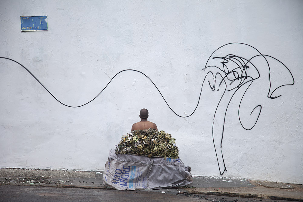 O andar é lento: um homem sem camisa aparece no canto direito de uma tela. Um muro de tijolos coberto por pichações é cenário para seu corpo negro.