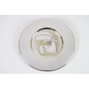 DANILO DI PRETE - desenho gravado sobre prato de metal prateado Cristofle - assinado - 31 cm diâm - apresenta prateado gasto e pequeno amassado na borda.