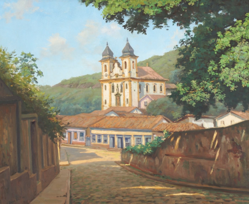 EDGAR WALTER (1917- 1994) Ponte de pedra, década de 1940. óleo s/ tela - MEDIDAS: 65 x 54 cm /86 x 75 cm. Assinado canto inferior esquerdo. BIOGRAFIA:Sobre: Nasceu em Nova Lima em 1917, e faleceu aos 77 anos em Teresópolis, em 1994. Filho do minerador inglês Frederick James Simmons, e da Ouro Pretana Francisca Walter Hailbulth Simmons. Em 1935, apenas 18 anos, dedicou-se a dança, especificamente ao Balé Clássico, chegando ao cobiçado posto de primeiro bailarino do Teatro Municipal do Rio Janeiro, o maior posto que alguém poderia almejar no Brasil. Nesta época ainda fez sapateado e dança moderna trabalhando, como auxilio na forma de sustento, nos grandiosos musicais do Cassino da Urca, Quitandinha e outros. Um dia, estressado do trabalho contábil que exercia no agitado centro do Rio, ao passar em frente a Igreja da Candelária resolve entrar para escutar o órgão, neste momento vê uma criança, um coroinha, deitado sobre um degrau de mármore com uma fresta de luz sobre seu rosto. Essa cena, como uma luz divina, o faz optar naquele momento por ser pintor. Abandonou a dança e o trabalho, de modo súbito, dedicando-se a pintura com Oswaldo Teixeira, na Escola Nacional de Belas artes. Como um “Faça-se a Luz” nasce, naquele momento o pintor que lidaria como ninguém com raios e frestas de luz. Apesar do retrato e cenas de gênero, sua especialidade maior tornou-se a paisagem e, embora tenha pintado Inglaterra, Itália, França e Austrália, a Minas Gerais da Ouro preto de sua infância continuou a ser sua maior fonte de inspiração. No Rio de Janeiro frequentemente ia ao Corcovado pintar a belíssima estrada das Paineiras, que tornou-se seu principal tema. Tamanha assiduidade, que tinha uma espécie de resguardo do atelier no Hotel Paineiras, onde guardava seus equipamentos e fazia suas refeições. Aos 36 anos, em 1953, conquistou pela primeira vez, o cobiçado Prêmio Viagem ao estrangeiro do LIX Salão Nacional de Belas artes e, também o premio aquisição de outra obra - algo muito raro. Seguiu primeiro para Tavistock, cidade de seu pai, na Inglaterra, posteriormente para Milão, Roma, Florença, Veneza e Paris, cidades onde convive com outros artistas premiados do Salão: Iberê Camargo em 1947, Clovis Graciano em 1948, Bustamante Sá em 1949, Armando Pacheco em 1950, Aurelio d'Alincourt e Fernando P. em 1951, Sylvio Pinto em 1952. No Globo noticia: "Foi um exemplo de disposição para a vitória da arte..." "... aos 18 anos escapou do curso de contabilidade e chegou ao cobiçado posto de bailarino do Teatro Municipal do Rio Janeiro; ninguém dançava melhor que ele, mas largou tudo pelo desejo de ser pintor." Com apenas 44 anos, a partir de 1961, devido a sua altíssima qualidade técnica é mais convidado, para os Salões como hors-concours e membro júri. Foi o que aconteceu no Primeiro Salão Fluminense de Belas Artes. Em 1962, participou da criação do Instituto de Belas Artes do Rio de Janeiro. Em 1965 é homenageado como hors-concours do festejado Salão do IV Centenário do Rio Janeiro. No Salão da Sociedade Brasileira de Belas Artes recebeu seu segundo Prêmio Viagem ao Estrangeiro. Conquistou ainda, a Medalha de Ouro - Grande Prêmio Governador do Estado do Rio de Janeiro. Nas comemorações dos 120 anos de JF, O museu Mariano Procópio realizou uma exposição comemorativa - individual de Edgar. Em 1974, hors-concours, recebeu a “Medalha especial Antônio Parreiras” da Associação Artística Baptista da Costa. Em 1975, hors-concours, a Sociedade dos Artistas Nacionais confere-lhe a Medalha de Honra, por sua Participação Especial no Salão. Em 1976, hors-concours, foi o Convidado Especial do Primeiro Salão de Artes Plásticas da Associação Brasileira de Desenho e de Artes Visuais. Em 1977, recebeu Menção Especial de Honra no Primeiro Salão de Paisagem organizado pela Sociedade Brasileira de Belas Artes. Em 1978, a Instituição Conexão Brasil-Israel convidou Edgar, como hors-concours, para promover o Salão da Associação Brasileira de Desenho e Artes Visuais no Clube Hebraica. Em 1985, volta mais uma vez a concorrer, desta vez no Salão da Sociedade Petropolitana de Pintores, um importante salão realizado no Quitandinha Clube e, recebe seu terceiro Prêmio de Viagem ao Estrangeiro e viaja à Alemanha. Outras premiações acumulam-se: Medalha de Ouro da Prefeitura Municipal do Rio de Janeiro, Medalha de Ouro da Associação Brasileira de Desenho e Artes Visuais de 1989 entre muitas outras. Embora Edgar tenha sido um acadêmico, foi localizado em um documento de 1979 em que o cita até como professor dos Cursos de Verão, da Escola de Artes Visuais do Parque Laje. Segundo Vitor Braga, autor do livro de Edgar Walter: “Oswaldo Teixeira é uma espécie de hífen; como discípulo de Baptista da Costa, Oswaldo soube transmitir a Edgar toda a força emotiva, técnica e pictórica de seu amigo mais experimentado.”