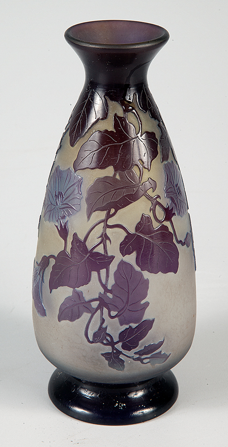 ÉMILE GALLÉ (1846–1904) – Grande vaso em vidro artístico acidado com motivos vegetais, produção Art Nouveau francesa, França, séc. XIX/XX; Gallé foi mestre vidraceiro francês e principal expoente da Art Nouveau, fundador da Escola de Nancy. Dimensões: alt. 75 cm, diâm. 23 cm.