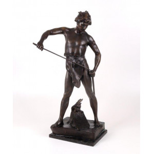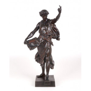 ÉMILE LOUIS PICAULT. "A PRES LA MOISSON DES LAURIES LOLIVIER RENAITRA PLUS REAU". Escultura em bronze fundido e com patina escura, sobre base de mármore. Émile Louis Picault (1833–1915) foi um escultor francês muito conhecido por suas obras de caráter alegórico, mitológico e patriótico. Ele foi bastante ativo durante o final do século XIX e início do século XX, produzindo uma grande quantidade de esculturas em bronze que se tornaram populares tanto na França quanto internacionalmente. Picault gostava de representar figuras da mitologia grega e romana, além de conceitos como a justiça, a vitória, o trabalho e o heroísmo. Sua escultura é detalhada, com grande atenção à anatomia e ao movimento, seguindo as tradições acadêmicas da época. A maioria de suas esculturas foi fundida em bronze, e muitas foram produzidas em versões menores para decoração doméstica. Exemplos de obras conhecidas: Le Génie du progrès (O Gênio do Progresso) Gloria Victis (Glória aos Vencidos) – título que também aparece em obras de outros artistas, mas foi explorado por Picault. Representações de deuses como Hermes (Mercúrio), Atena (Minerva), e outras figuras mitológicas. 72 cm alt, 31 x 24 cm.