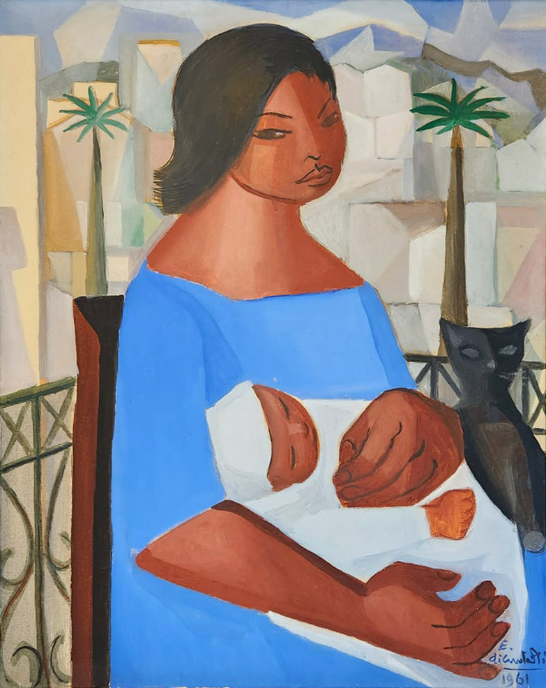 Reconhecimento internacional Passou a combater abertamente o abstracionismo através de conferências e artigos. Viajou para o Uruguai e Argentina, expondo em Buenos Aires. Conheceu Zuília, que se tornou uma de suas modelos preferidas. Em 1946, retornou a Paris em busca dos quadros desaparecidos; nesse mesmo ano, expôs no Rio de Janeiro, na Associação Brasileira de Imprensa. Ilustrou livros de Vinícius de Morais, Álvares de Azevedo e Jorge Amado. Em 1947, entrou em crise com Noêmia Mourão - "uma personalidade que se basta, uma artista, e de temperamento muito complicado...". Participou com Anita Malfatti e Lasar Segall do júri de premiação de pintura do Grupo dos 19. Seguiu criticando o abstracionismo. Expôs na Cidade do México em 1949. Mural de Di Cavalcanti na fachada do Edifício Triângulo, em São Paulo, no Brasil. O edifício foi projetado em 1955 por Oscar Niemeyer. Foi convidado e participou da I Bienal Internacional de Arte de São Paulo em 1951. Fez uma doação generosa ao Museu de Arte Moderna de São Paulo, constituída de mais de quinhentos desenhos. Beryl passou a ser sua companheira. Negou-se a participar da Bienal de Veneza. Recebeu a láurea de melhor pintor nacional na II Bienal de São Paulo, prêmio dividido com Alfredo Volpi. Em 1954, o Museu de Arte Moderna do Rio de Janeiro realizou exposição retrospectiva de seus trabalhos. Fez novas exposições na Bacia do Prata, retornando a Montevidéu e Buenos Aires. Publicou "Viagem de minha vida". 1956 foi o ano de sua participação na Bienal de Veneza. Recebeu o I Prêmio da Mostra Internacional de Arte Sacra de Trieste. Adotou Elizabeth, filha de Beryl. Seus trabalhos fizeram parte de exposição itinerante por países europeus. Recebeu proposta de Oscar Niemeyer para a criação de imagens para tapeçaria a ser instalada no Palácio da Alvorada; também pintou as estações para a via-sacra da Catedral Metropolitana de Nossa Senhora Aparecida, em Brasília.