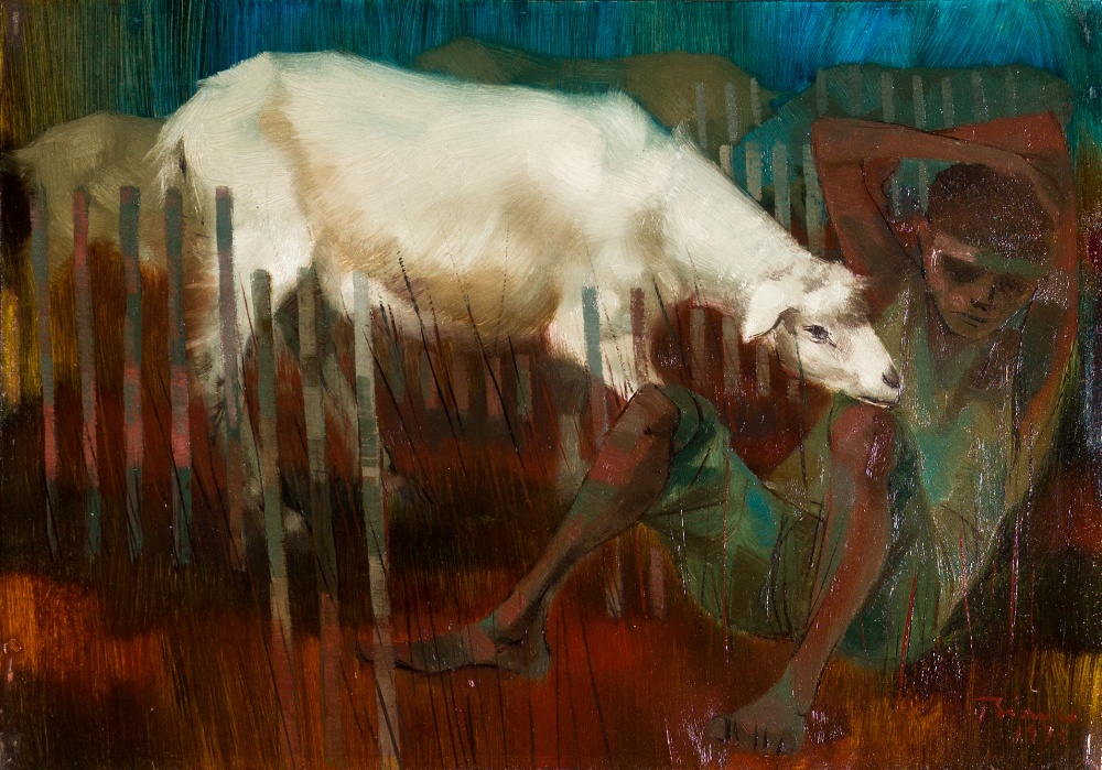 Enrico Bianco - Madona no trigal - 50 x 40 cm - Óleo sobre eucatex - Assinatura canto inferior direito e Data 1983 - No verso apresenta etiqueta da Galeria Contorno
