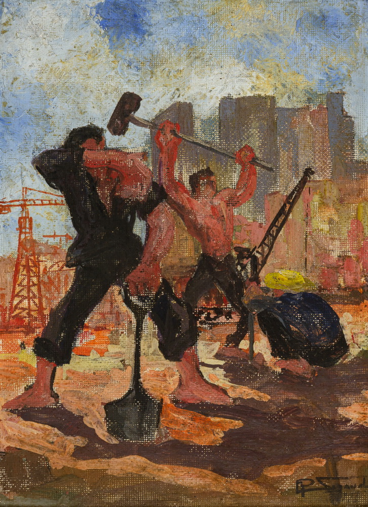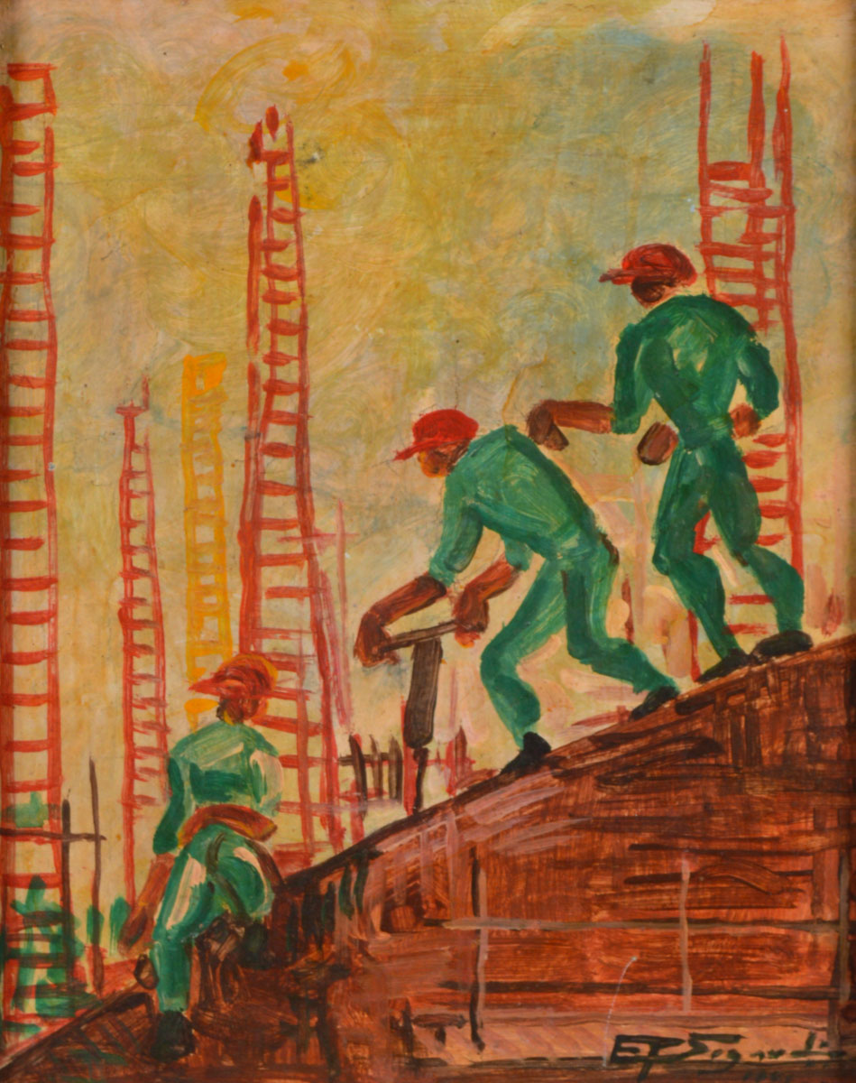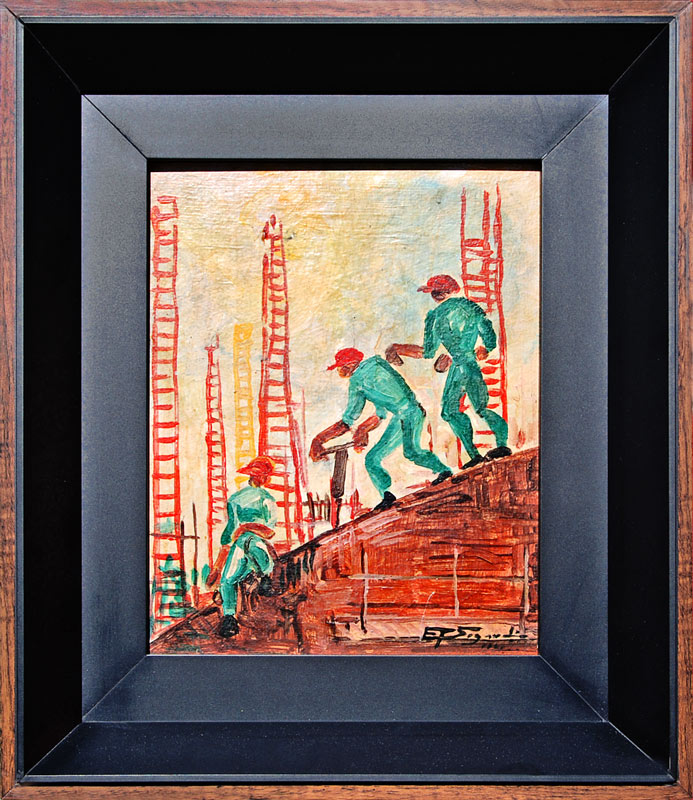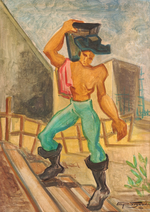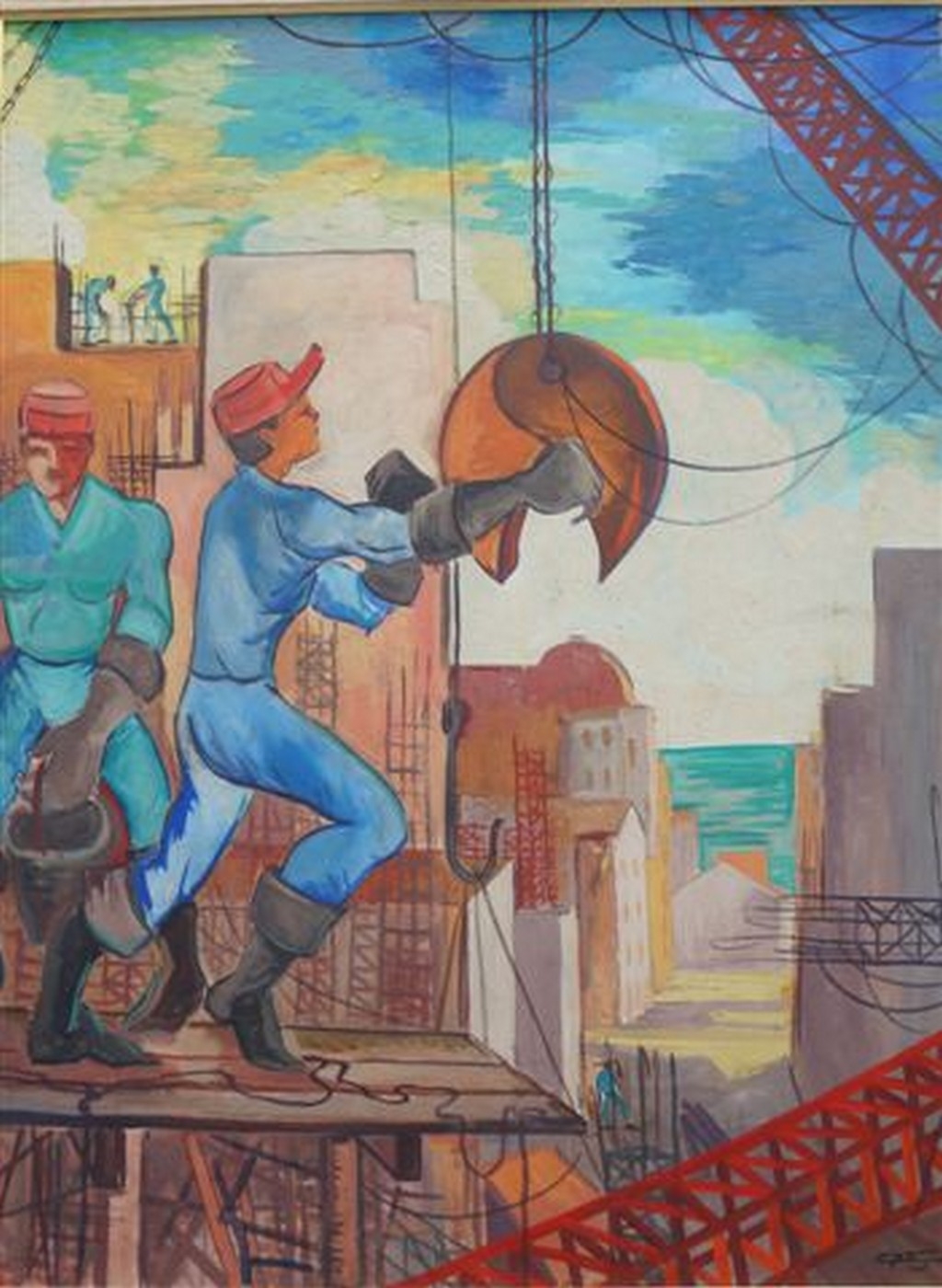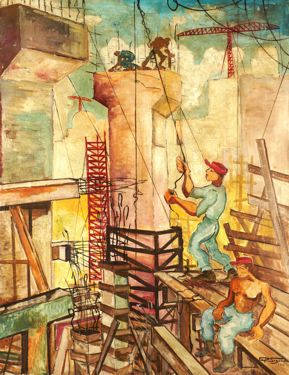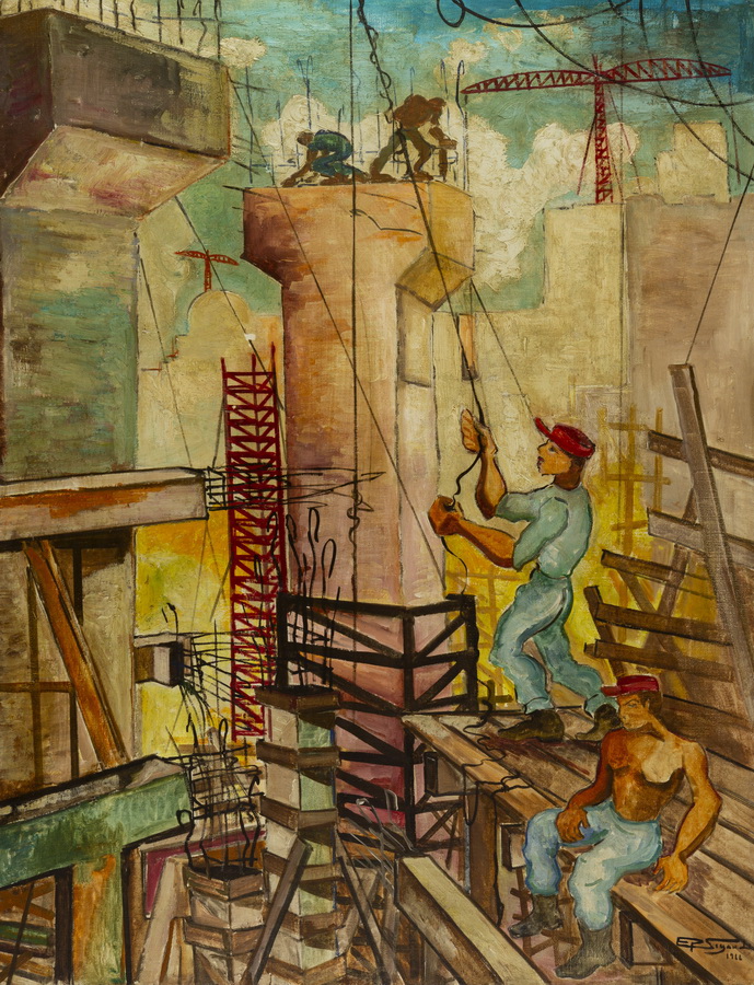 Nacionalista, influenciado pelo muralismo mexicano, usa a dramaticidade do expressionismo, reforçado de ângulos que ostensivamente deformam os personagens, para pintar e exaltar uma categoria que se arrisca muito e recebe pouco - os trabalhadores da construção civil.