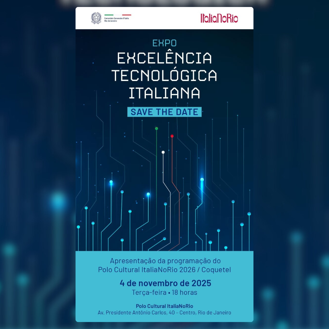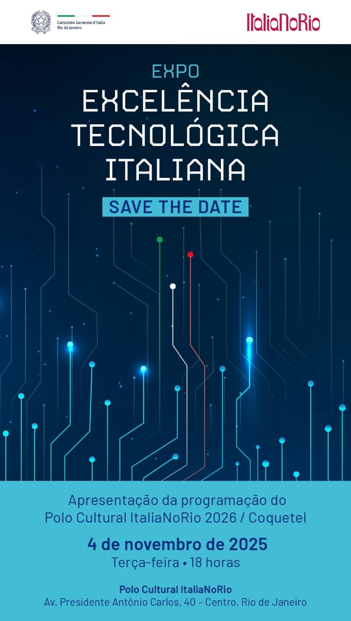 Mostra de inovação tecnológica italiana organizada no Polo Cultural ItaliaNoRio, no Rio de Janeiro, a “Expo Excelência Tecnológica Italiana” será inaugurada no dia 4 de novembro, às 18h, no térreo do espaço. Em paralelo à feira OTC Brazil - Offshore Technology Conference, o evento promove a excelência italiana em tecnologia , engenharia , energia e sustentabilidade. Até o dia 28 de novembro, estarão em exibição modelos, protótipos, telas interativas e apresentações multimídia. Maquetes tecnológicas, experiências de realidade virtual, telas e apresentações em vídeo e soluções em engenharia serão mostrados, gratuitamente, aos visitantes. Entre as empresas participantes e projetos estão: TIM/corner de realidade virtual; SAIPEM/maquete de submarino drone; TENARIS/amostra de tubo + TV com vídeo; TERNIUM/central de monitoramento em painel de led; VALVITALIA/maquete de válvula; AZIMUT/maquete de iate; LEONARDO DO BRASIL/maquete de helicóptero.