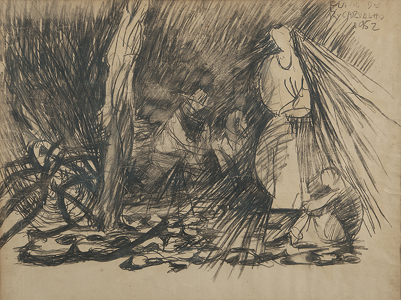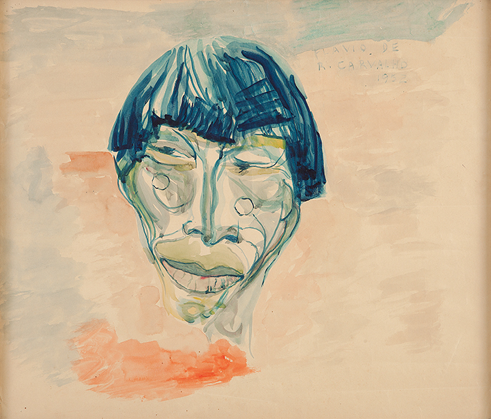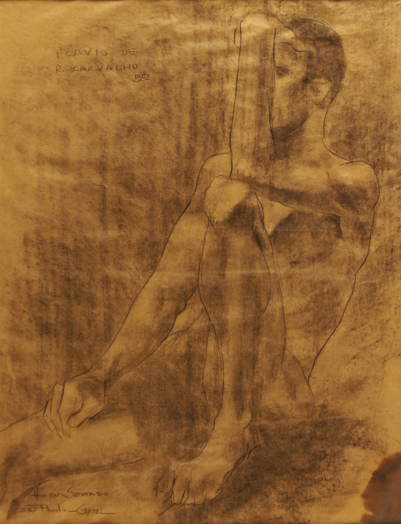 Flávio Resende de Carvalho (Amparo da Barra Mansa, RJ, 1899 - Valinhos, SP, 1973). Pintor, desenhista, arquiteto, cenógrafo, decorador, escritor, teatrólogo, engenheiro. Muda-se com a família para São Paulo em 1900. Em 1911, passa a estudar em Paris e, três anos depois, na Inglaterra, onde, em Newcastle, em 1918, inicia o curso de engenharia civil no Armstrong College da Universidade de Durham e ingressa no curso noturno de artes da King Edward the Seventh School of Fine Arts. Conclui o curso de engenharia em 1922 e nesse ano volta a residir em São Paulo, onde chega logo após a realização da Semana de Arte Moderna. Desenvolve atividades em várias áreas artísticas e intelectuais, freqüentemente de forma inovadora e provocativa. Participa de concursos públicos de arquitetura, como para o Palácio do Governo do Estado de São Paulo, em 1927, e, embora não tenha sido vencedor em nenhum deles, seus projetos são considerados pioneiros da arquitetura moderna no país. Em 1931, realiza o polêmico evento Experiência nº 2, em que caminha com boné na cabeça, de forma desafiadora, em sentido contrário ao de uma procissão de Corpus Christi e é bastante hostilizado. Em 1932, abre um ateliê, onde funda o Clube dos Artistas Modernos - CAM, com Antonio Gomide (1895-1967), Di Cavalcanti (1897-1976) e Carlos Prado (1908-1992). No ano seguinte, cria o Teatro da Experiência e encena o Bailado do Deus Morto - espetáculo de teatro-dança de sua autoria com estética inovadora, para o qual cria cenografia e figurino e que tem, em sua maioria, atores negros. Realiza, em 1934, a sua primeira exposição individual. A mostra é fechada pela polícia sob alegação de atentado ao pudor, e reaberta alguns dias depois, por ordem judicial. Em 1947, realiza os desenhos da Série Trágica, em que registra a morte da própria mãe. Após publicar, em 1956, uma série de artigos sobre moda na coluna Casa, Homem, Paisagem - em que escreve sobretudo a respeito de arquitetura e urbanismo -, que mantém no Diário de São Paulo, apresenta-se - e causa escândalo - em passeata pelo centro da cidade de São Paulo com o New Look, um traje tropical masculino por ele desenvolvido e que consiste de saia e blusa de mangas curtas e folgadas.