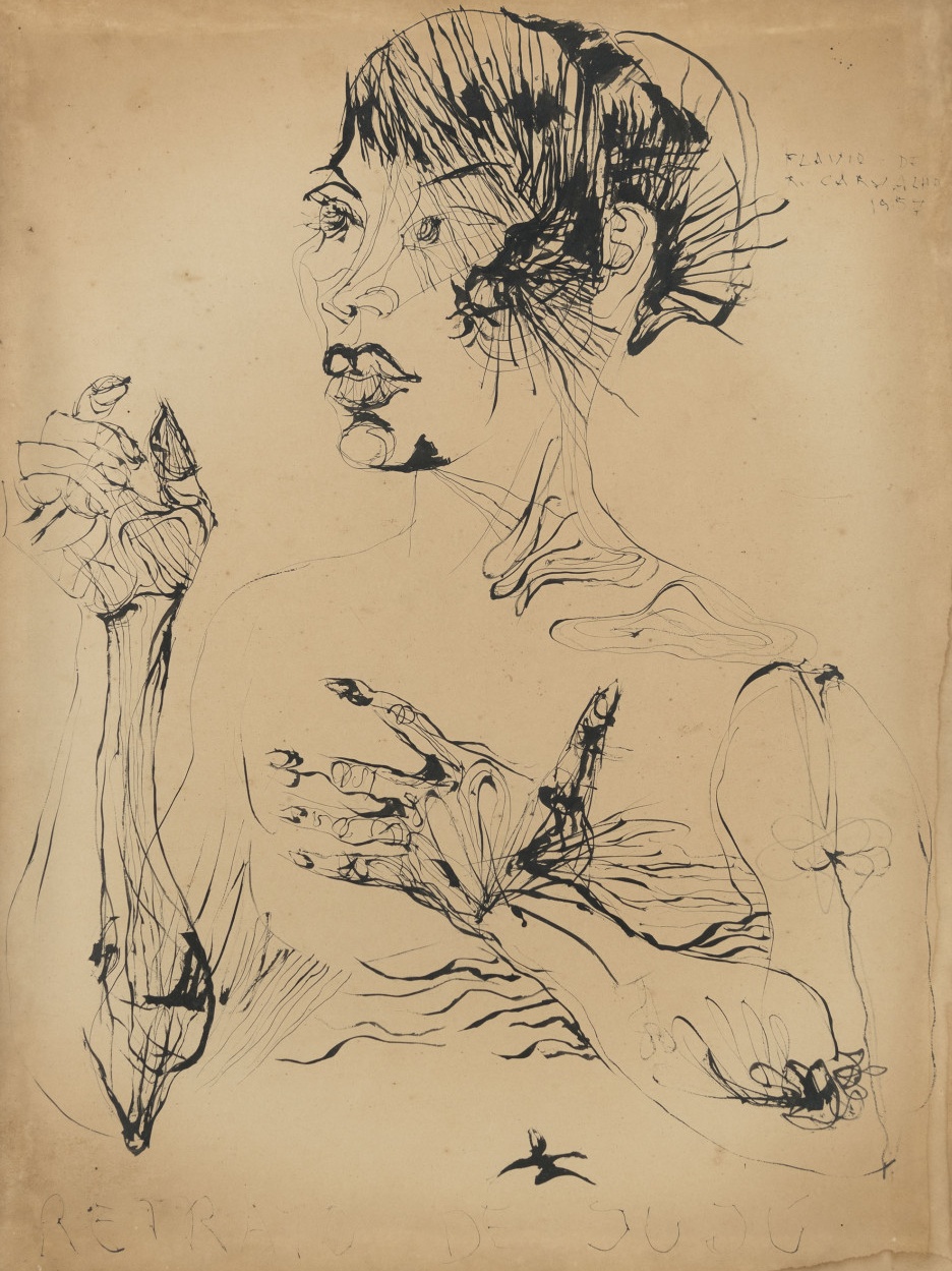 Flávio Resende de Carvalho (Amparo da Barra Mansa, RJ, 1899 - Valinhos, SP, 1973). Pintor, desenhista, arquiteto, cenógrafo, decorador, escritor, teatrólogo, engenheiro. Muda-se com a família para São Paulo em 1900. Em 1911, passa a estudar em Paris e, três anos depois, na Inglaterra, onde, em Newcastle, em 1918, inicia o curso de engenharia civil no Armstrong College da Universidade de Durham e ingressa no curso noturno de artes da King Edward the Seventh School of Fine Arts. Conclui o curso de engenharia em 1922 e nesse ano volta a residir em São Paulo, onde chega logo após a realização da Semana de Arte Moderna. Desenvolve atividades em várias áreas artísticas e intelectuais, freqüentemente de forma inovadora e provocativa. Participa de concursos públicos de arquitetura, como para o Palácio do Governo do Estado de São Paulo, em 1927, e, embora não tenha sido vencedor em nenhum deles, seus projetos são considerados pioneiros da arquitetura moderna no país. Em 1931, realiza o polêmico evento Experiência nº 2, em que caminha com boné na cabeça, de forma desafiadora, em sentido contrário ao de uma procissão de Corpus Christi e é bastante hostilizado. Em 1932, abre um ateliê, onde funda o Clube dos Artistas Modernos - CAM, com Antonio Gomide (1895-1967), Di Cavalcanti (1897-1976) e Carlos Prado (1908-1992). No ano seguinte, cria o Teatro da Experiência e encena o Bailado do Deus Morto - espetáculo de teatro-dança de sua autoria com estética inovadora, para o qual cria cenografia e figurino e que tem, em sua maioria, atores negros. Realiza, em 1934, a sua primeira exposição individual. A mostra é fechada pela polícia sob alegação de atentado ao pudor, e reaberta alguns dias depois, por ordem judicial. Em 1947, realiza os desenhos da Série Trágica, em que registra a morte da própria mãe. Após publicar, em 1956, uma série de artigos sobre moda na coluna Casa, Homem, Paisagem - em que escreve sobretudo a respeito de arquitetura e urbanismo -, que mantém no Diário de São Paulo, apresenta-se - e causa escândalo - em passeata pelo centro da cidade de São Paulo com o New Look, um traje tropical masculino por ele desenvolvido e que consiste de saia e blusa de mangas curtas e folgadas.