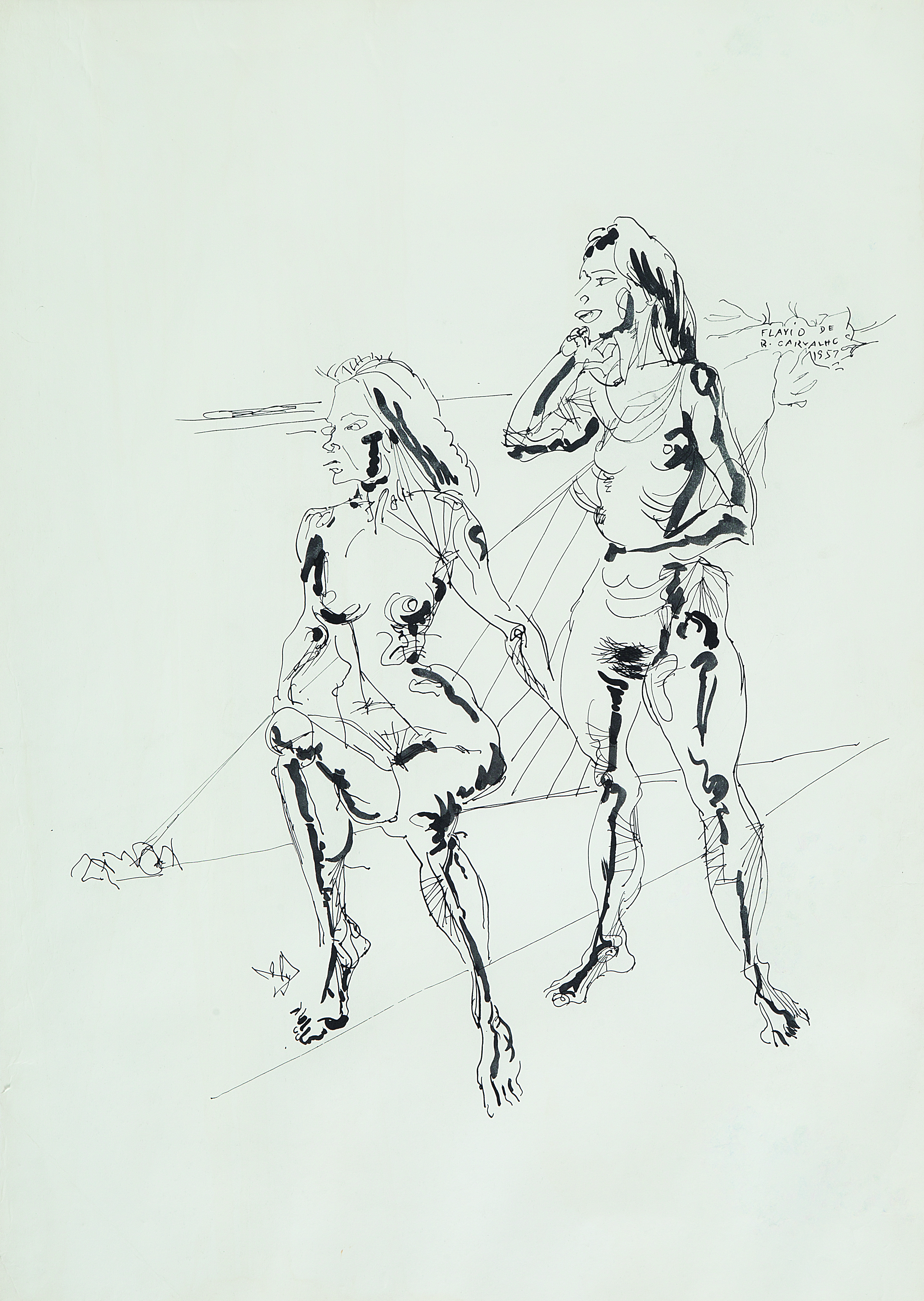 Flávio Resende de Carvalho (Amparo da Barra Mansa, RJ, 1899 - Valinhos, SP, 1973). Pintor, desenhista, arquiteto, cenógrafo, decorador, escritor, teatrólogo, engenheiro. Muda-se com a família para São Paulo em 1900. Em 1911, passa a estudar em Paris e, três anos depois, na Inglaterra, onde, em Newcastle, em 1918, inicia o curso de engenharia civil no Armstrong College da Universidade de Durham e ingressa no curso noturno de artes da King Edward the Seventh School of Fine Arts. Conclui o curso de engenharia em 1922 e nesse ano volta a residir em São Paulo, onde chega logo após a realização da Semana de Arte Moderna. Desenvolve atividades em várias áreas artísticas e intelectuais, freqüentemente de forma inovadora e provocativa. Participa de concursos públicos de arquitetura, como para o Palácio do Governo do Estado de São Paulo, em 1927, e, embora não tenha sido vencedor em nenhum deles, seus projetos são considerados pioneiros da arquitetura moderna no país. Em 1931, realiza o polêmico evento Experiência nº 2, em que caminha com boné na cabeça, de forma desafiadora, em sentido contrário ao de uma procissão de Corpus Christi e é bastante hostilizado. Em 1932, abre um ateliê, onde funda o Clube dos Artistas Modernos - CAM, com Antonio Gomide (1895-1967), Di Cavalcanti (1897-1976) e Carlos Prado (1908-1992). No ano seguinte, cria o Teatro da Experiência e encena o Bailado do Deus Morto - espetáculo de teatro-dança de sua autoria com estética inovadora, para o qual cria cenografia e figurino e que tem, em sua maioria, atores negros. Realiza, em 1934, a sua primeira exposição individual. A mostra é fechada pela polícia sob alegação de atentado ao pudor, e reaberta alguns dias depois, por ordem judicial. Em 1947, realiza os desenhos da Série Trágica, em que registra a morte da própria mãe. Após publicar, em 1956, uma série de artigos sobre moda na coluna Casa, Homem, Paisagem - em que escreve sobretudo a respeito de arquitetura e urbanismo -, que mantém no Diário de São Paulo, apresenta-se - e causa escândalo - em passeata pelo centro da cidade de São Paulo com o New Look, um traje tropical masculino por ele desenvolvido e que consiste de saia e blusa de mangas curtas e folgadas.