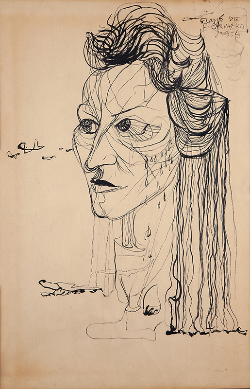 Flávio Resende de Carvalho (Amparo da Barra Mansa, RJ, 1899 - Valinhos, SP, 1973). Pintor, desenhista, arquiteto, cenógrafo, decorador, escritor, teatrólogo, engenheiro. Muda-se com a família para São Paulo em 1900. Em 1911, passa a estudar em Paris e, três anos depois, na Inglaterra, onde, em Newcastle, em 1918, inicia o curso de engenharia civil no Armstrong College da Universidade de Durham e ingressa no curso noturno de artes da King Edward the Seventh School of Fine Arts. Conclui o curso de engenharia em 1922 e nesse ano volta a residir em São Paulo, onde chega logo após a realização da Semana de Arte Moderna. Desenvolve atividades em várias áreas artísticas e intelectuais, freqüentemente de forma inovadora e provocativa. Participa de concursos públicos de arquitetura, como para o Palácio do Governo do Estado de São Paulo, em 1927, e, embora não tenha sido vencedor em nenhum deles, seus projetos são considerados pioneiros da arquitetura moderna no país. Em 1931, realiza o polêmico evento Experiência nº 2, em que caminha com boné na cabeça, de forma desafiadora, em sentido contrário ao de uma procissão de Corpus Christi e é bastante hostilizado. Em 1932, abre um ateliê, onde funda o Clube dos Artistas Modernos - CAM, com Antonio Gomide (1895-1967), Di Cavalcanti (1897-1976) e Carlos Prado (1908-1992). No ano seguinte, cria o Teatro da Experiência e encena o Bailado do Deus Morto - espetáculo de teatro-dança de sua autoria com estética inovadora, para o qual cria cenografia e figurino e que tem, em sua maioria, atores negros. Realiza, em 1934, a sua primeira exposição individual. A mostra é fechada pela polícia sob alegação de atentado ao pudor, e reaberta alguns dias depois, por ordem judicial. Em 1947, realiza os desenhos da Série Trágica, em que registra a morte da própria mãe. Após publicar, em 1956, uma série de artigos sobre moda na coluna Casa, Homem, Paisagem - em que escreve sobretudo a respeito de arquitetura e urbanismo -, que mantém no Diário de São Paulo, apresenta-se - e causa escândalo - em passeata pelo centro da cidade de São Paulo com o New Look, um traje tropical masculino por ele desenvolvido e que consiste de saia e blusa de mangas curtas e folgadas.
