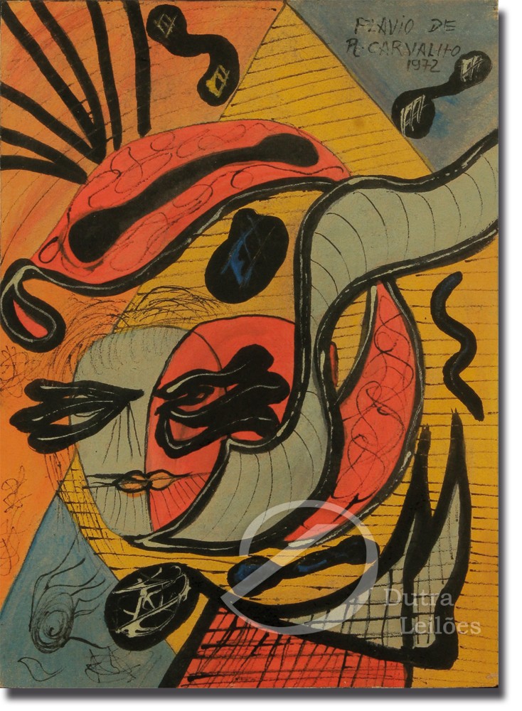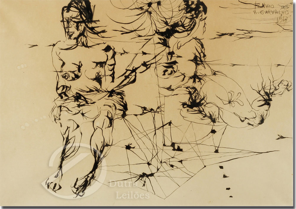 Flávio Resende de Carvalho (Amparo da Barra Mansa, RJ, 1899 - Valinhos, SP, 1973). Pintor, desenhista, arquiteto, cenógrafo, decorador, escritor, teatrólogo, engenheiro. Muda-se com a família para São Paulo em 1900. Em 1911, passa a estudar em Paris e, três anos depois, na Inglaterra, onde, em Newcastle, em 1918, inicia o curso de engenharia civil no Armstrong College da Universidade de Durham e ingressa no curso noturno de artes da King Edward the Seventh School of Fine Arts. Conclui o curso de engenharia em 1922 e nesse ano volta a residir em São Paulo, onde chega logo após a realização da Semana de Arte Moderna. Desenvolve atividades em várias áreas artísticas e intelectuais, freqüentemente de forma inovadora e provocativa. Participa de concursos públicos de arquitetura, como para o Palácio do Governo do Estado de São Paulo, em 1927, e, embora não tenha sido vencedor em nenhum deles, seus projetos são considerados pioneiros da arquitetura moderna no país. Em 1931, realiza o polêmico evento Experiência nº 2, em que caminha com boné na cabeça, de forma desafiadora, em sentido contrário ao de uma procissão de Corpus Christi e é bastante hostilizado. Em 1932, abre um ateliê, onde funda o Clube dos Artistas Modernos - CAM, com Antonio Gomide (1895-1967), Di Cavalcanti (1897-1976) e Carlos Prado (1908-1992). No ano seguinte, cria o Teatro da Experiência e encena o Bailado do Deus Morto - espetáculo de teatro-dança de sua autoria com estética inovadora, para o qual cria cenografia e figurino e que tem, em sua maioria, atores negros. Realiza, em 1934, a sua primeira exposição individual. A mostra é fechada pela polícia sob alegação de atentado ao pudor, e reaberta alguns dias depois, por ordem judicial. Em 1947, realiza os desenhos da Série Trágica, em que registra a morte da própria mãe. Após publicar, em 1956, uma série de artigos sobre moda na coluna Casa, Homem, Paisagem - em que escreve sobretudo a respeito de arquitetura e urbanismo -, que mantém no Diário de São Paulo, apresenta-se - e causa escândalo - em passeata pelo centro da cidade de São Paulo com o New Look, um traje tropical masculino por ele desenvolvido e que consiste de saia e blusa de mangas curtas e folgadas.