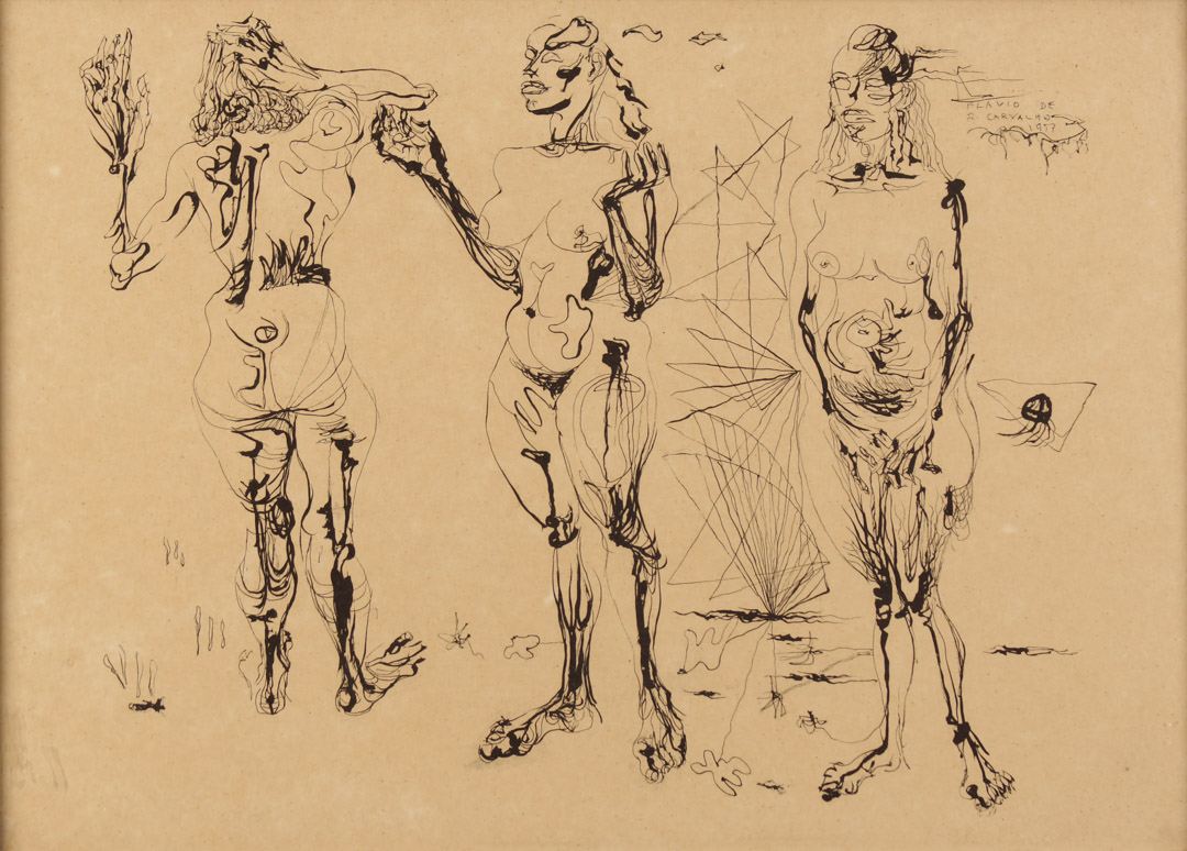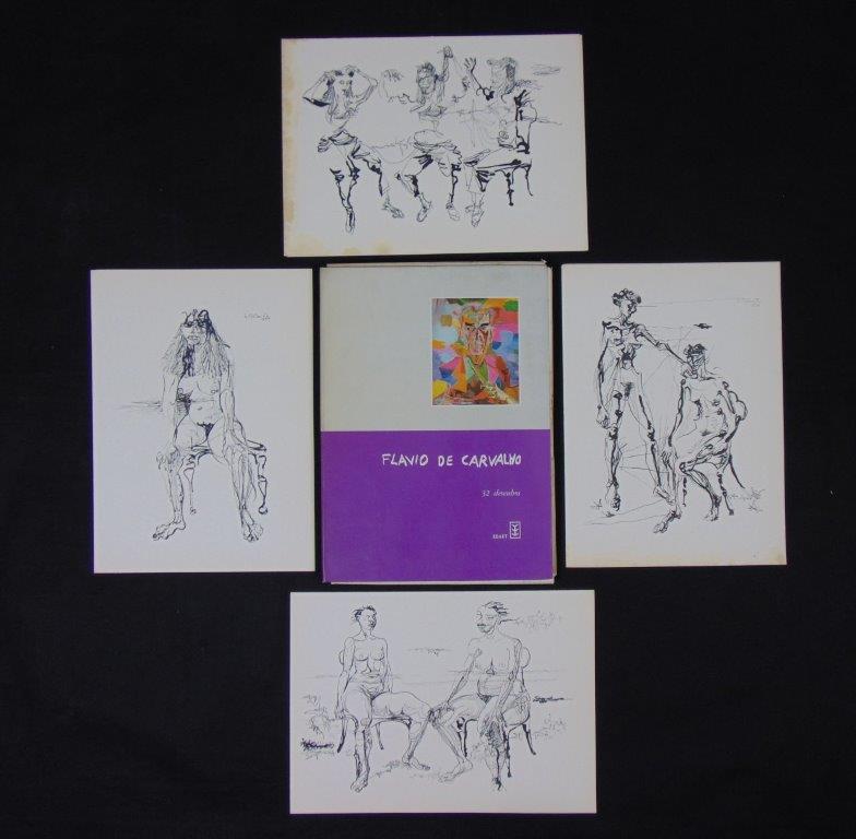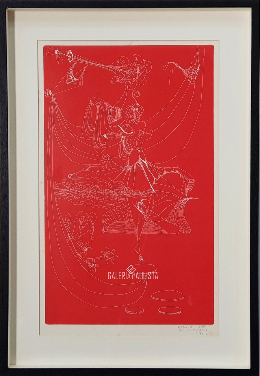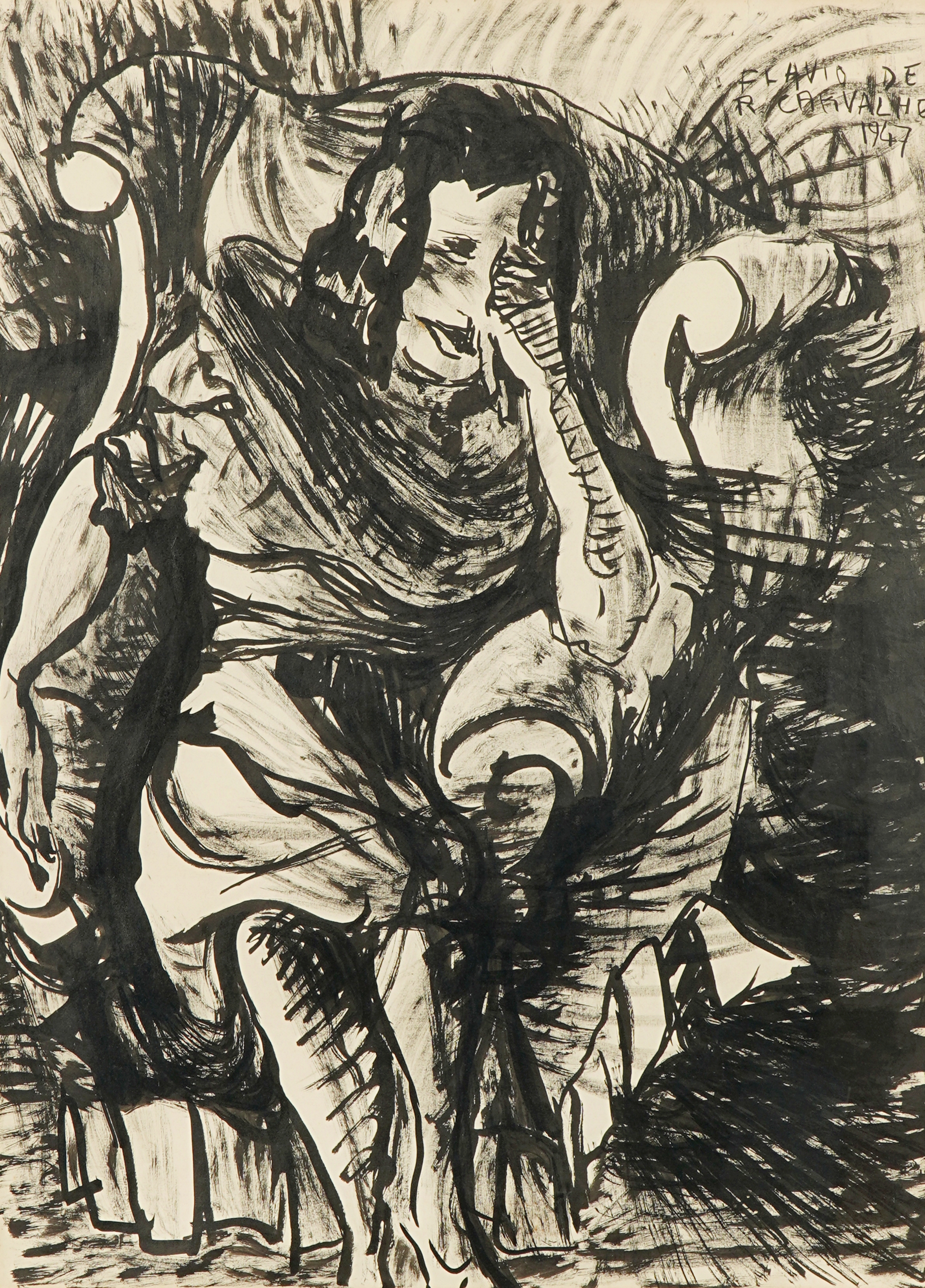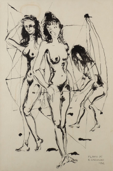 Flávio Resende de Carvalho (Amparo da Barra Mansa, RJ, 1899 - Valinhos, SP, 1973). Pintor, desenhista, arquiteto, cenógrafo, decorador, escritor, teatrólogo, engenheiro. Muda-se com a família para São Paulo em 1900. Em 1911, passa a estudar em Paris e, três anos depois, na Inglaterra, onde, em Newcastle, em 1918, inicia o curso de engenharia civil no Armstrong College da Universidade de Durham e ingressa no curso noturno de artes da King Edward the Seventh School of Fine Arts. Conclui o curso de engenharia em 1922 e nesse ano volta a residir em São Paulo, onde chega logo após a realização da Semana de Arte Moderna. Desenvolve atividades em várias áreas artísticas e intelectuais, freqüentemente de forma inovadora e provocativa. Participa de concursos públicos de arquitetura, como para o Palácio do Governo do Estado de São Paulo, em 1927, e, embora não tenha sido vencedor em nenhum deles, seus projetos são considerados pioneiros da arquitetura moderna no país. Em 1931, realiza o polêmico evento Experiência nº 2, em que caminha com boné na cabeça, de forma desafiadora, em sentido contrário ao de uma procissão de Corpus Christi e é bastante hostilizado. Em 1932, abre um ateliê, onde funda o Clube dos Artistas Modernos - CAM, com Antonio Gomide (1895-1967), Di Cavalcanti (1897-1976) e Carlos Prado (1908-1992). No ano seguinte, cria o Teatro da Experiência e encena o Bailado do Deus Morto - espetáculo de teatro-dança de sua autoria com estética inovadora, para o qual cria cenografia e figurino e que tem, em sua maioria, atores negros. Realiza, em 1934, a sua primeira exposição individual. A mostra é fechada pela polícia sob alegação de atentado ao pudor, e reaberta alguns dias depois, por ordem judicial. Em 1947, realiza os desenhos da Série Trágica, em que registra a morte da própria mãe. Após publicar, em 1956, uma série de artigos sobre moda na coluna Casa, Homem, Paisagem - em que escreve sobretudo a respeito de arquitetura e urbanismo -, que mantém no Diário de São Paulo, apresenta-se - e causa escândalo - em passeata pelo centro da cidade de São Paulo com o New Look, um traje tropical masculino por ele desenvolvido e que consiste de saia e blusa de mangas curtas e folgadas.