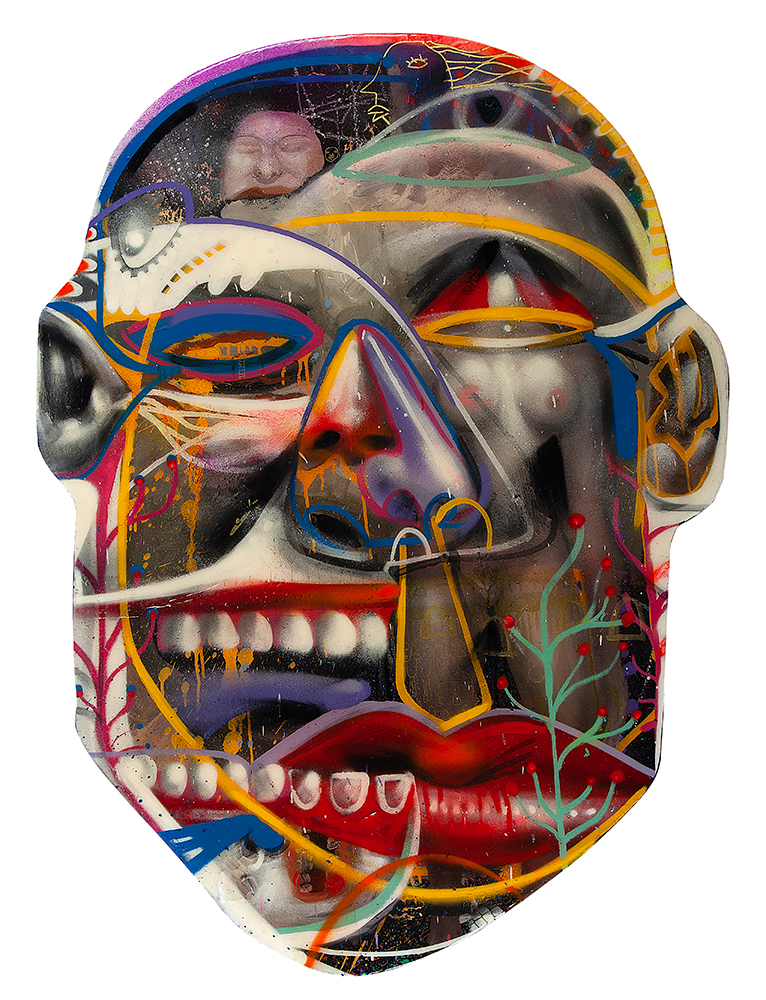 Utiliza diversas técnicas nas produções de seus trabalhos, como spray e tinta acrílica sobre madeira, tela e vidro.