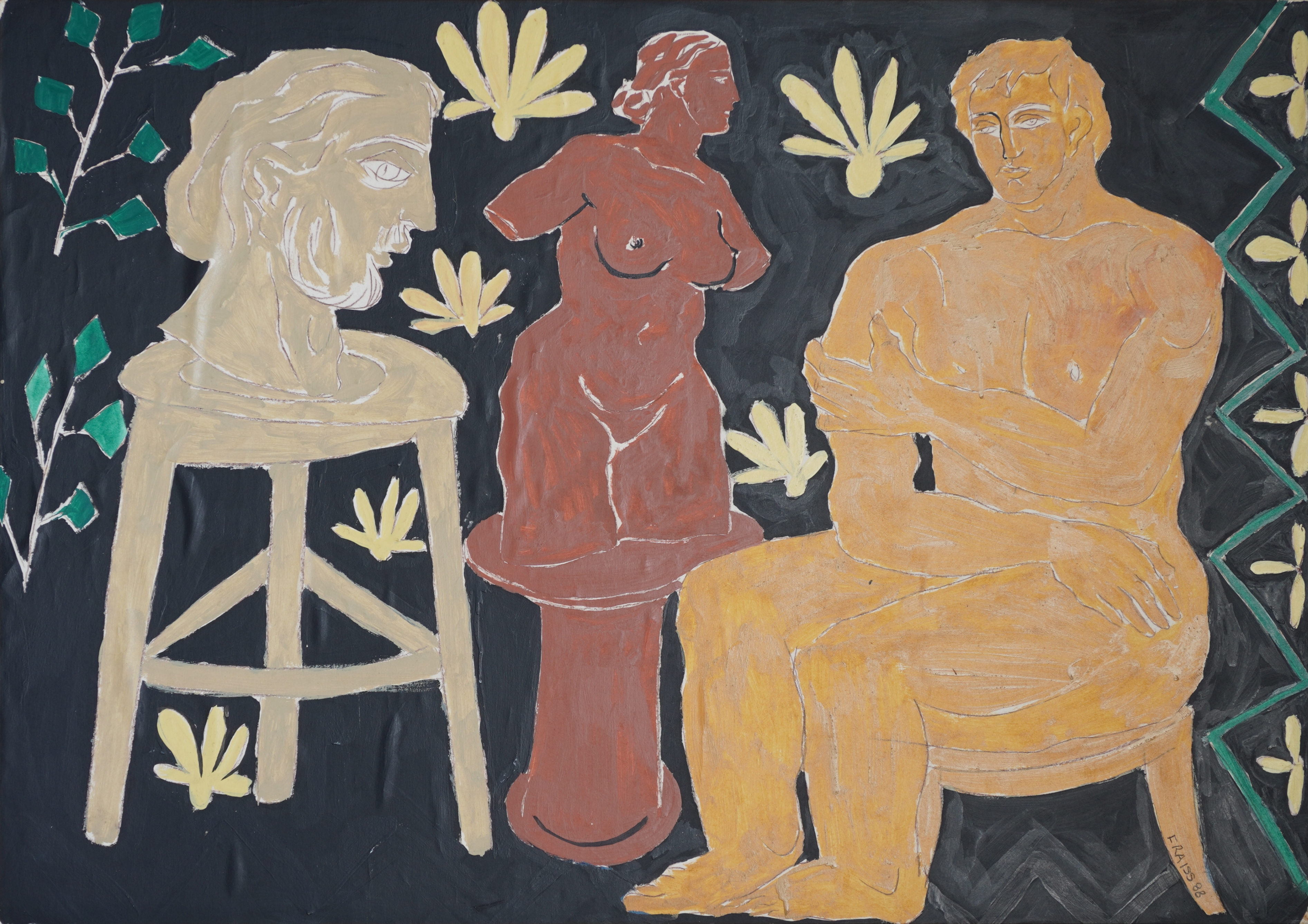 Florian Raiss (Rio de Janeiro, RJ, 1955). Desenhista, pintor, escultor. Estuda na Accademia di Belle Arti di Firenze [Academia de Belas Artes de Florença], Itália, entre 1973 e 1974. Neste mesmo ano, ingressa na Accademia di Belle Arti di Roma [Academia de Belas Artes de Roma], onde permanece até 1975. Muda-se para o México, onde estuda desenho, entre 1975 e 1977, com Gilberto Aceves Navarro, na Academia de San Carlos da Universidad Nacional Autónoma de México (Unam) [Universidade Nacional Autônoma do México], na Cidade do México. Realiza diversas mostras individuais em São Paulo. Participa de exposições coletivas no Brasil e no exterior (Alemanha, Suécia, Venezuela, Holanda, Portugal e Estados Unidos), com destaque para as mostras MAM na OCA, Arte Brasileira do Acervo do Museu de Arte Moderna de São Paulo - MAM/SP, em 2006 e Modernos, Pós-Modernos, 80/90, em 2007, no Instituto Tomie Ohtake, também em São Paulo.