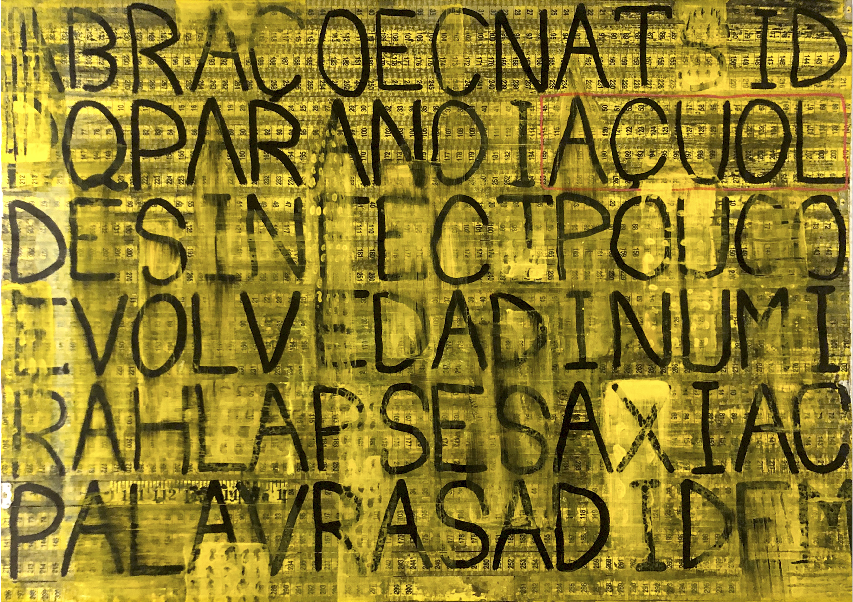 “A obra faz parte de uma série derivada do caos urbano. Caixas,blocos, prédios. E palavras. As que nos sobram sem os abraços. Tudo incorporadoàs medidas. Réguas. Regras. São as métricas que vivemos. E através do labirintoe das palavras cruzadas, surge a poesia. E ovirus, é claro.”
