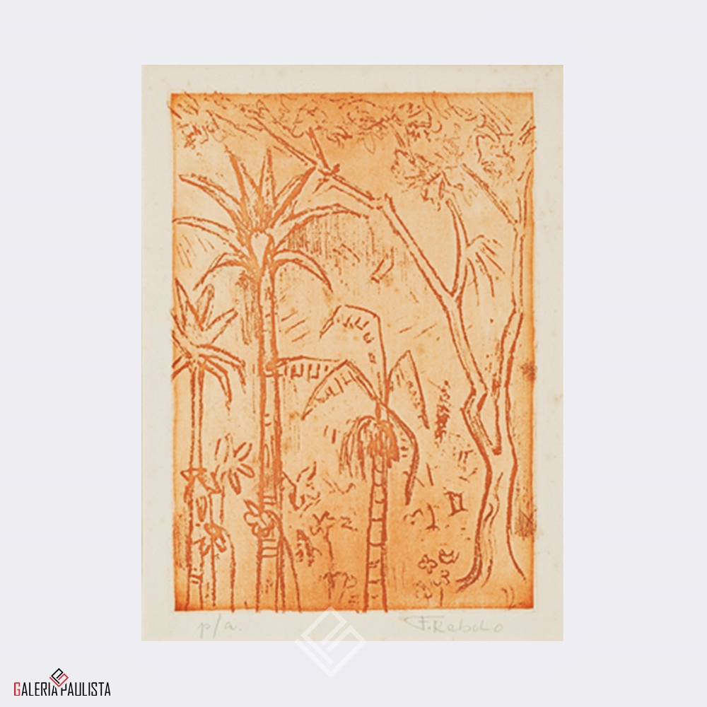 FRANCISCO REBOLO (1902 – 1980) CONSTA DA INSCRIÇÃO NO C.I.E.: "COLORIDO A MÃO". GRAVURA EM METAL - MONOTIPIA - DÉCADA 1960. ASSINADO EM BICO DE PENA E ASSINADO EM GRAFITE, ABAIXO. MEDIDAS: 33 X 40 CM. A Gravura na Obra de Rebolo. Em dois períodos de sua vida artística Rebolo dedicou-se à gravura. De 1959 a 1962 trabalhou mais de 20 matrizes de xilogravura. Depois entre 1970 e 1980, estimulado por Marcelo Grassmann e outros amigos gravadores, produziu cerca de 50 matrizes de águas-fortes e litogravuras. A xilogravura representou uma continuação das monotipias, praticada nos anos 1950 com expressivos resultados. Nos anos 1970, o artista passou para o metal e conseguiu usando o cobre uma forte simbiose ao aquarelar algumas de suas águas fortes. O pintor produziu gravuras por gosto e com gosto. Em sua obra a gravura tem autonomia e vai muito além da utilização como um instrumento adicional para o desenvolvimento de óleos. As gravuras de Rebolo podem ser e são apreciadas por sua condição de gravura.