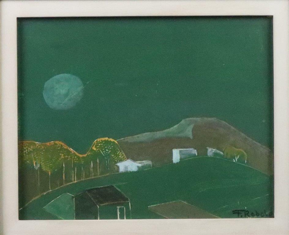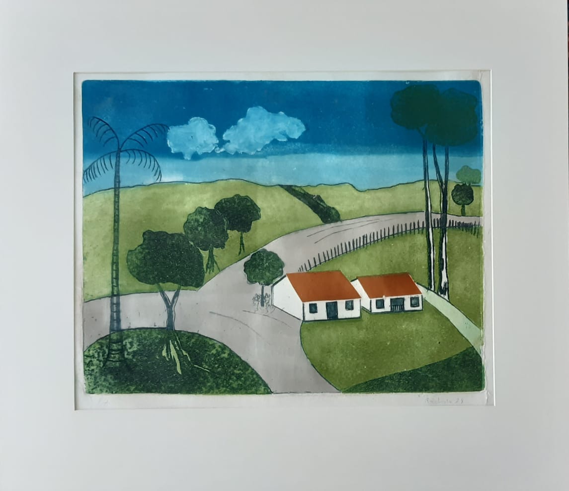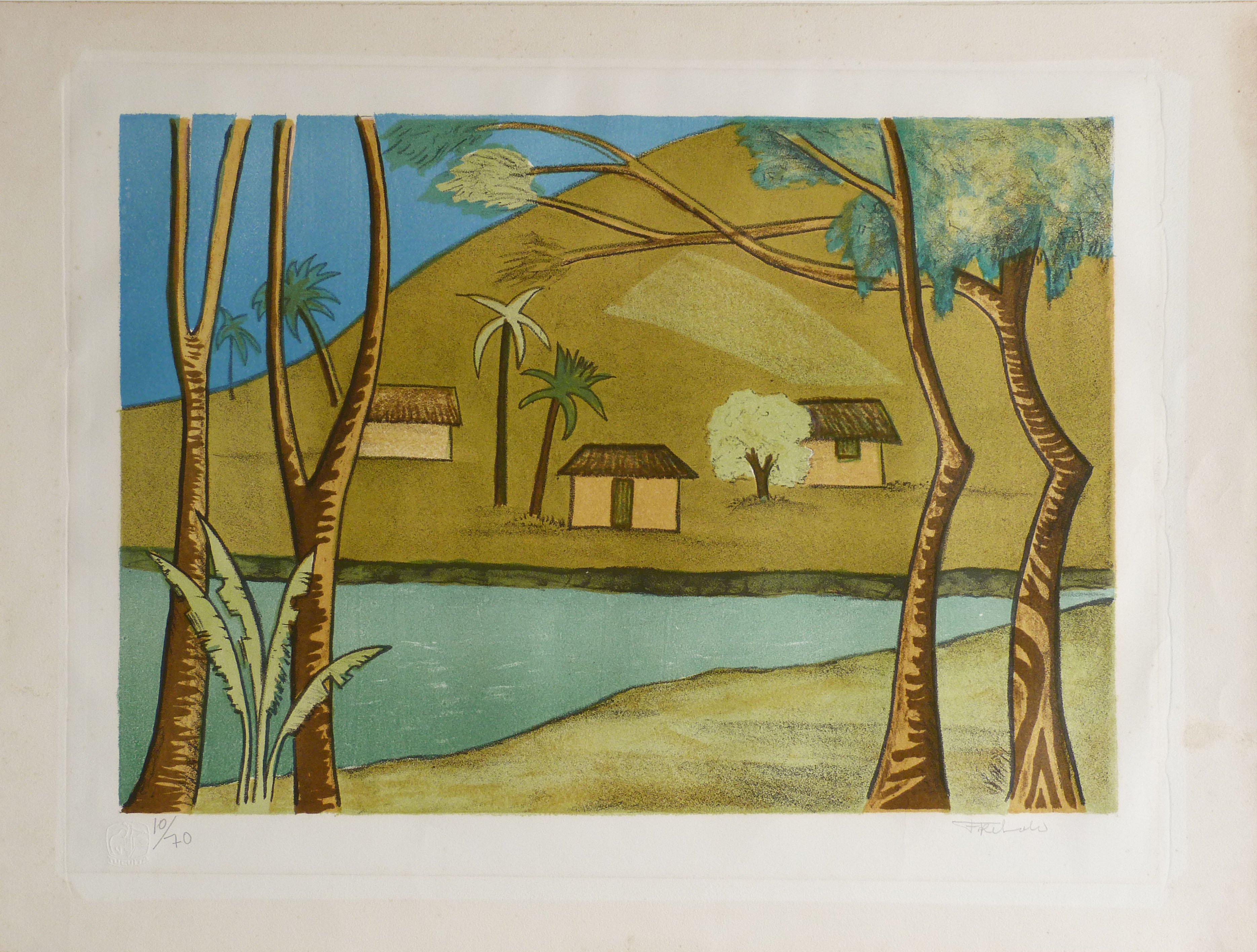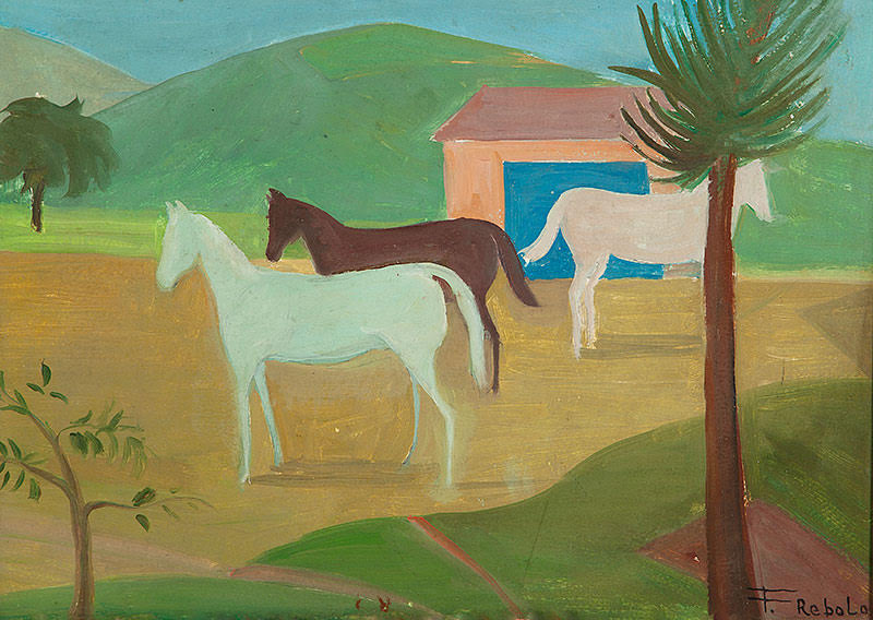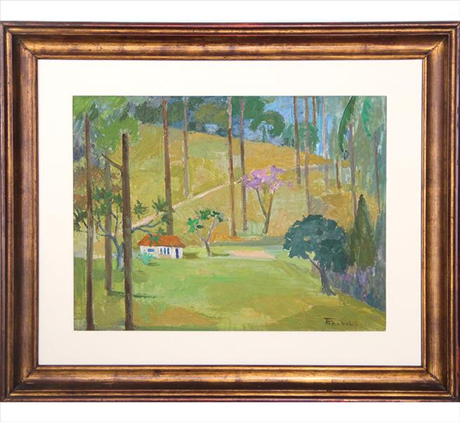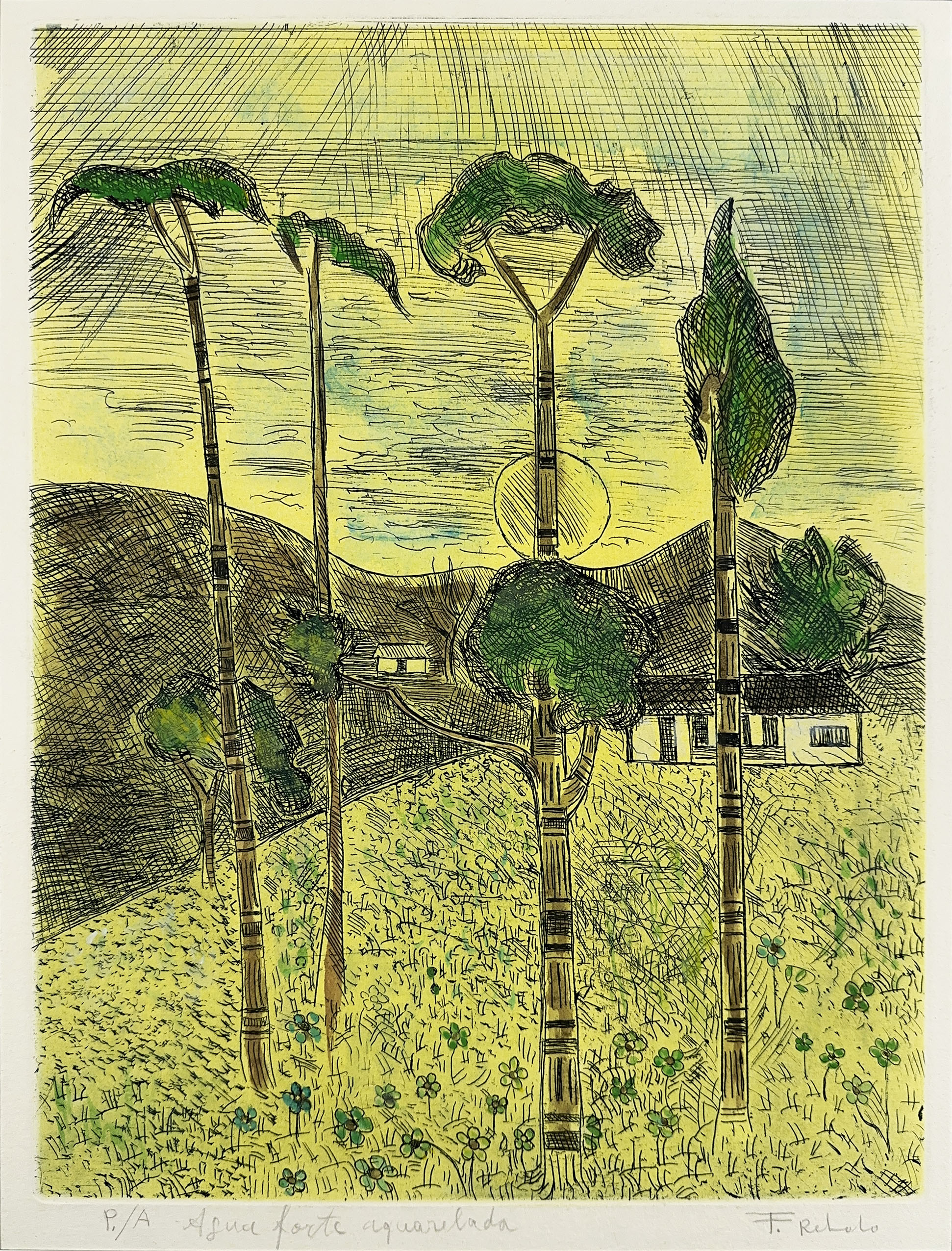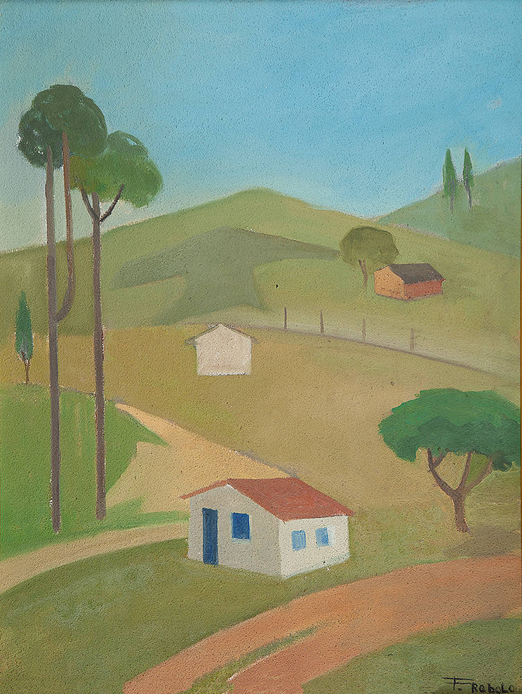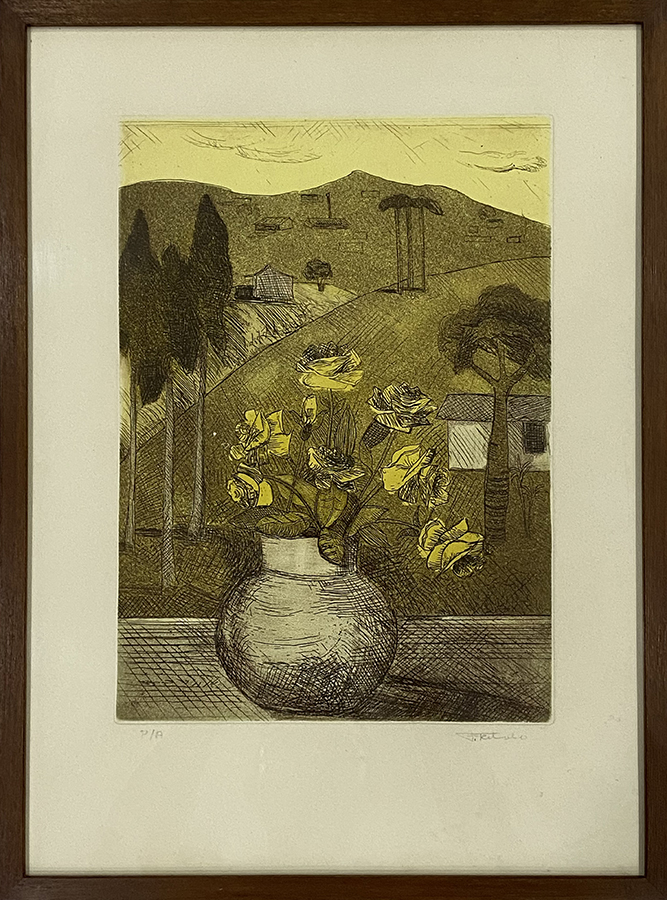 FRANCISCO REBOLO (1902 – 1980) CONSTA DA INSCRIÇÃO NO C.I.E.: "COLORIDO A MÃO". GRAVURA EM METAL - MONOTIPIA - DÉCADA 1960. ASSINADO EM BICO DE PENA E ASSINADO EM GRAFITE, ABAIXO. MEDIDAS: 33 X 40 CM. A Gravura na Obra de Rebolo. Em dois períodos de sua vida artística Rebolo dedicou-se à gravura. De 1959 a 1962 trabalhou mais de 20 matrizes de xilogravura. Depois entre 1970 e 1980, estimulado por Marcelo Grassmann e outros amigos gravadores, produziu cerca de 50 matrizes de águas-fortes e litogravuras. A xilogravura representou uma continuação das monotipias, praticada nos anos 1950 com expressivos resultados. Nos anos 1970, o artista passou para o metal e conseguiu usando o cobre uma forte simbiose ao aquarelar algumas de suas águas fortes. O pintor produziu gravuras por gosto e com gosto. Em sua obra a gravura tem autonomia e vai muito além da utilização como um instrumento adicional para o desenvolvimento de óleos. As gravuras de Rebolo podem ser e são apreciadas por sua condição de gravura.