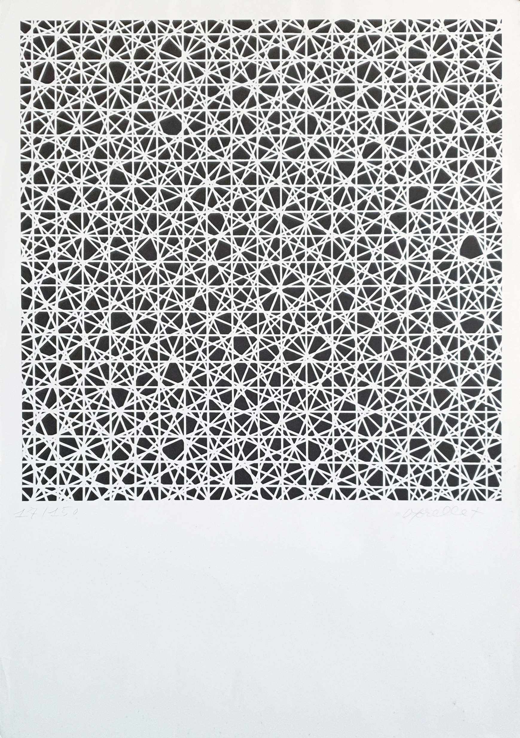 François Morellet nasceu em Cholet, na França, em 1926. Desenvolveu uma experiência artística bastante pessoal, na qual ele mesmo aponta as principais etapas: 1952 - primeiros trabalhos sistemáticos com repartição uniforme; 1958 - sistemas aleatórios; 1962 - esferas -tramas; 1963 - neón com ritmos interferentes. De 1960 a 1968 participou dos trabalhos do Groupe de Recherche dArt Visuel (Grupo de Pesquisa de Arte Visual).