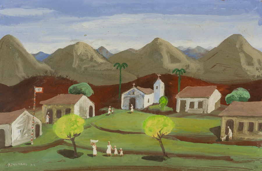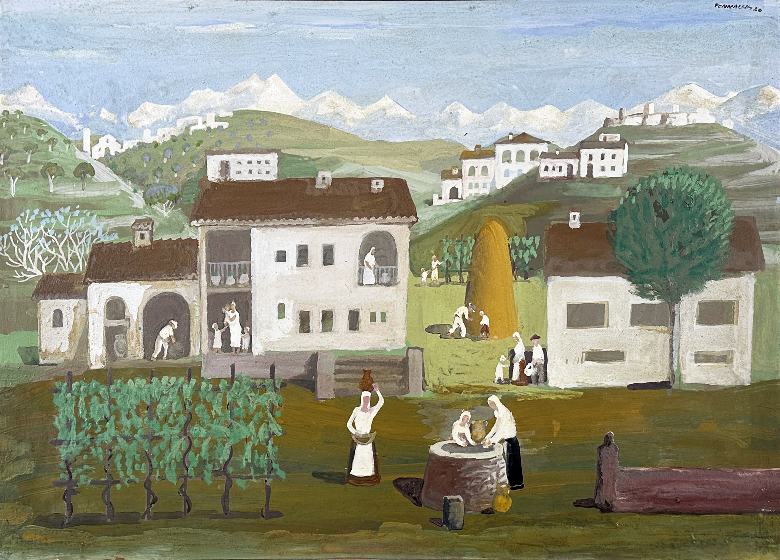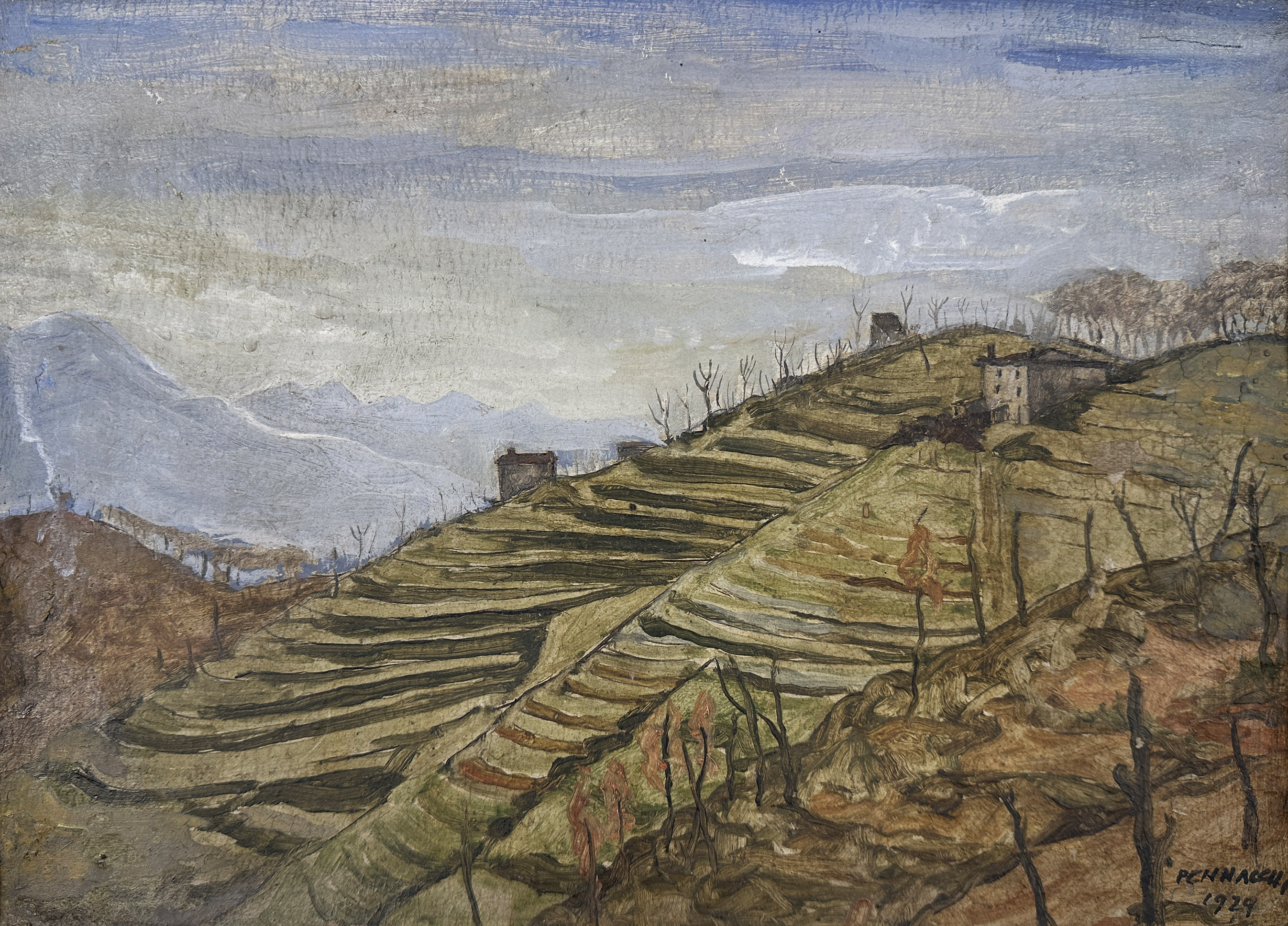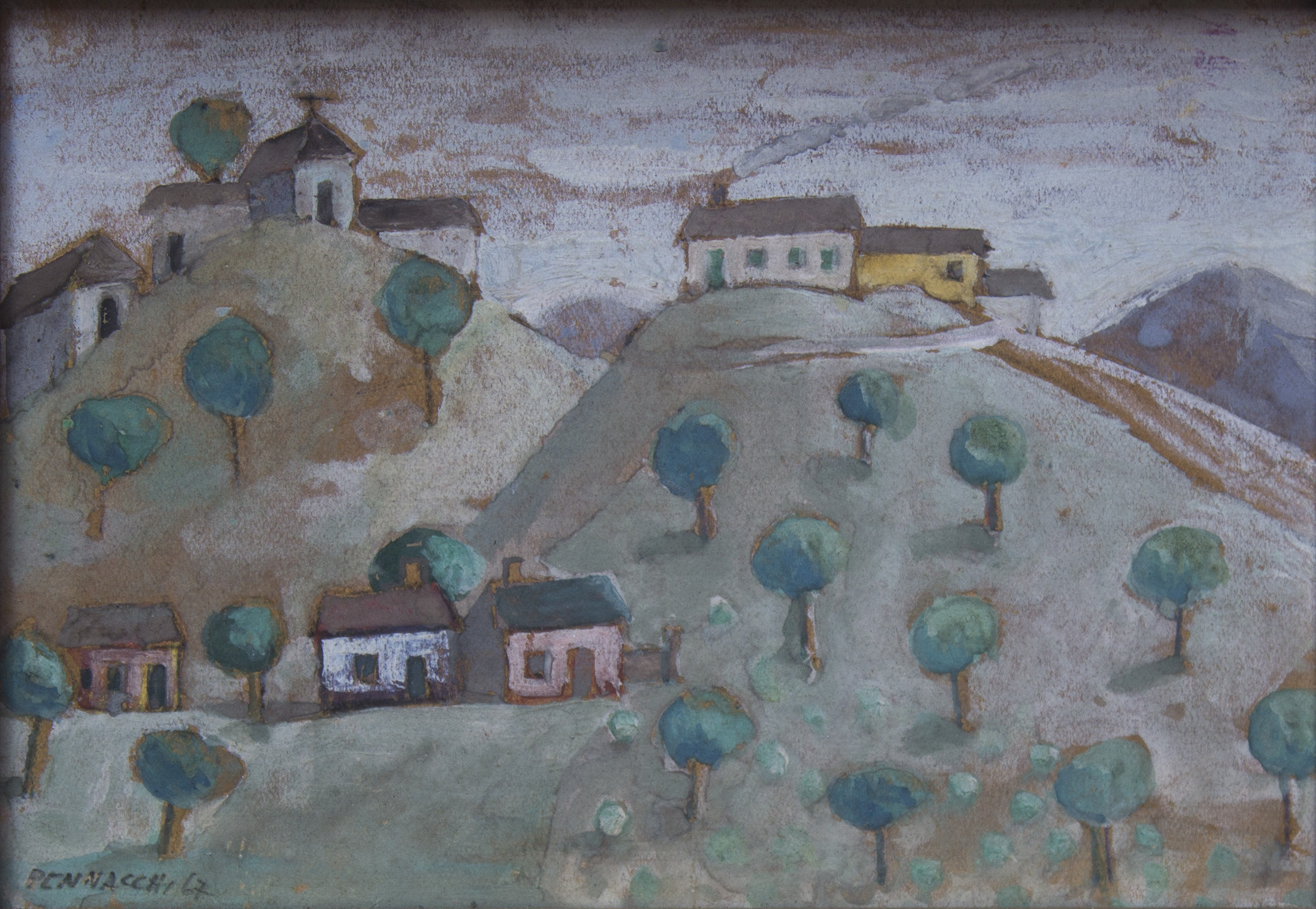 Fúlvio Pennacchi - Paisagem de Garfagnana, 1929 - Acrílica sobre cartão, assinado e datado inferior direito; assinado, datado e titulado no verso. Obra proveniente do espólio do artista. - 30 x 40 cm.