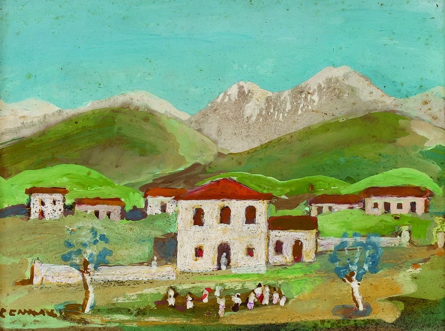 PENNACCHI, Fúlvio - "Vila com figuras" - óleo sobre cartão colado sobre eucatex - 09 x 11 cm - a.c.s.d. 1972