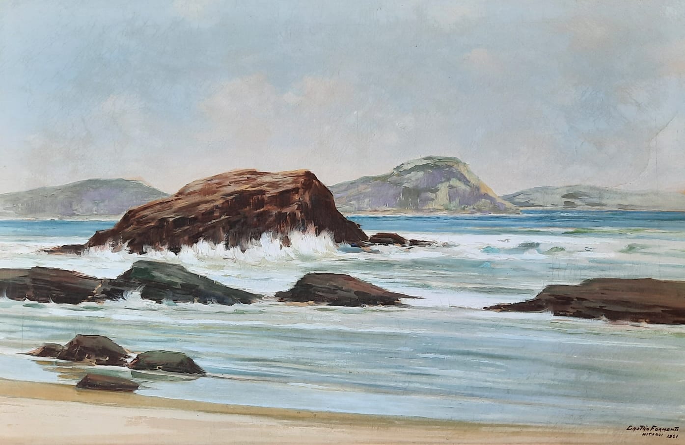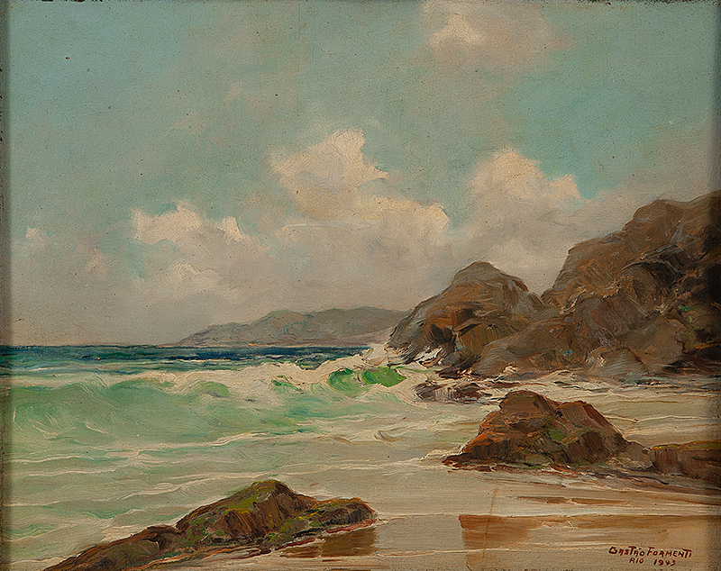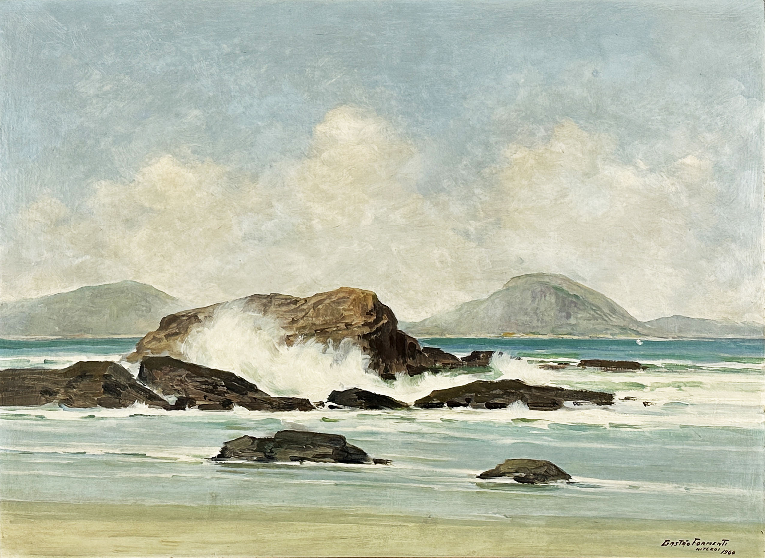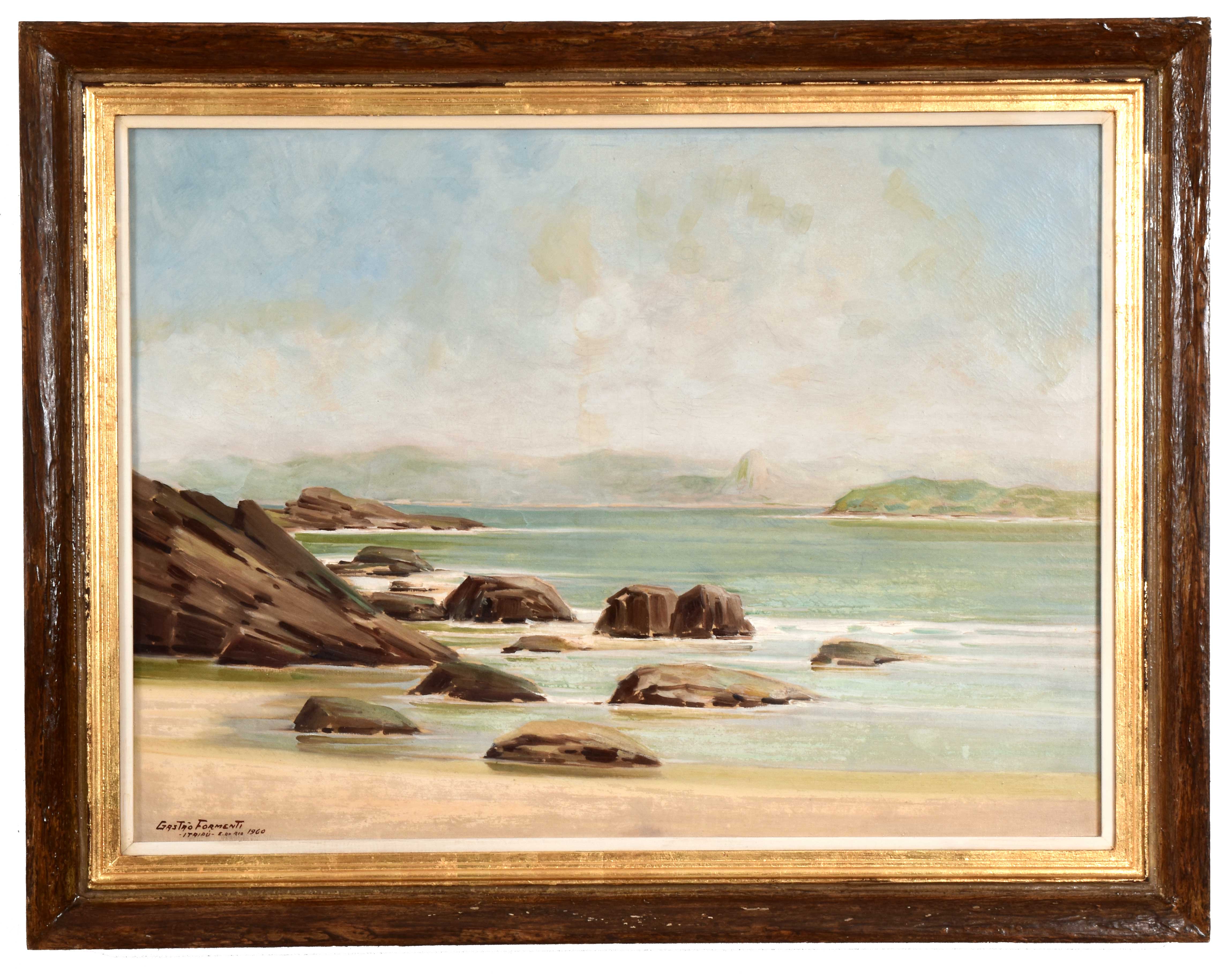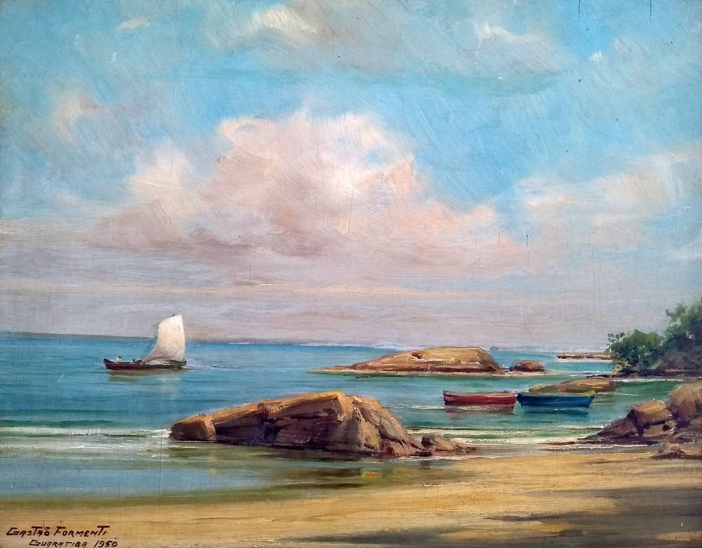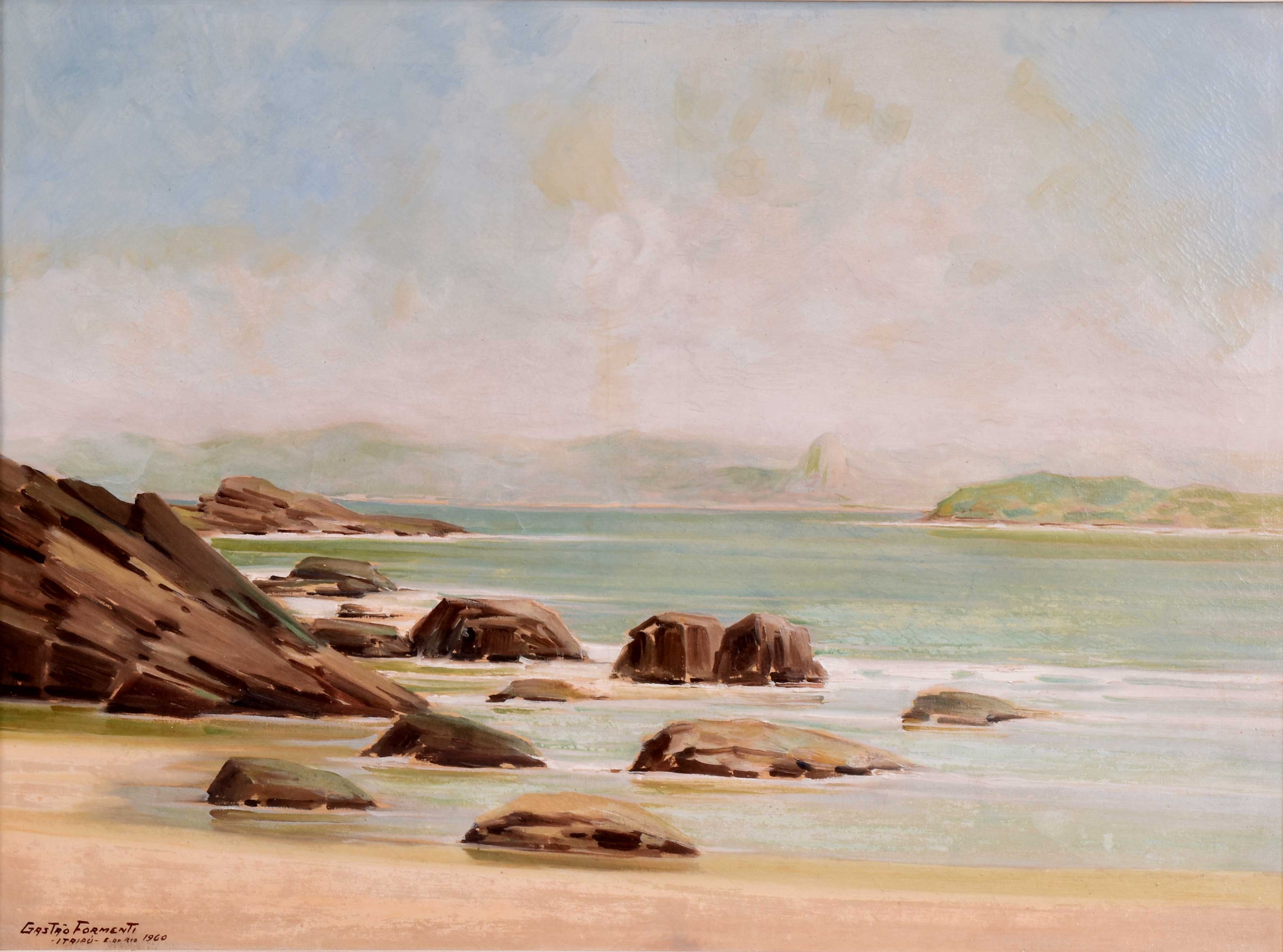 GASTÃO FORMENTI Marinha - Itaipu O.S.T. Medidas: 60 x 81 cm. Com moldura: 74,5 x 95,5 cm. Gastão Formenti, filho do pintor e cantor Cesare Formenti, destacou-se como pintor, vitralista e cantor. Nascido em uma família de artistas, começou a estudar pintura aos nove anos. Transferindo-se para o Rio de Janeiro em 1910, Formenti participou de várias exposições de arte, recebendo menção honrosa, medalhas de bronze e prata nas Exposições Gerais de Belas Artes. Além da pintura, Formenti produziu vitrais notáveis, como os da cúpula do Palácio Tiradentes e da Igreja de São Domingos. Como cantor, fez história ao assinar contrato com a Rádio Mayrink Veiga em 1930 e gravou vários sucessos pela gravadora Victor, incluindo "Maringá", que inspirou o nome da cidade paranaense. A partir de 1940, Formenti começou a se afastar da música para se dedicar à pintura, recebendo elogios de críticos como Monteiro Lobato. Sua vida e obra foram registradas pelo Museu da Imagem e do Som de São Paulo em 1970. Suas obras fazem parte do acervo do Museu Nacional de Belas Artes no Rio de Janeiro, consolidando seu legado multifacetado na cultura brasileira.