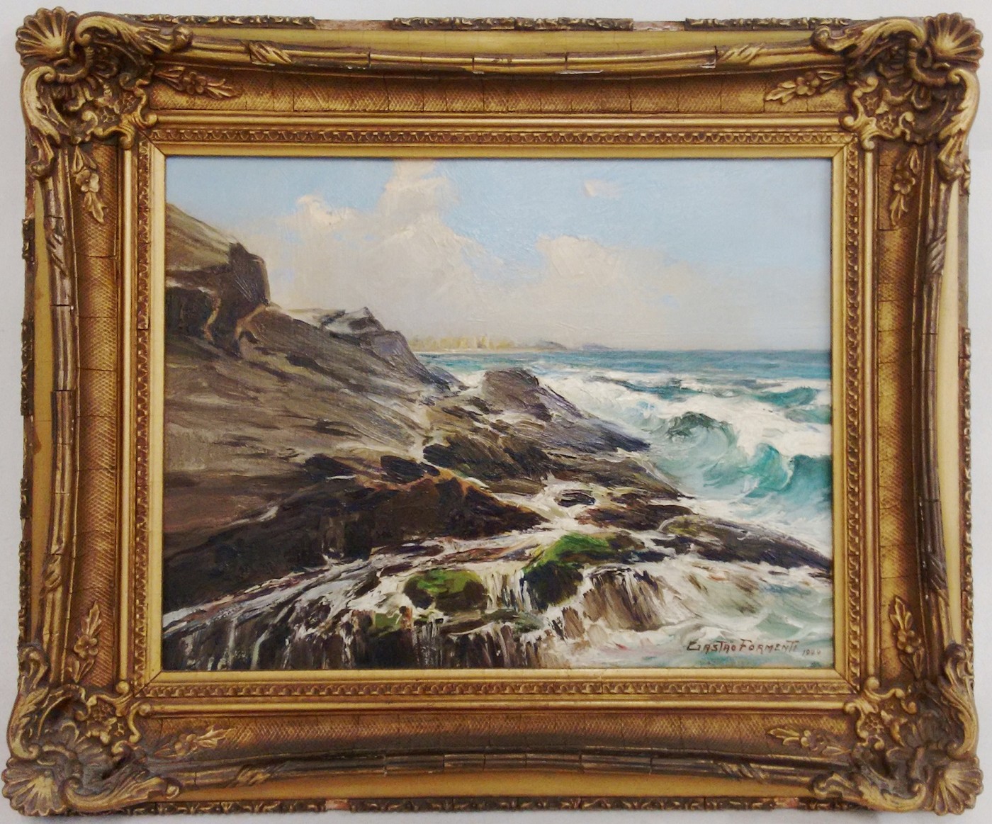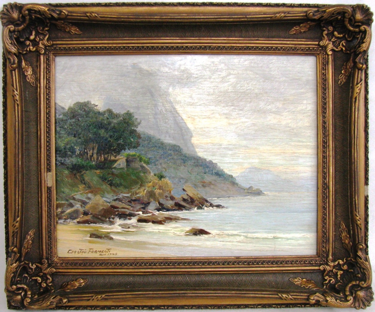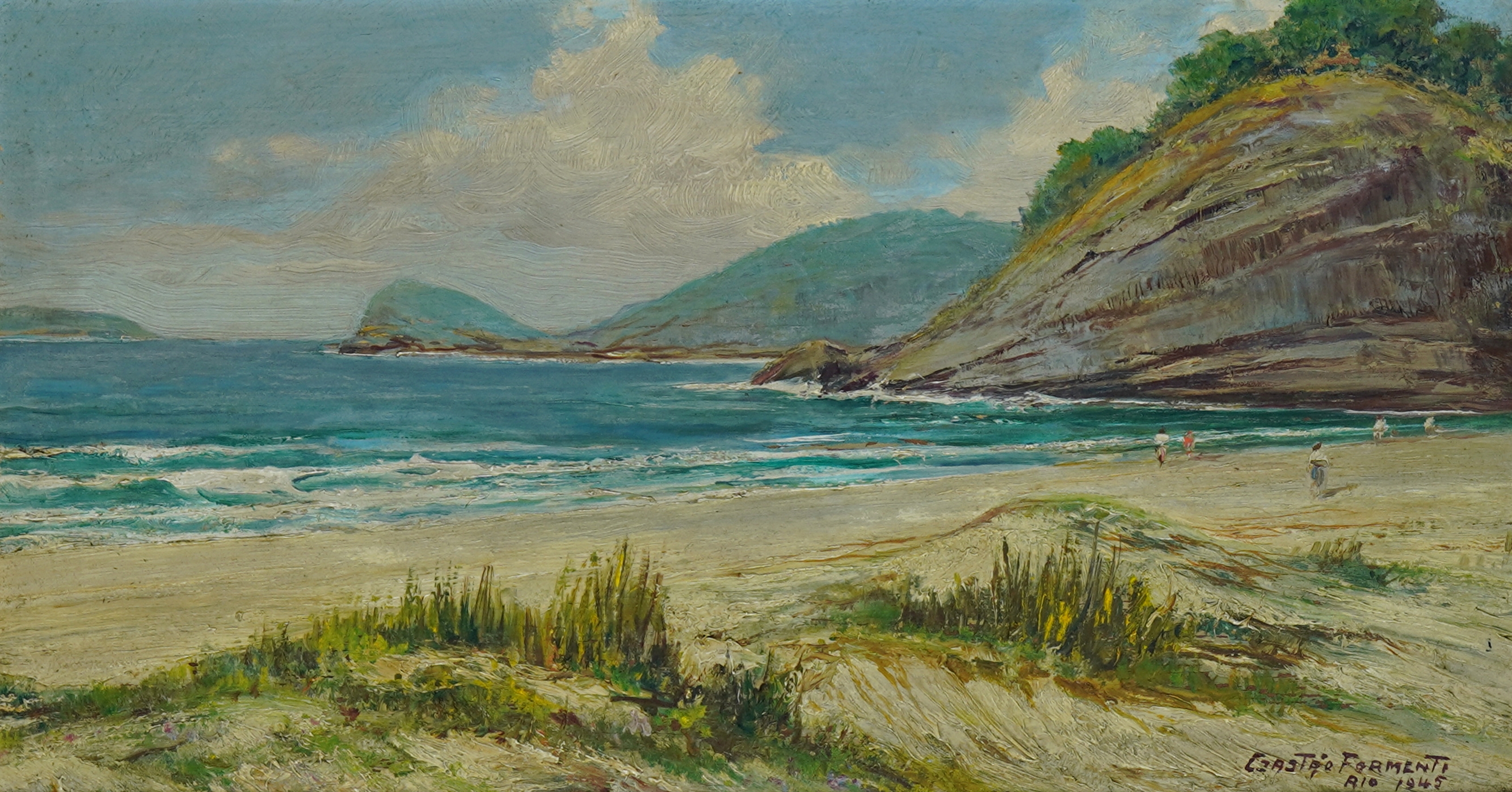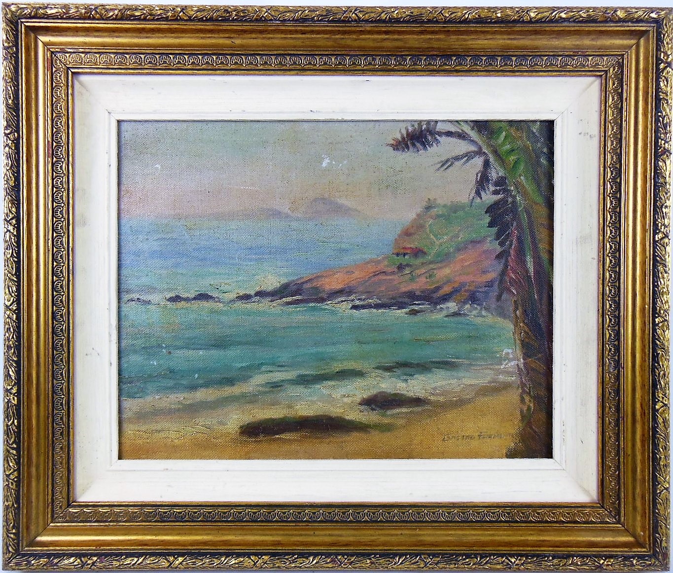 GASTÃO FORMENTI Marinha - Itaipu O.S.T. Medidas: 60 x 81 cm. Com moldura: 74,5 x 95,5 cm. Gastão Formenti, filho do pintor e cantor Cesare Formenti, destacou-se como pintor, vitralista e cantor. Nascido em uma família de artistas, começou a estudar pintura aos nove anos. Transferindo-se para o Rio de Janeiro em 1910, Formenti participou de várias exposições de arte, recebendo menção honrosa, medalhas de bronze e prata nas Exposições Gerais de Belas Artes. Além da pintura, Formenti produziu vitrais notáveis, como os da cúpula do Palácio Tiradentes e da Igreja de São Domingos. Como cantor, fez história ao assinar contrato com a Rádio Mayrink Veiga em 1930 e gravou vários sucessos pela gravadora Victor, incluindo "Maringá", que inspirou o nome da cidade paranaense. A partir de 1940, Formenti começou a se afastar da música para se dedicar à pintura, recebendo elogios de críticos como Monteiro Lobato. Sua vida e obra foram registradas pelo Museu da Imagem e do Som de São Paulo em 1970. Suas obras fazem parte do acervo do Museu Nacional de Belas Artes no Rio de Janeiro, consolidando seu legado multifacetado na cultura brasileira.