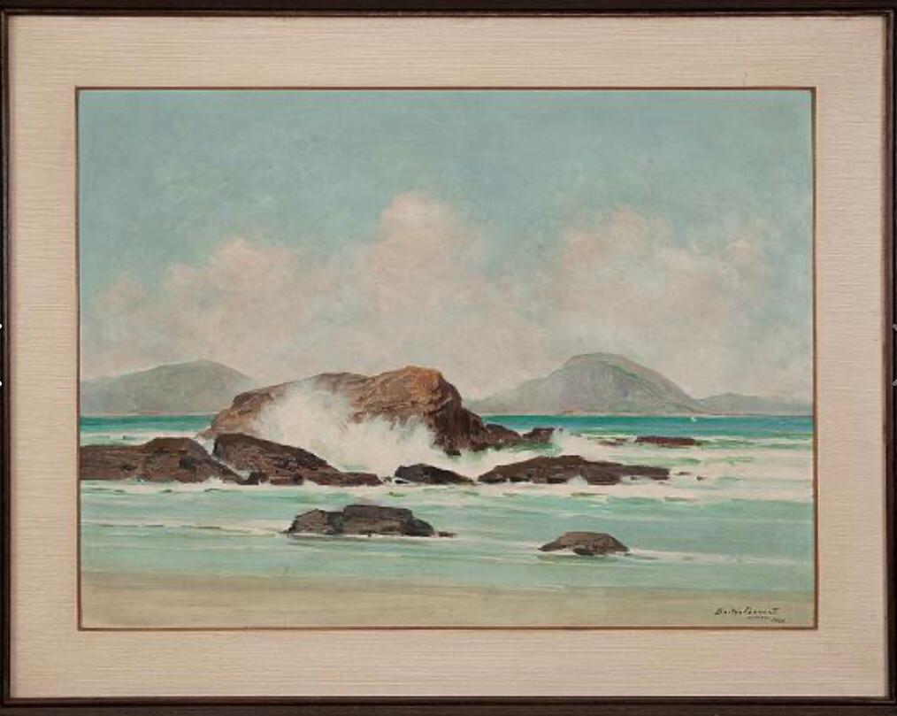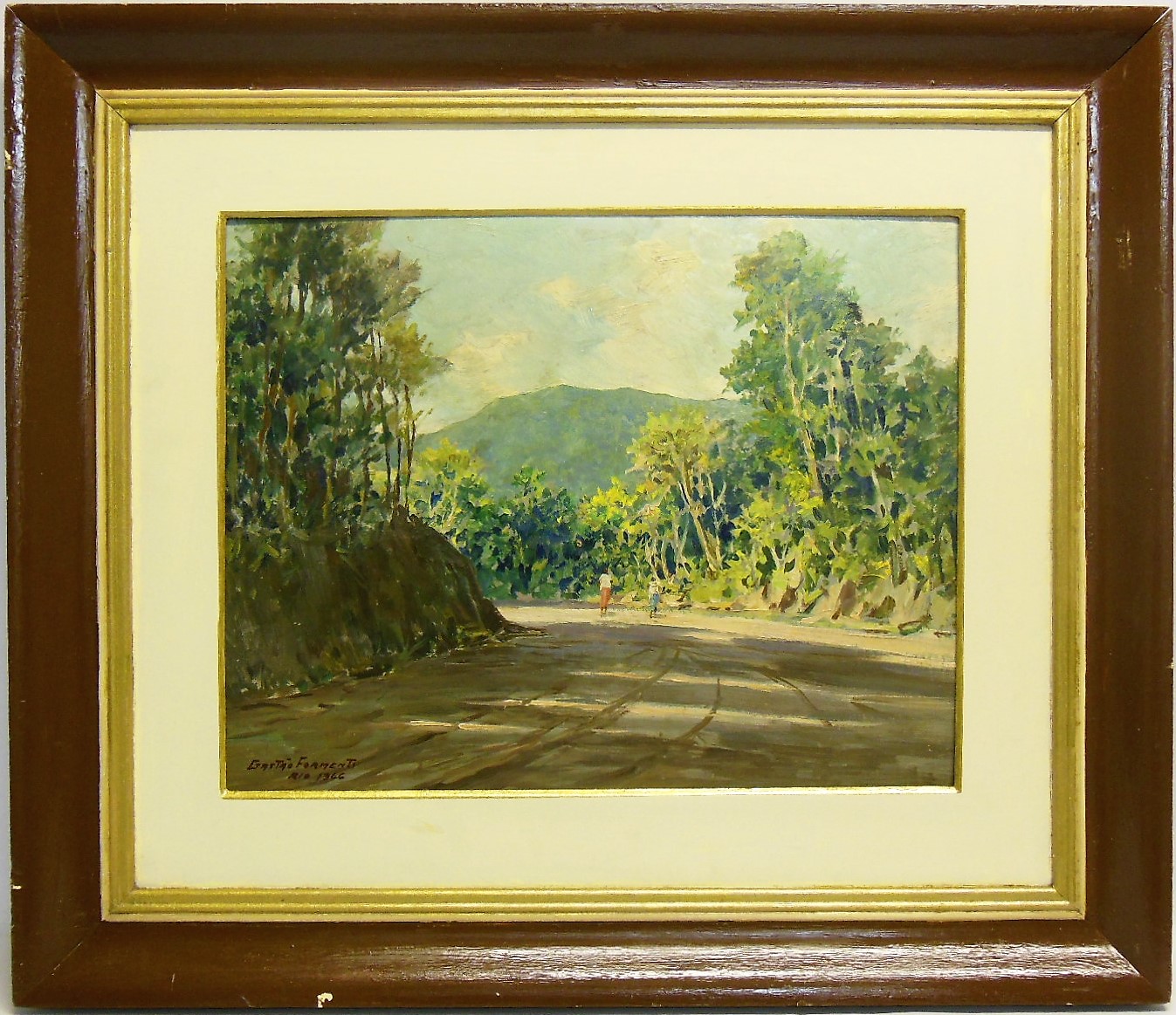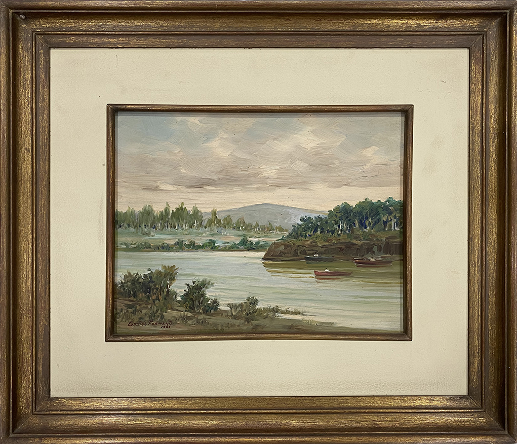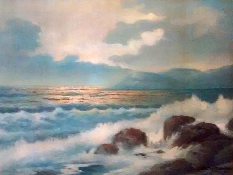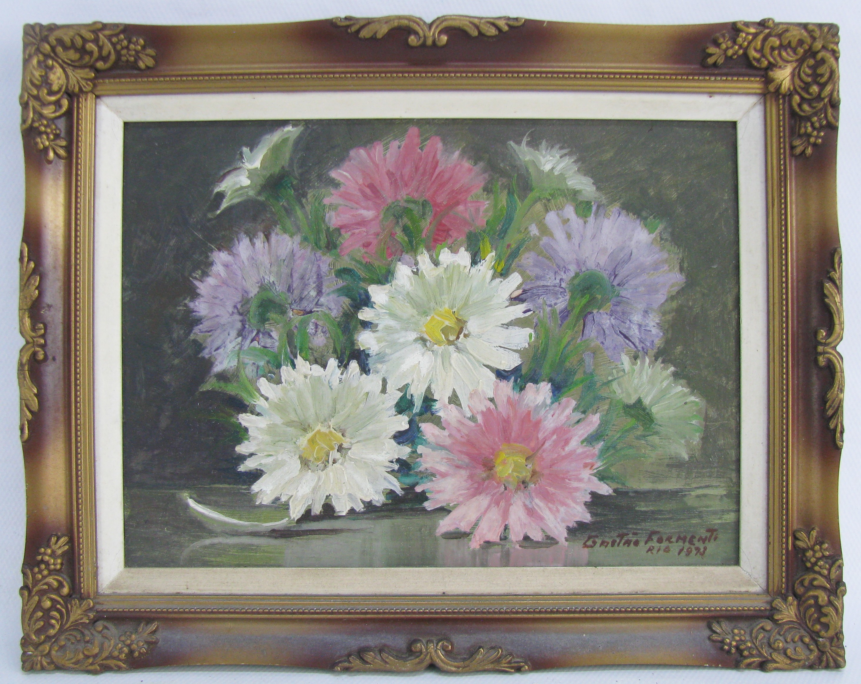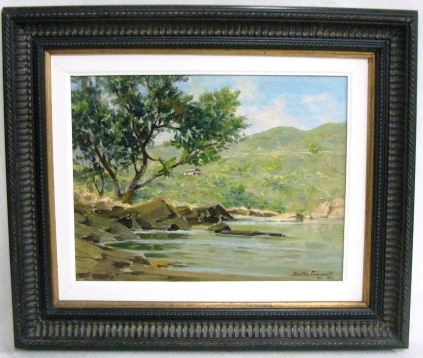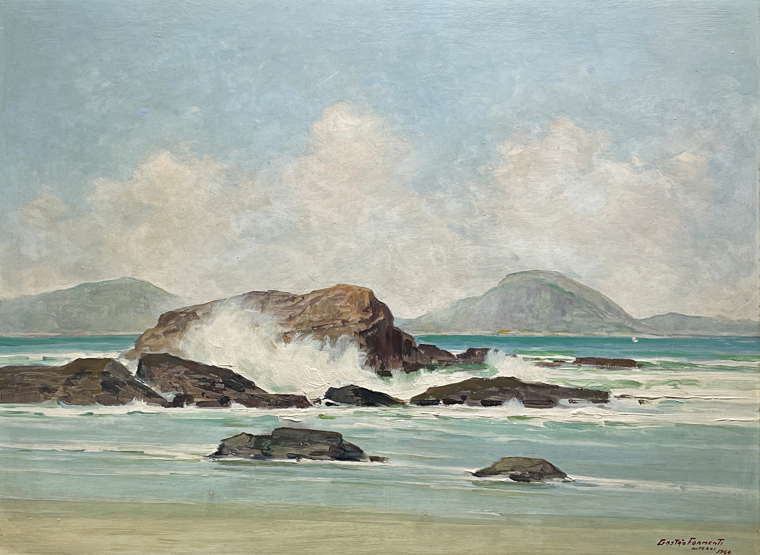 GASTÃO FORMENTI Marinha - Itaipu O.S.T. Medidas: 60 x 81 cm. Com moldura: 74,5 x 95,5 cm. Gastão Formenti, filho do pintor e cantor Cesare Formenti, destacou-se como pintor, vitralista e cantor. Nascido em uma família de artistas, começou a estudar pintura aos nove anos. Transferindo-se para o Rio de Janeiro em 1910, Formenti participou de várias exposições de arte, recebendo menção honrosa, medalhas de bronze e prata nas Exposições Gerais de Belas Artes. Além da pintura, Formenti produziu vitrais notáveis, como os da cúpula do Palácio Tiradentes e da Igreja de São Domingos. Como cantor, fez história ao assinar contrato com a Rádio Mayrink Veiga em 1930 e gravou vários sucessos pela gravadora Victor, incluindo "Maringá", que inspirou o nome da cidade paranaense. A partir de 1940, Formenti começou a se afastar da música para se dedicar à pintura, recebendo elogios de críticos como Monteiro Lobato. Sua vida e obra foram registradas pelo Museu da Imagem e do Som de São Paulo em 1970. Suas obras fazem parte do acervo do Museu Nacional de Belas Artes no Rio de Janeiro, consolidando seu legado multifacetado na cultura brasileira.