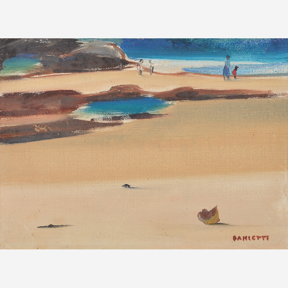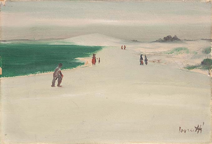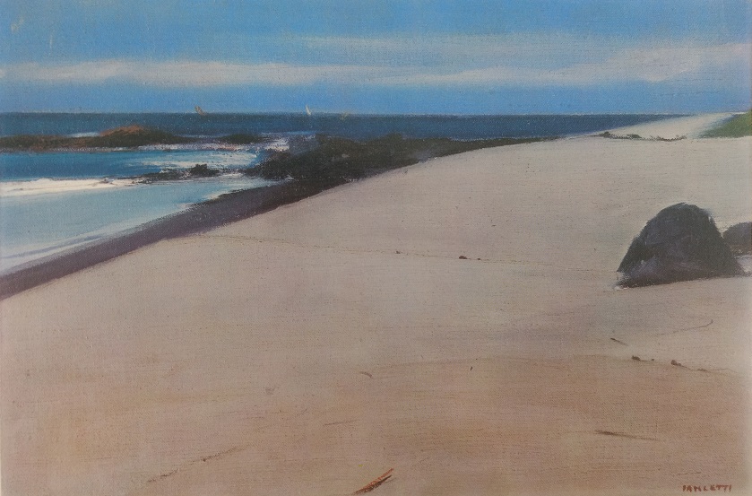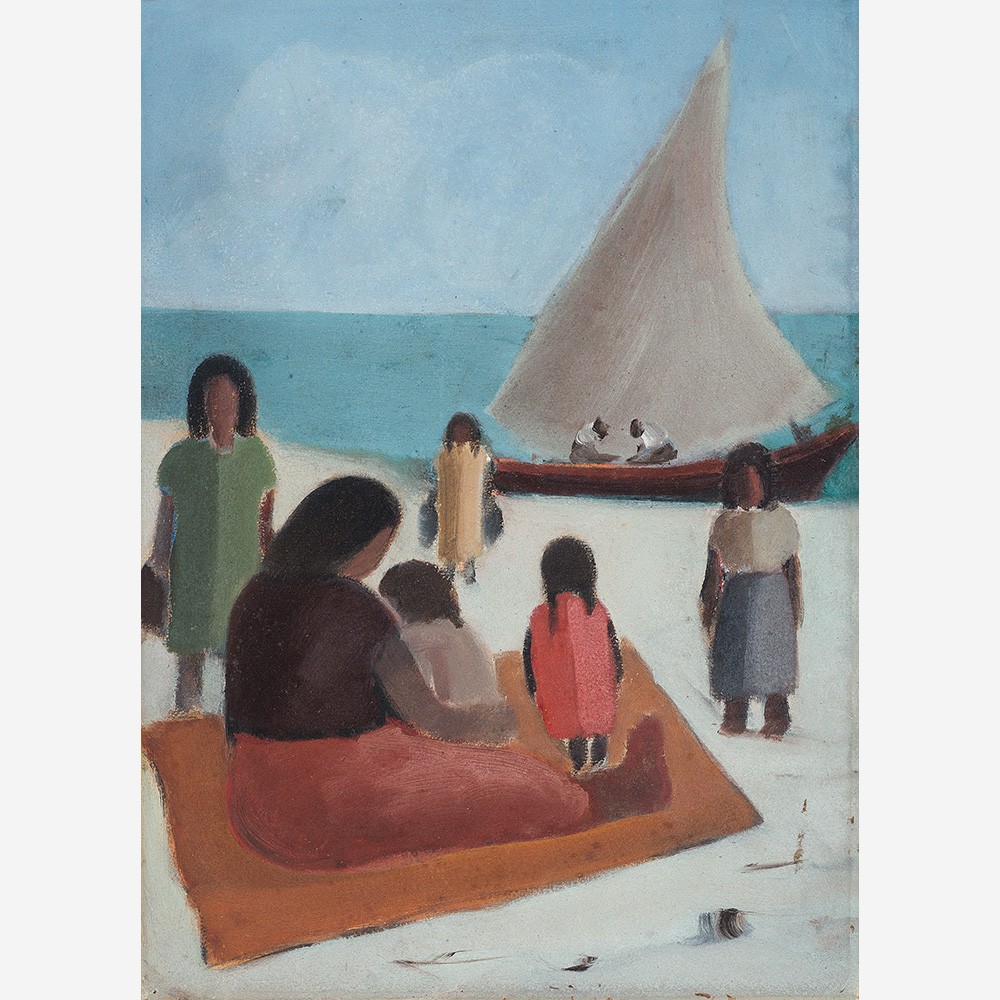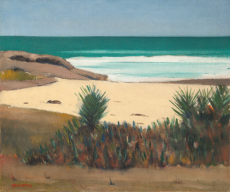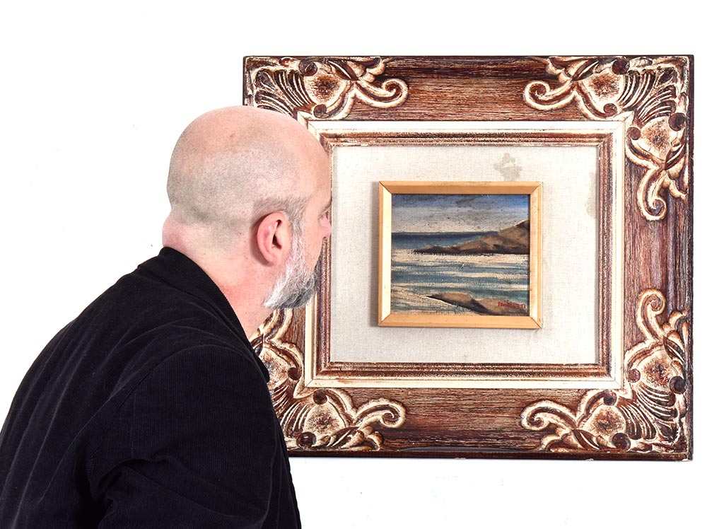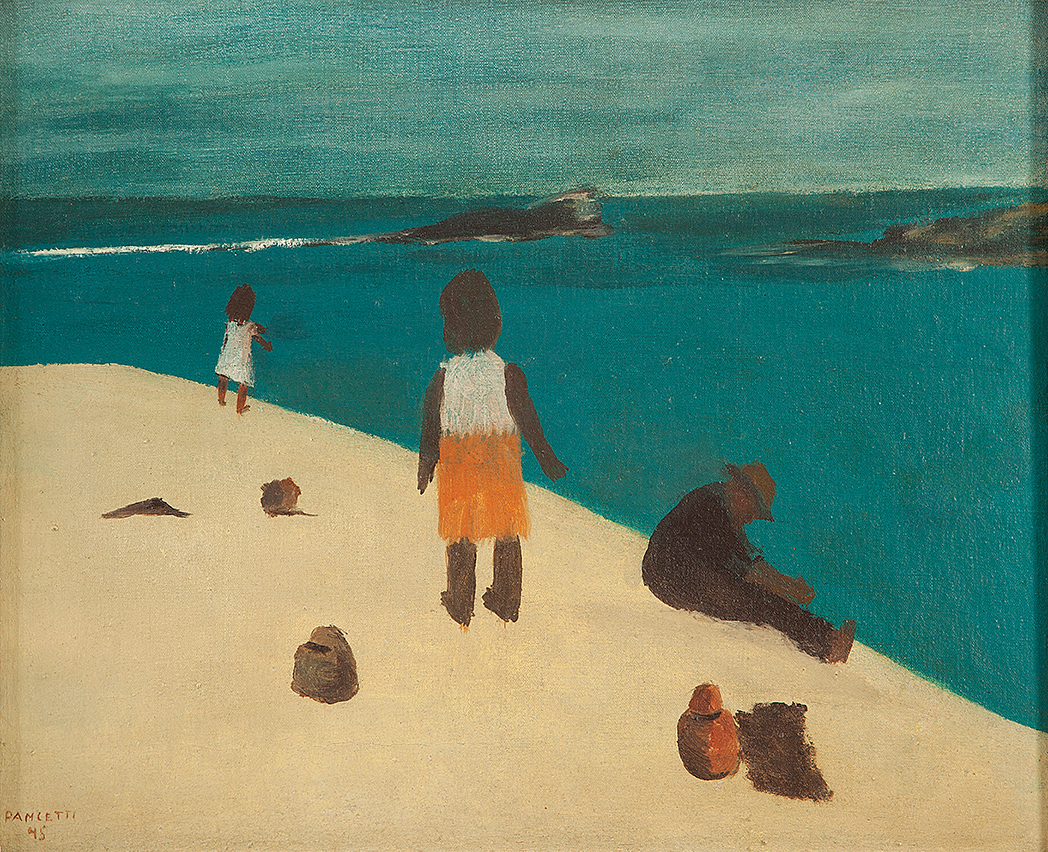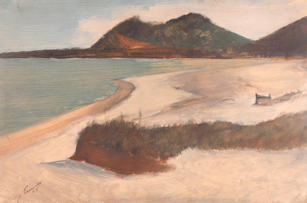 José Pancetti (1902–1958) – Marinha. Óleo sobre tela, dat. de 1945. Pintor brasileiro reconhecido sobretudo por suas marinhas, que evoluíram de uma construção analítica para soluções mais sintéticas e depuradas, aproximando-se da abstração, com forte ênfase na relação entre areia, luz e mar; integrou o Núcleo Bernardelli e consolidou-se como um dos principais nomes da pintura moderna brasileira. Ass. CIE. Dimensões: 32 × 49 cm.