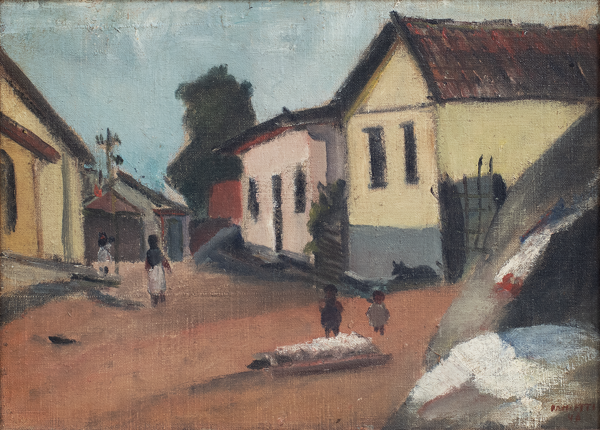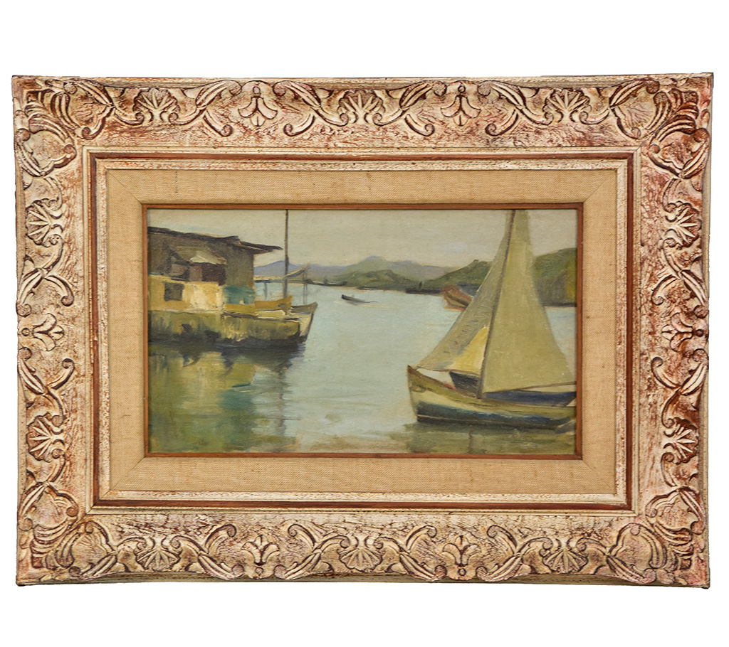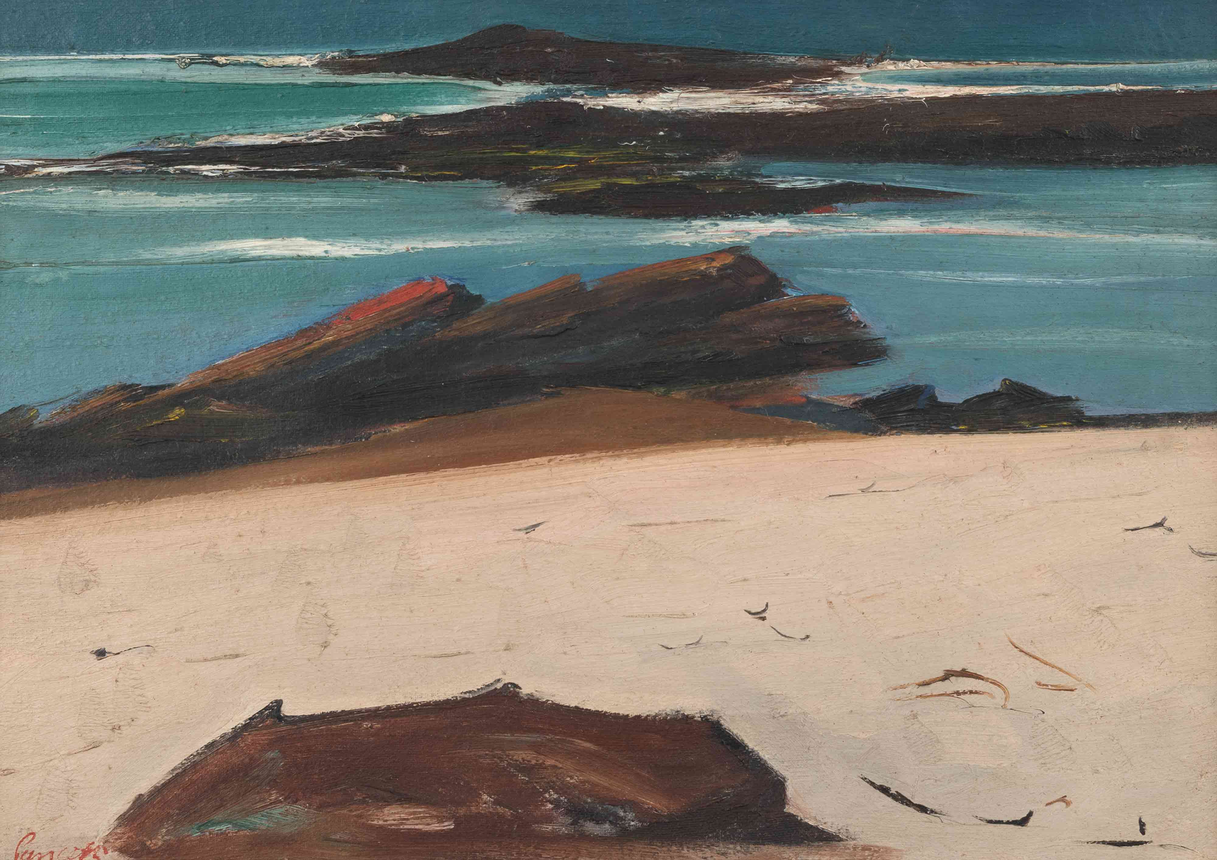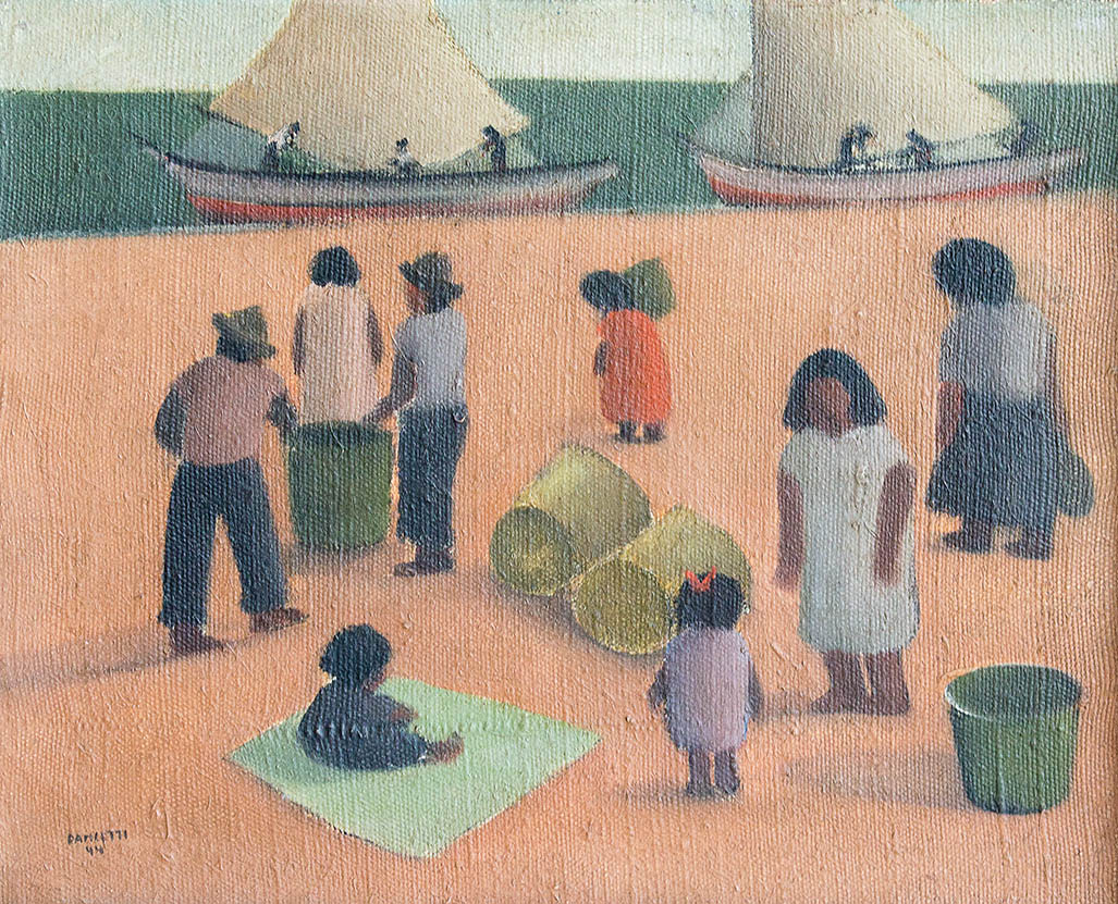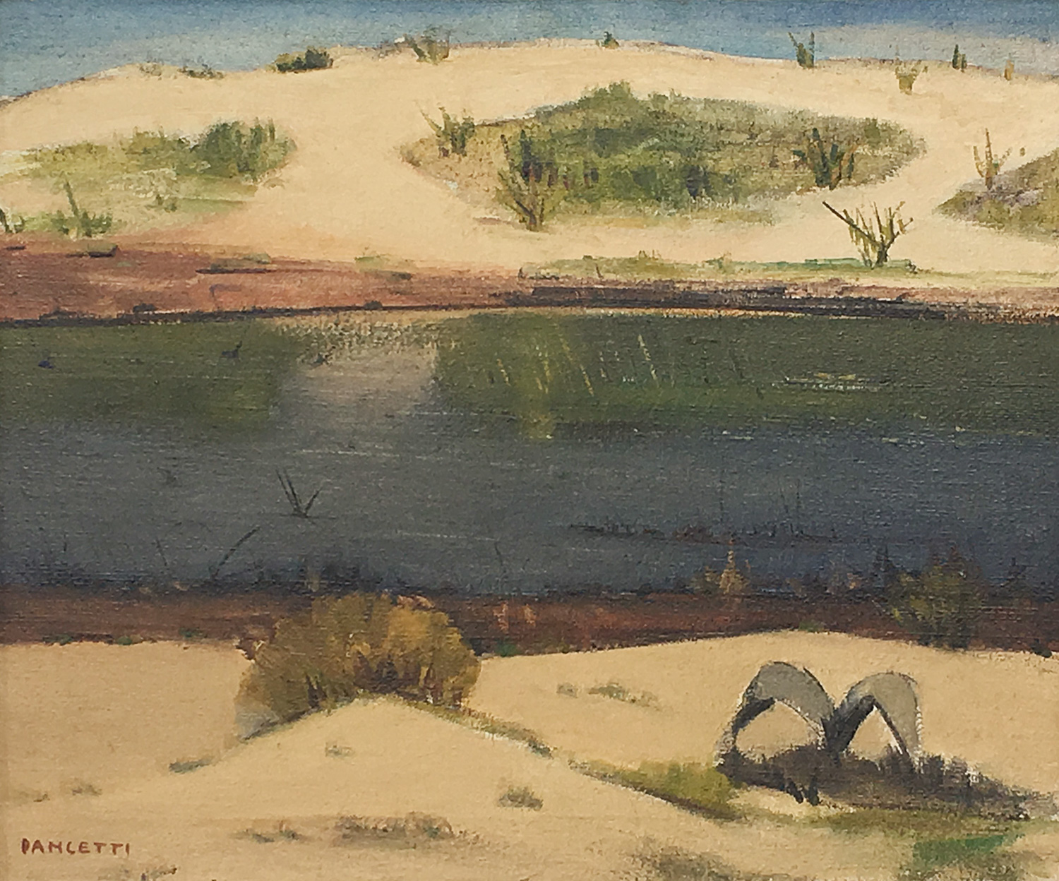José Pancetti (1902–1958) – Marinha. Óleo sobre tela, dat. de 1945. Pintor brasileiro reconhecido sobretudo por suas marinhas, que evoluíram de uma construção analítica para soluções mais sintéticas e depuradas, aproximando-se da abstração, com forte ênfase na relação entre areia, luz e mar; integrou o Núcleo Bernardelli e consolidou-se como um dos principais nomes da pintura moderna brasileira. Ass. CIE. Dimensões: 32 × 49 cm.