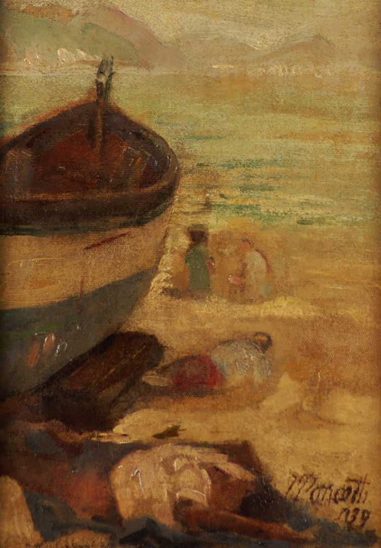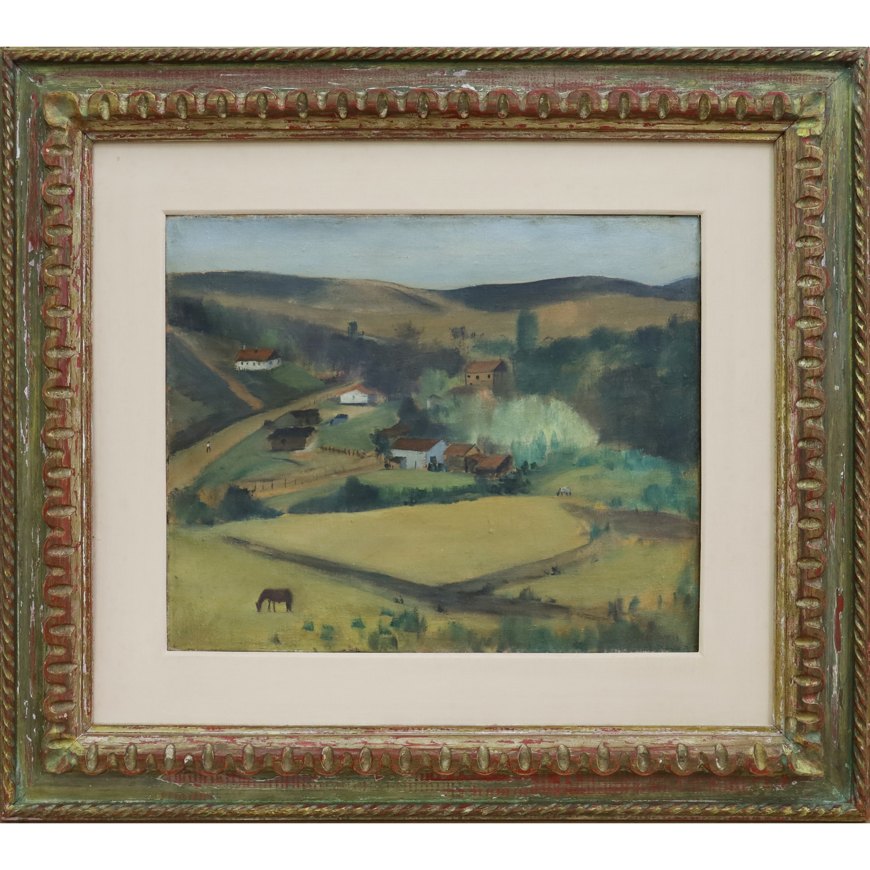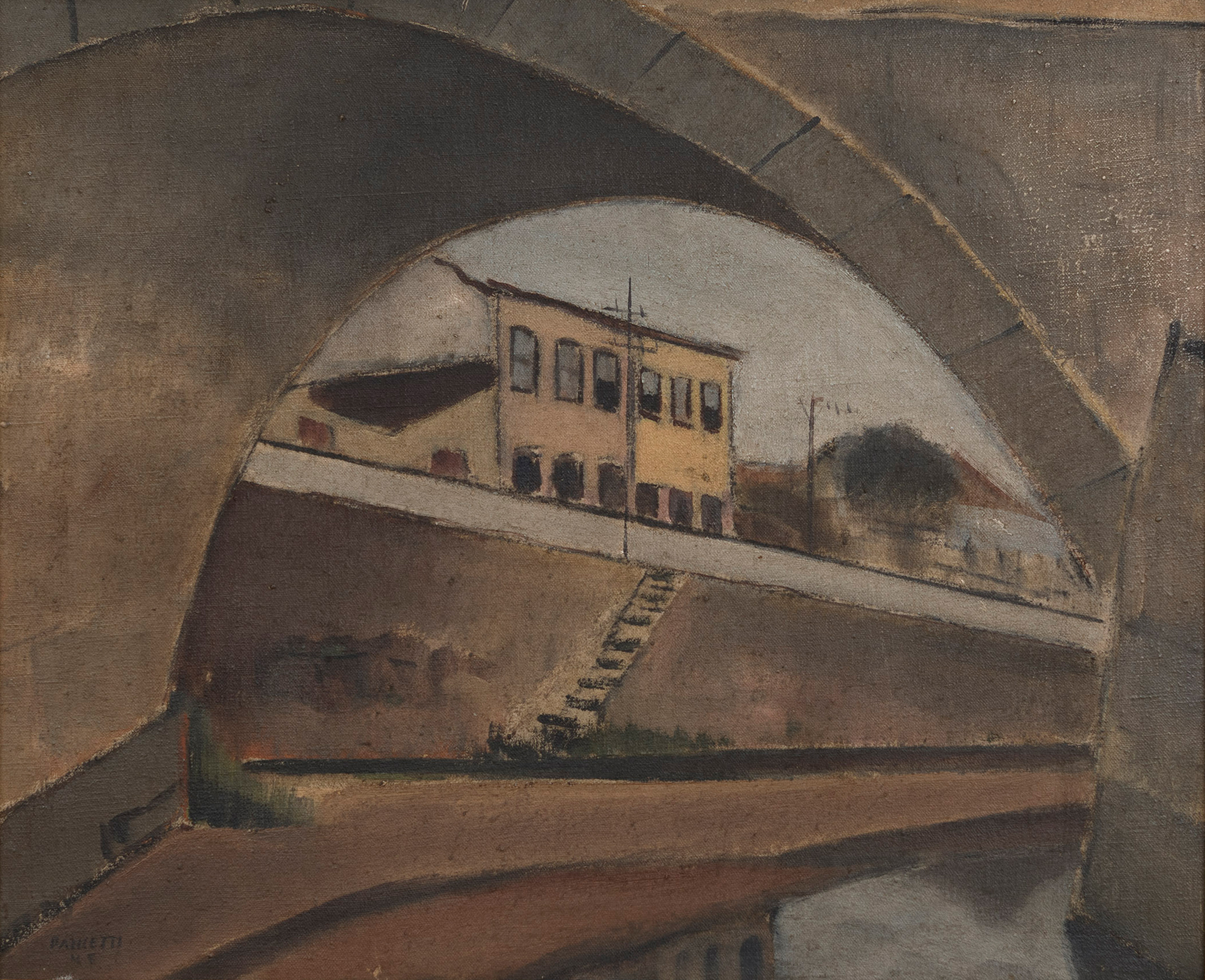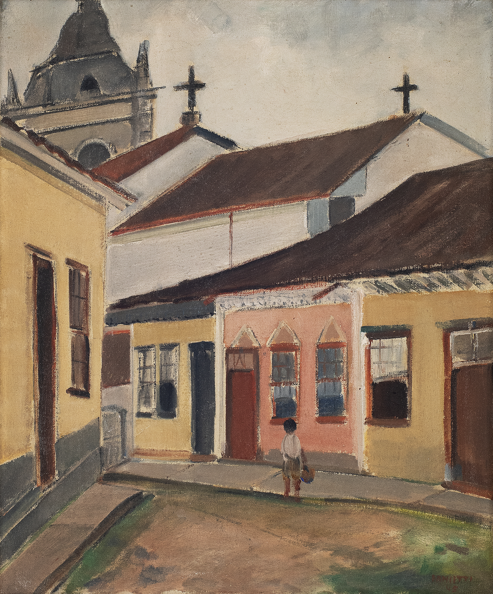 José Pancetti (1902–1958) – Marinha. Óleo sobre tela, dat. de 1945. Pintor brasileiro reconhecido sobretudo por suas marinhas, que evoluíram de uma construção analítica para soluções mais sintéticas e depuradas, aproximando-se da abstração, com forte ênfase na relação entre areia, luz e mar; integrou o Núcleo Bernardelli e consolidou-se como um dos principais nomes da pintura moderna brasileira. Ass. CIE. Dimensões: 32 × 49 cm.
