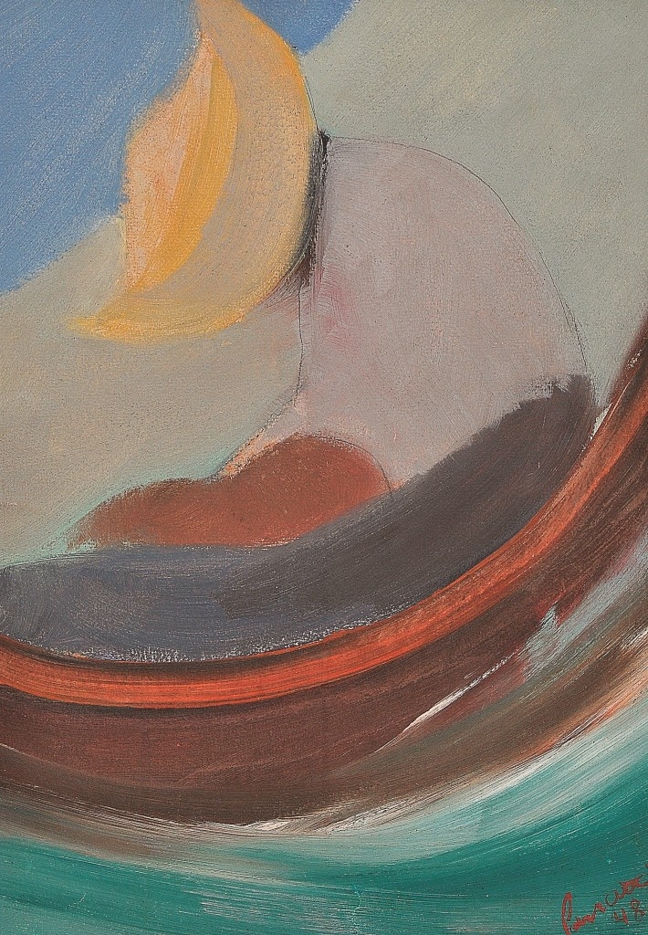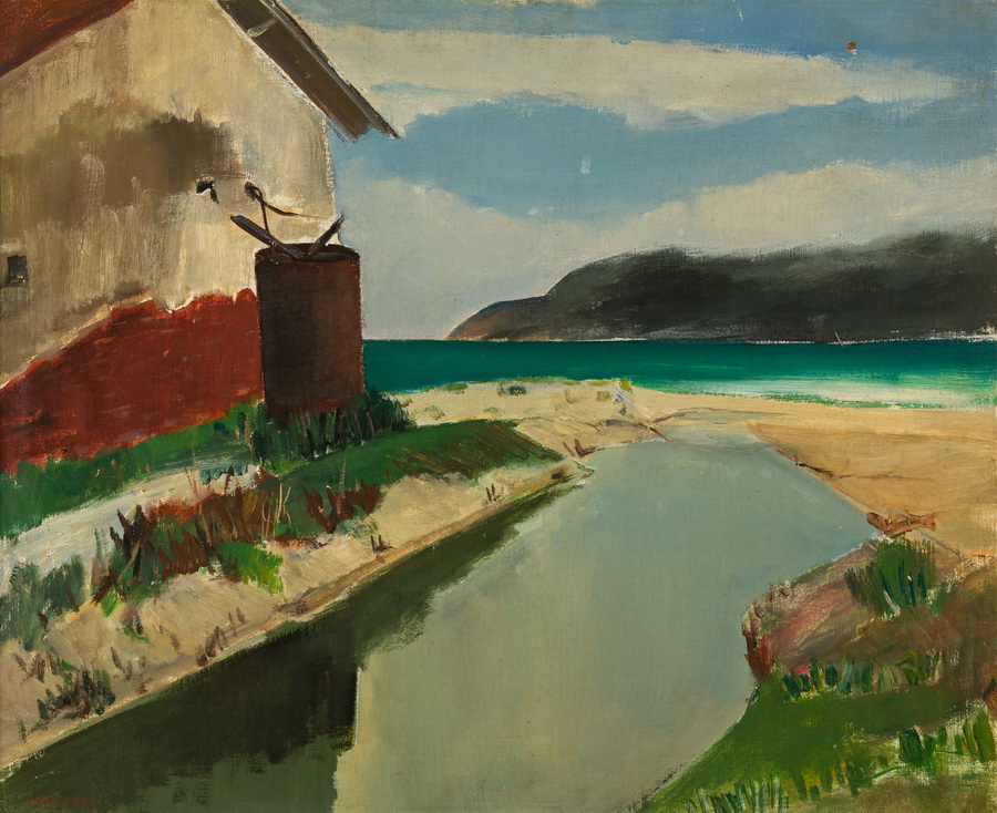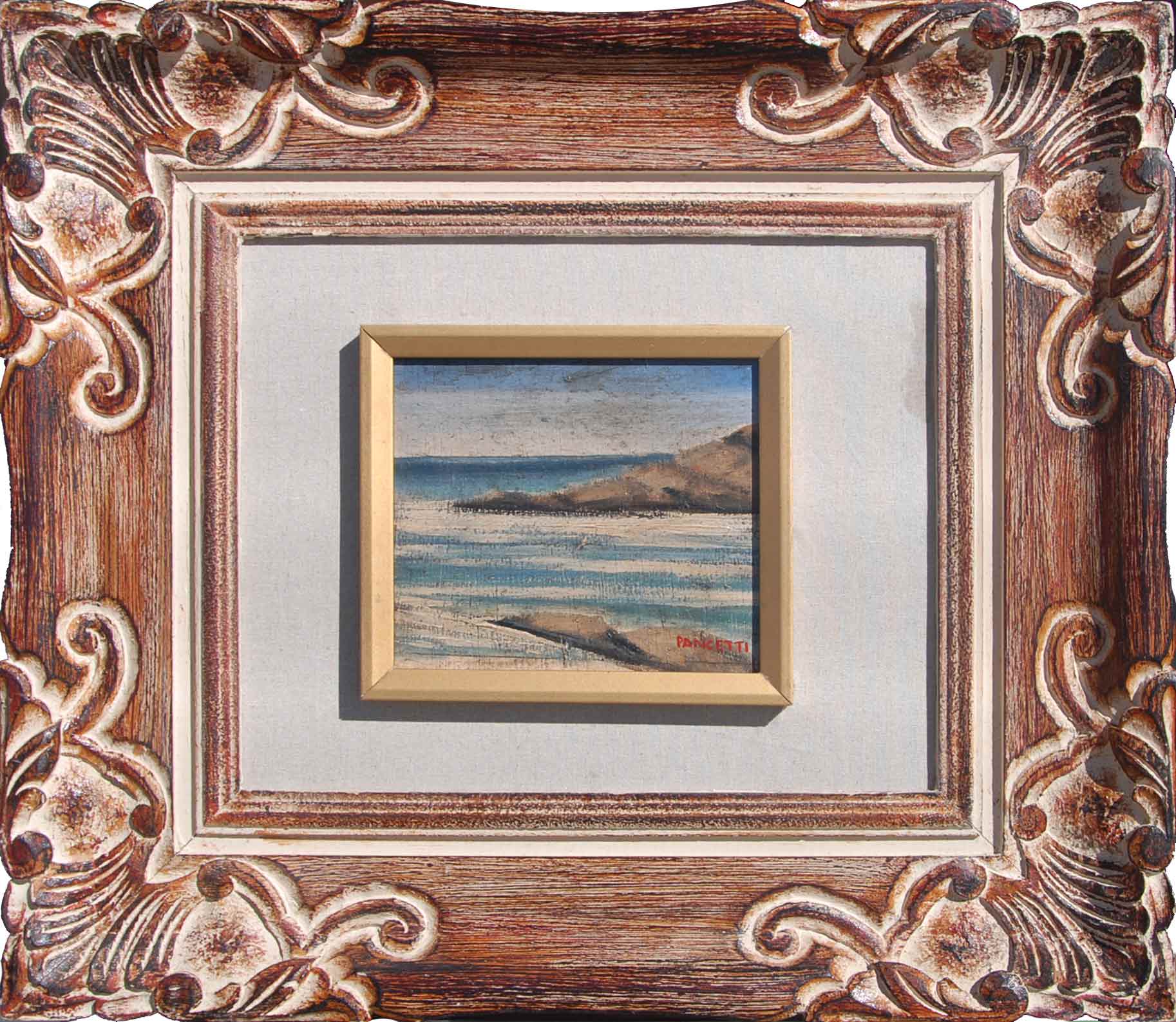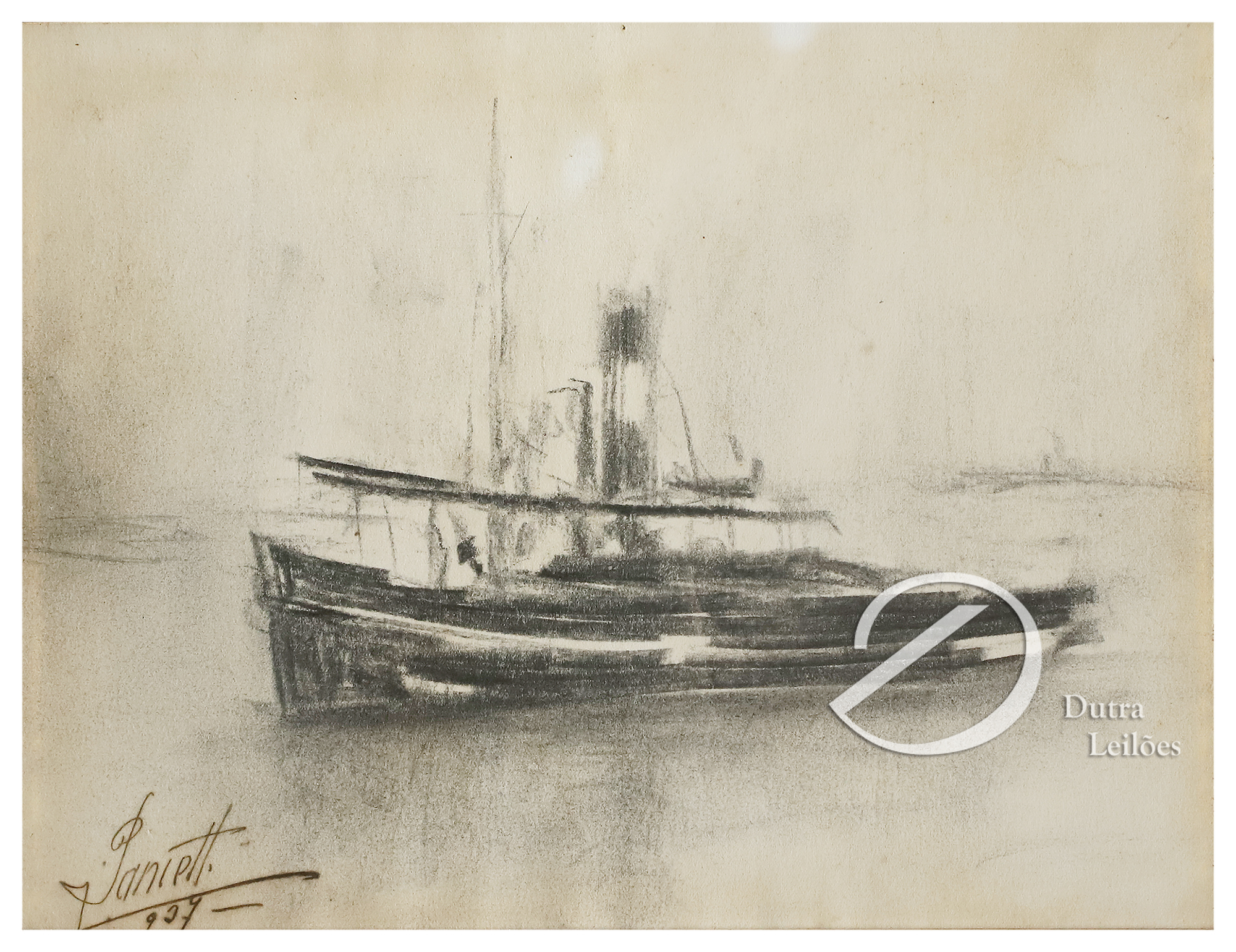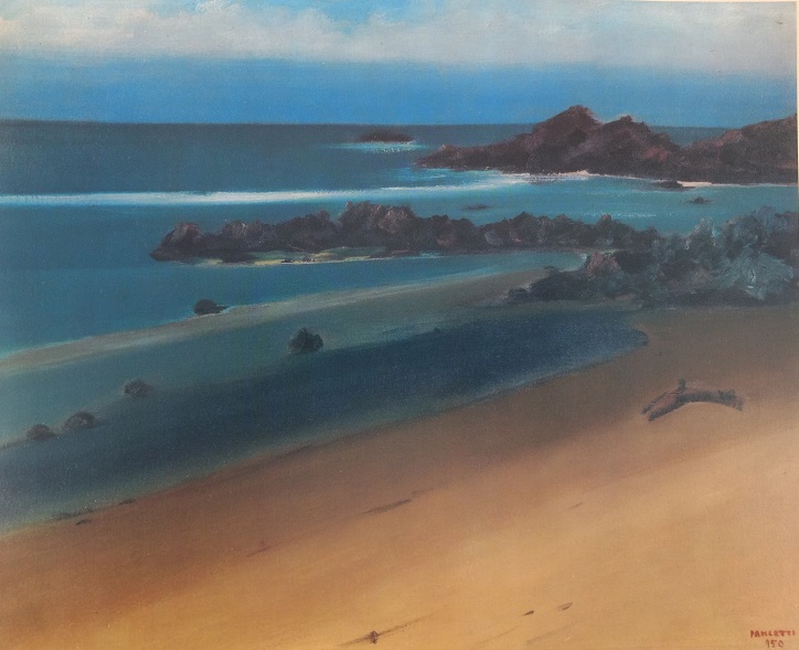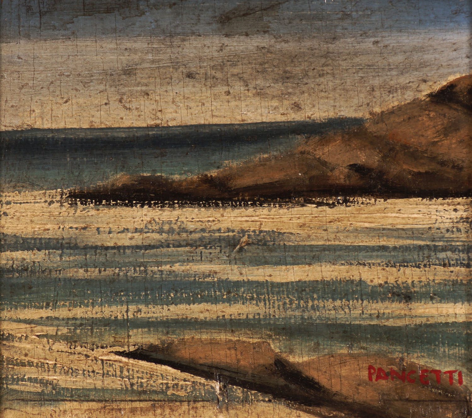 José Pancetti (1902–1958) – Marinha. Óleo sobre tela, dat. de 1945. Pintor brasileiro reconhecido sobretudo por suas marinhas, que evoluíram de uma construção analítica para soluções mais sintéticas e depuradas, aproximando-se da abstração, com forte ênfase na relação entre areia, luz e mar; integrou o Núcleo Bernardelli e consolidou-se como um dos principais nomes da pintura moderna brasileira. Ass. CIE. Dimensões: 32 × 49 cm.