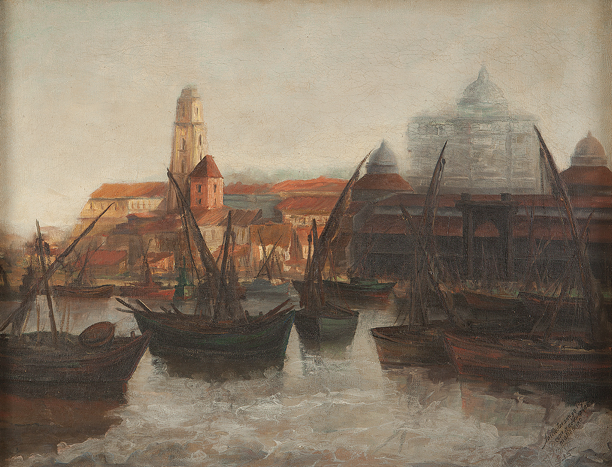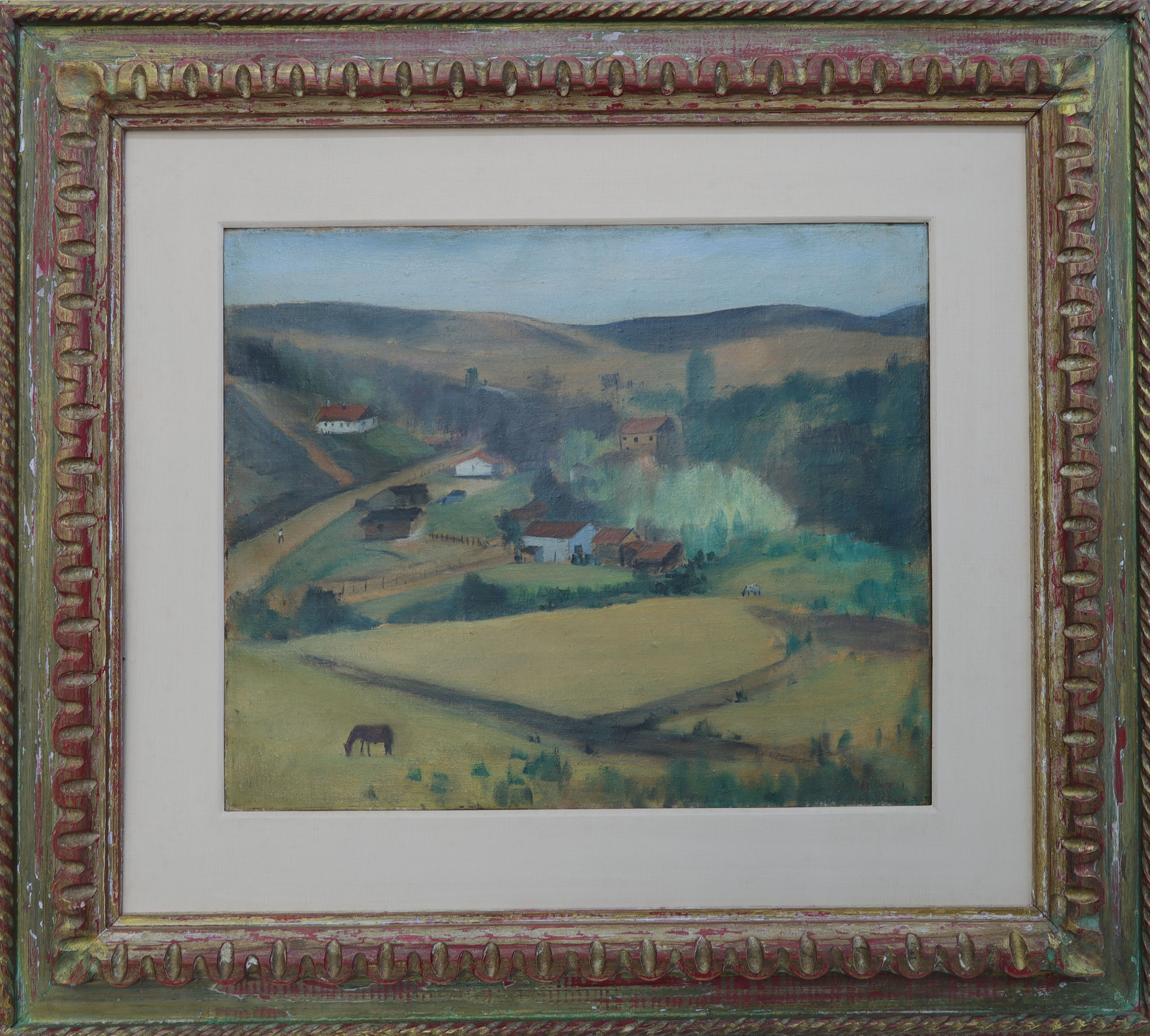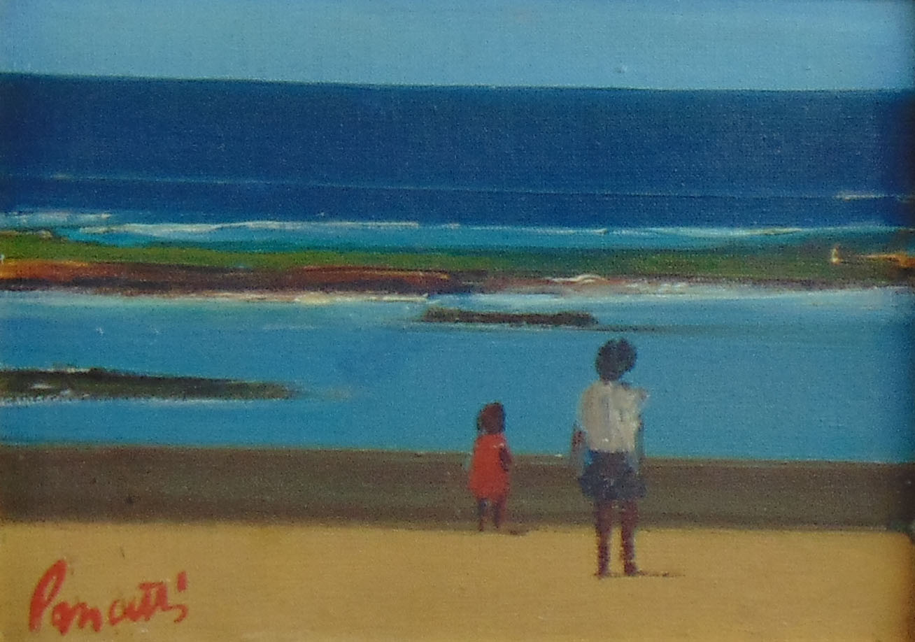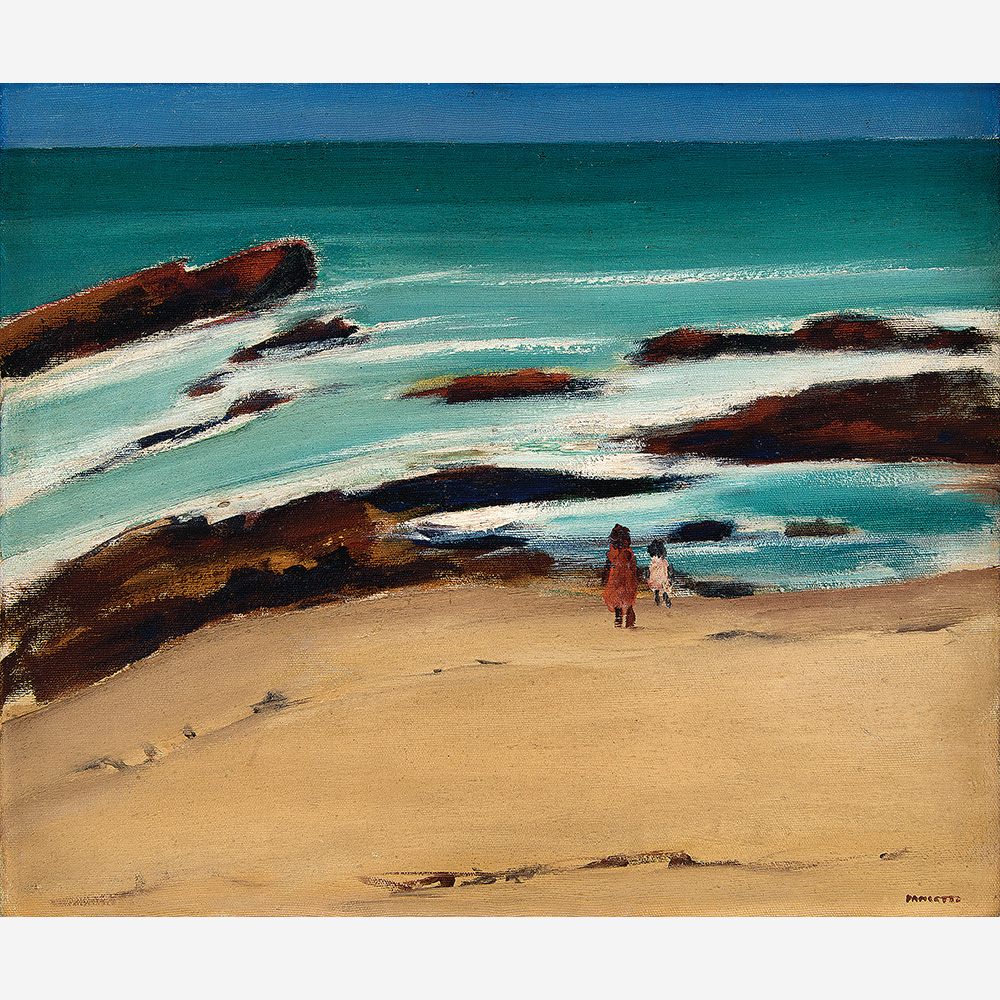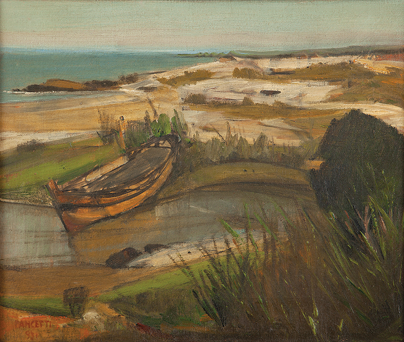 José Pancetti (1902–1958) – Marinha. Óleo sobre tela, dat. de 1945. Pintor brasileiro reconhecido sobretudo por suas marinhas, que evoluíram de uma construção analítica para soluções mais sintéticas e depuradas, aproximando-se da abstração, com forte ênfase na relação entre areia, luz e mar; integrou o Núcleo Bernardelli e consolidou-se como um dos principais nomes da pintura moderna brasileira. Ass. CIE. Dimensões: 32 × 49 cm.