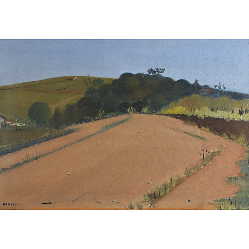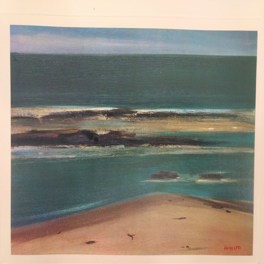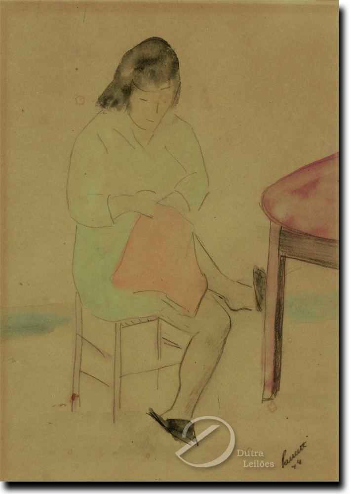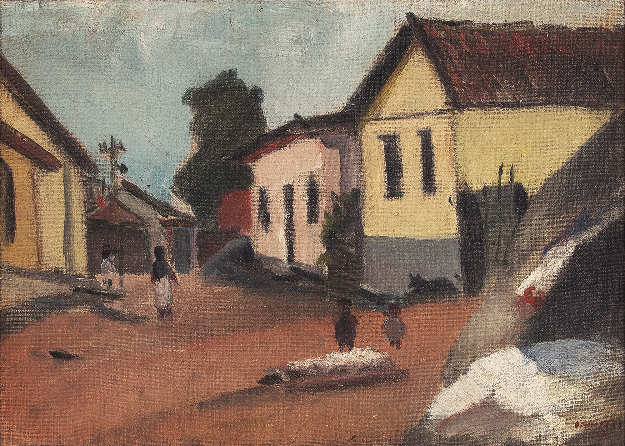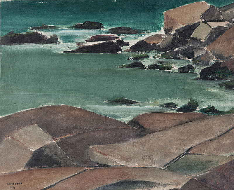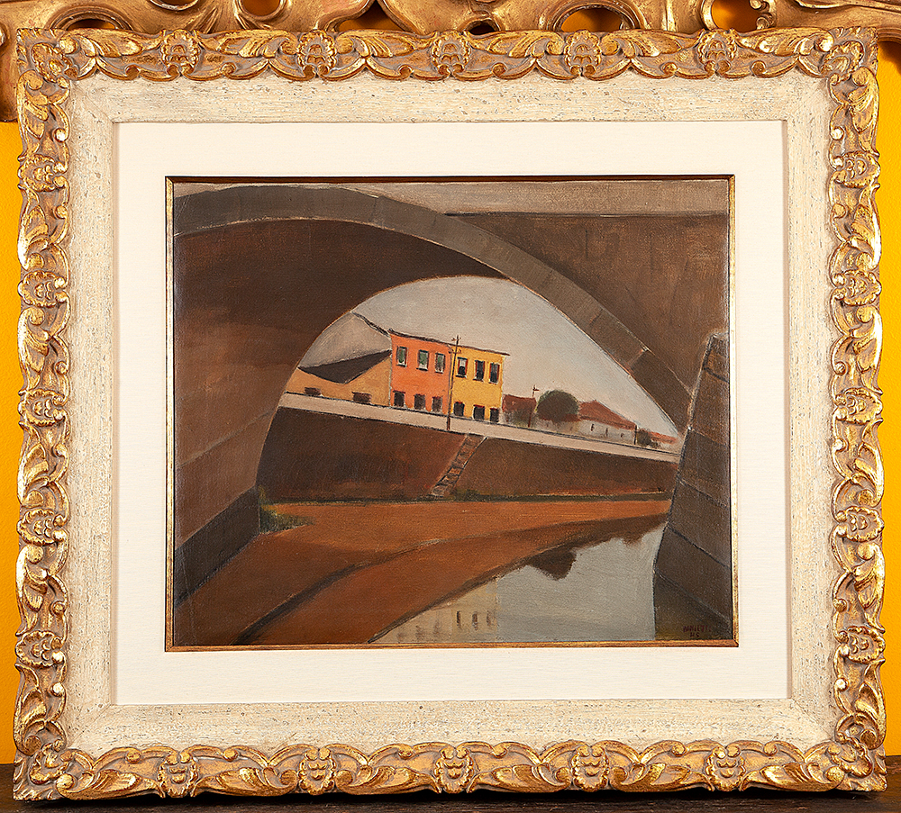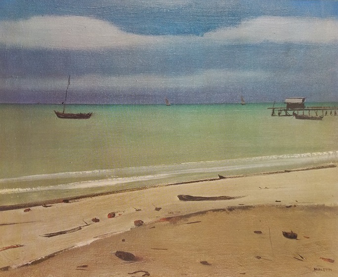 José Pancetti (1902–1958) – Marinha. Óleo sobre tela, dat. de 1945. Pintor brasileiro reconhecido sobretudo por suas marinhas, que evoluíram de uma construção analítica para soluções mais sintéticas e depuradas, aproximando-se da abstração, com forte ênfase na relação entre areia, luz e mar; integrou o Núcleo Bernardelli e consolidou-se como um dos principais nomes da pintura moderna brasileira. Ass. CIE. Dimensões: 32 × 49 cm.