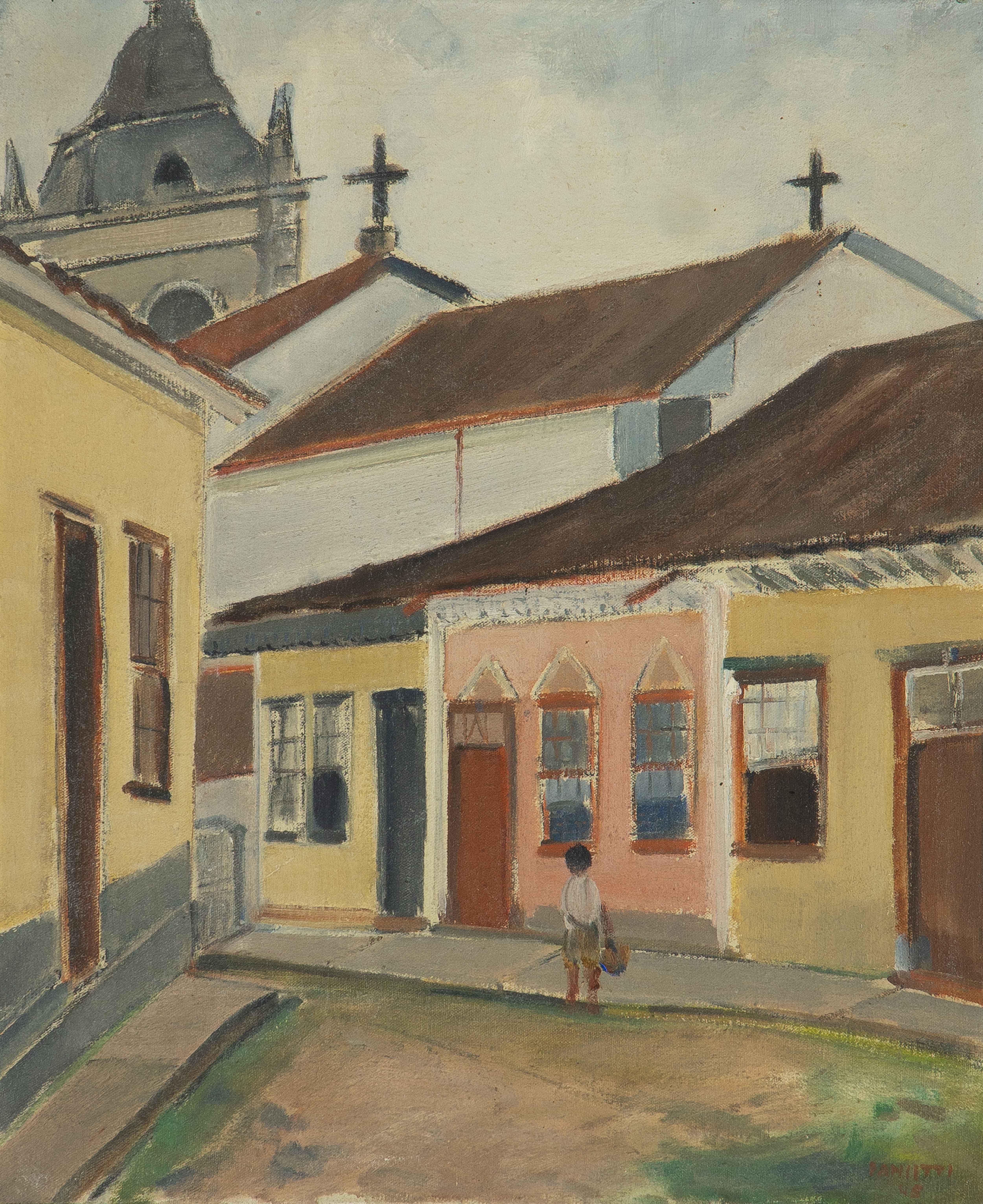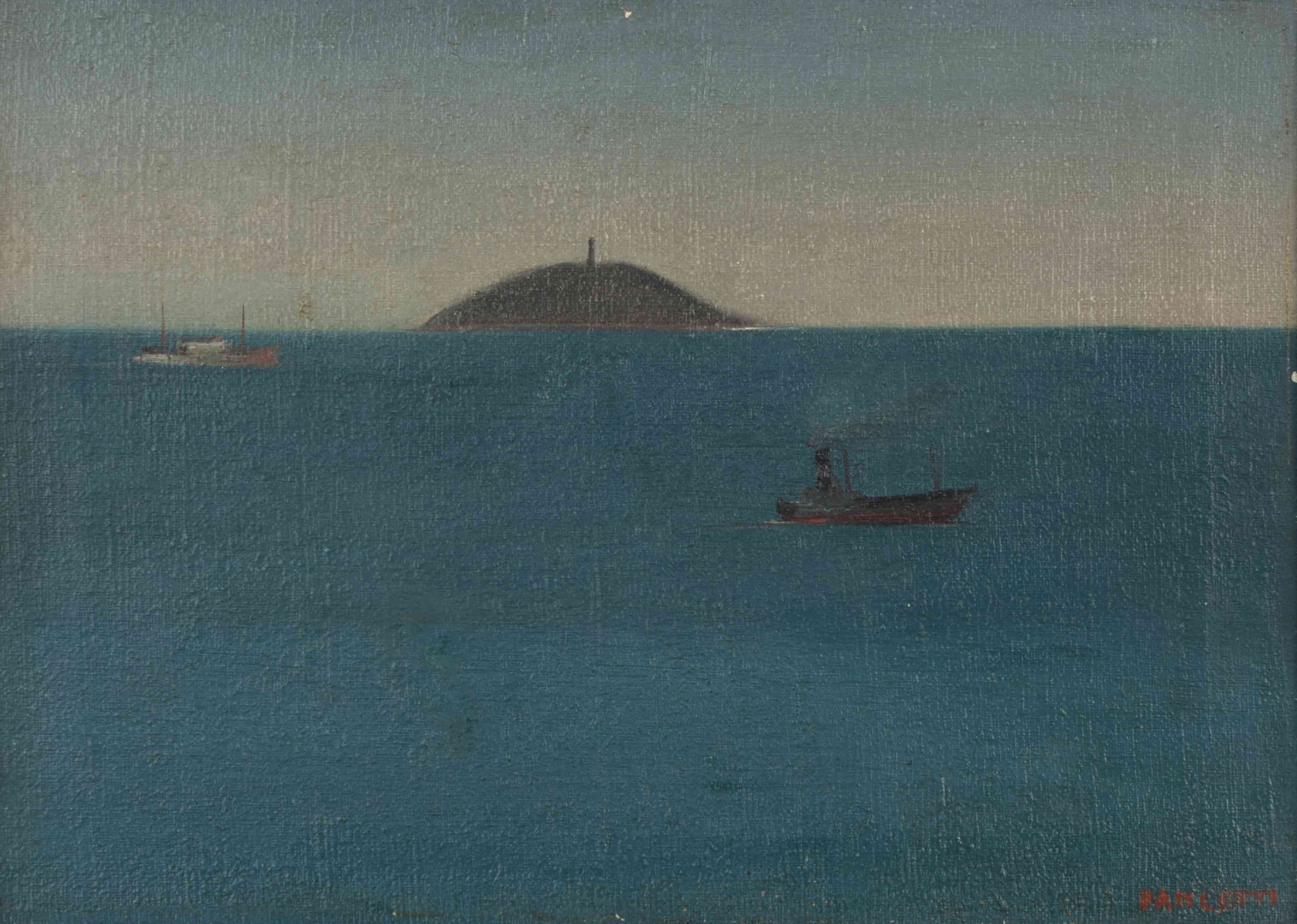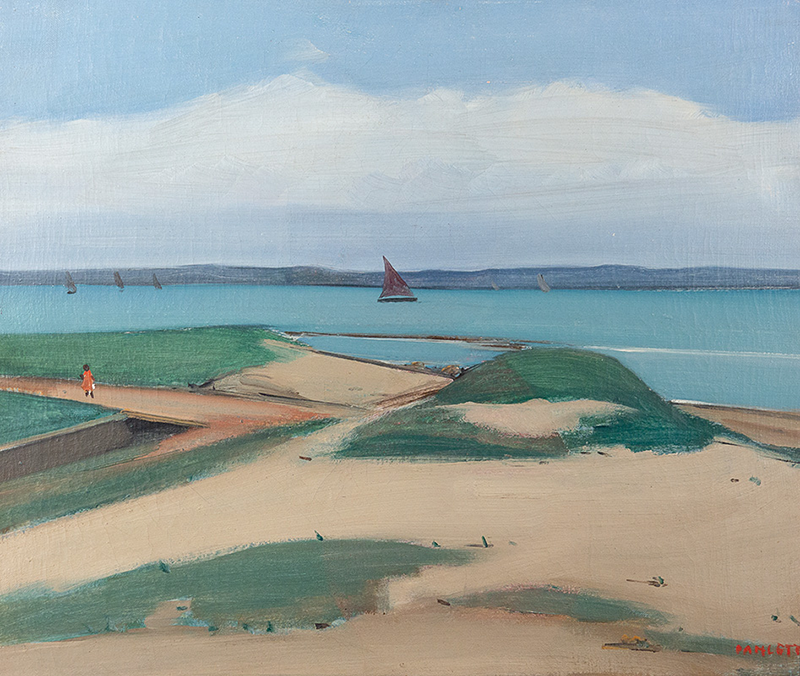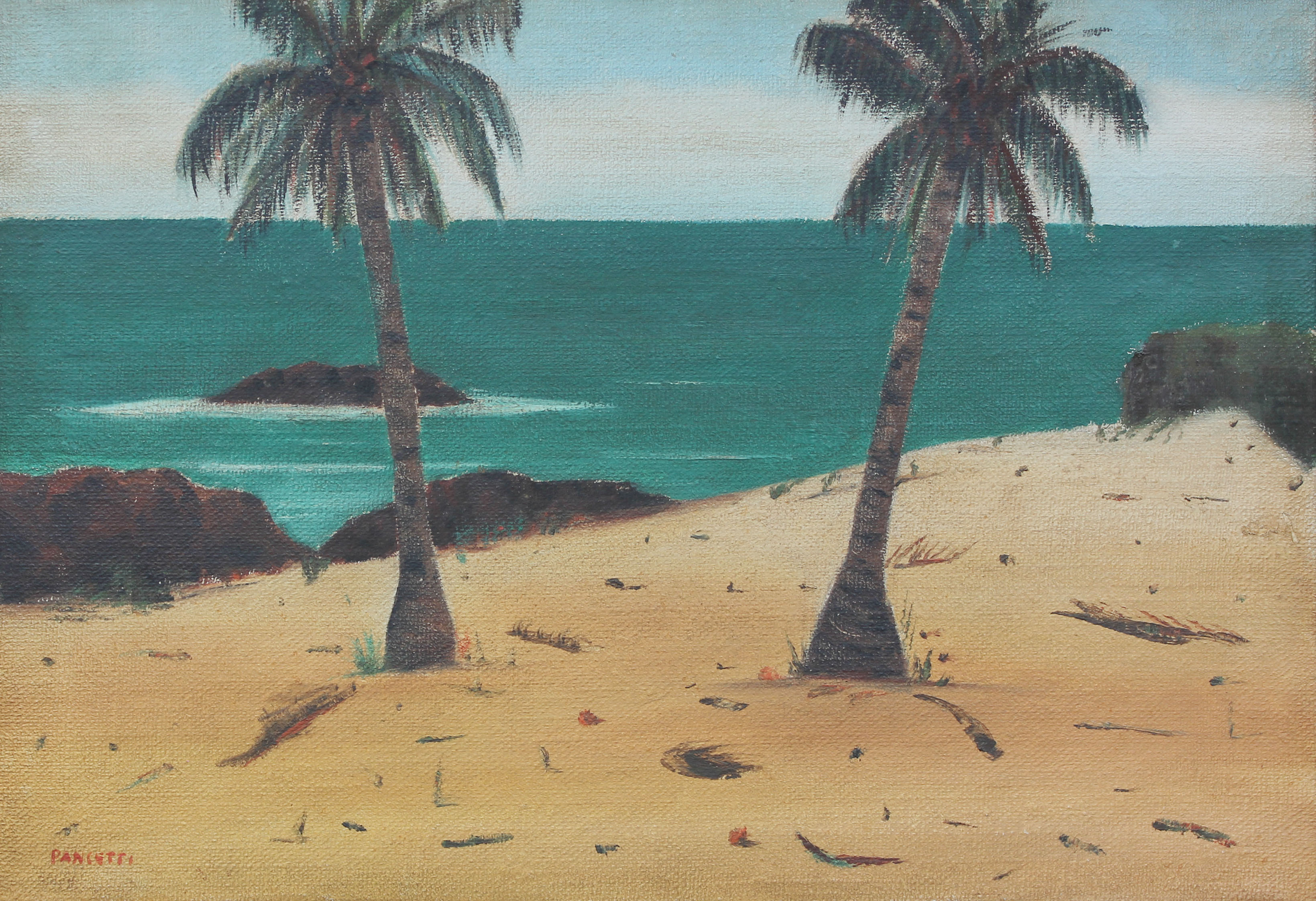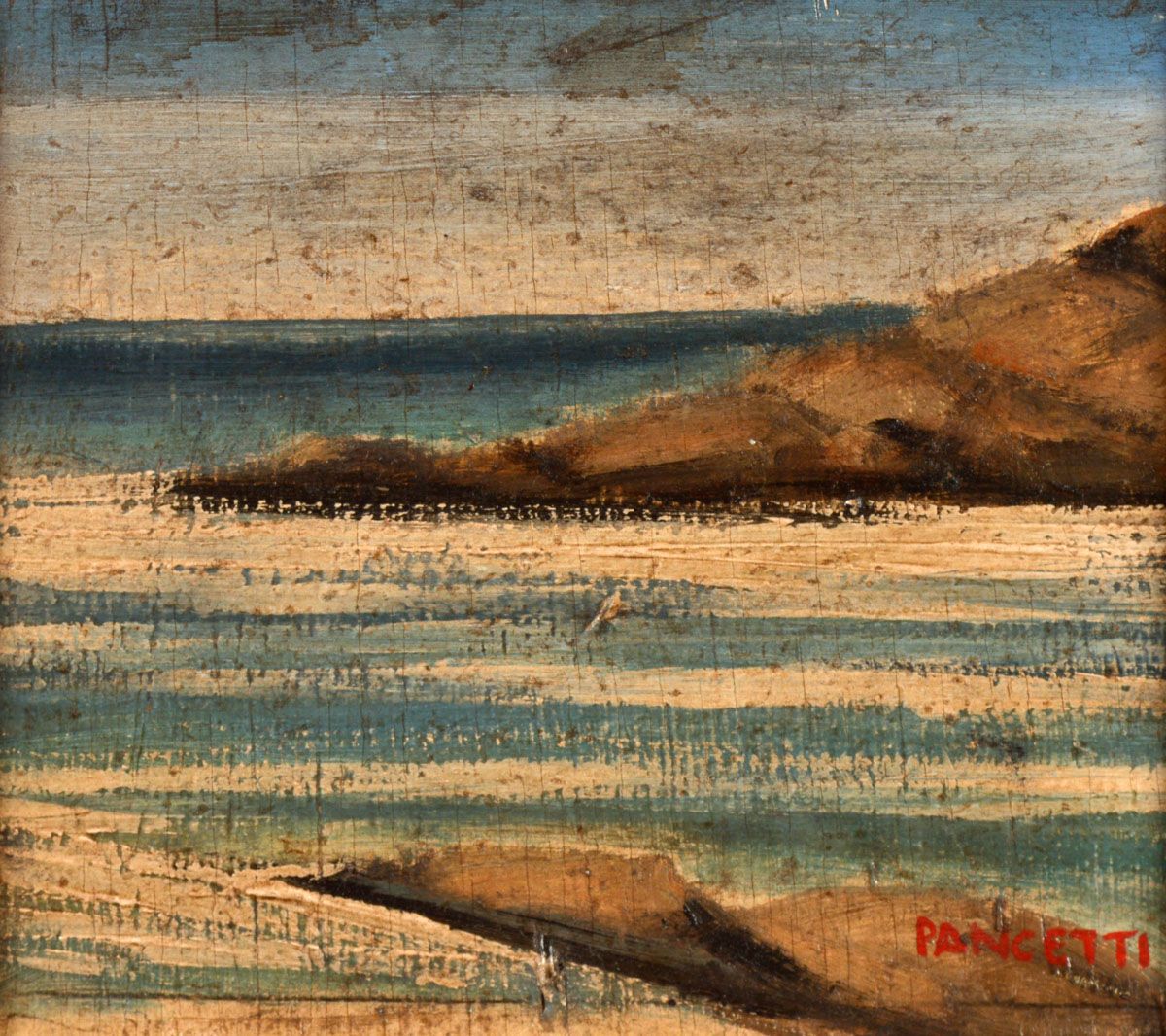 José Pancetti (1902–1958) – Marinha. Óleo sobre tela, dat. de 1945. Pintor brasileiro reconhecido sobretudo por suas marinhas, que evoluíram de uma construção analítica para soluções mais sintéticas e depuradas, aproximando-se da abstração, com forte ênfase na relação entre areia, luz e mar; integrou o Núcleo Bernardelli e consolidou-se como um dos principais nomes da pintura moderna brasileira. Ass. CIE. Dimensões: 32 × 49 cm.
