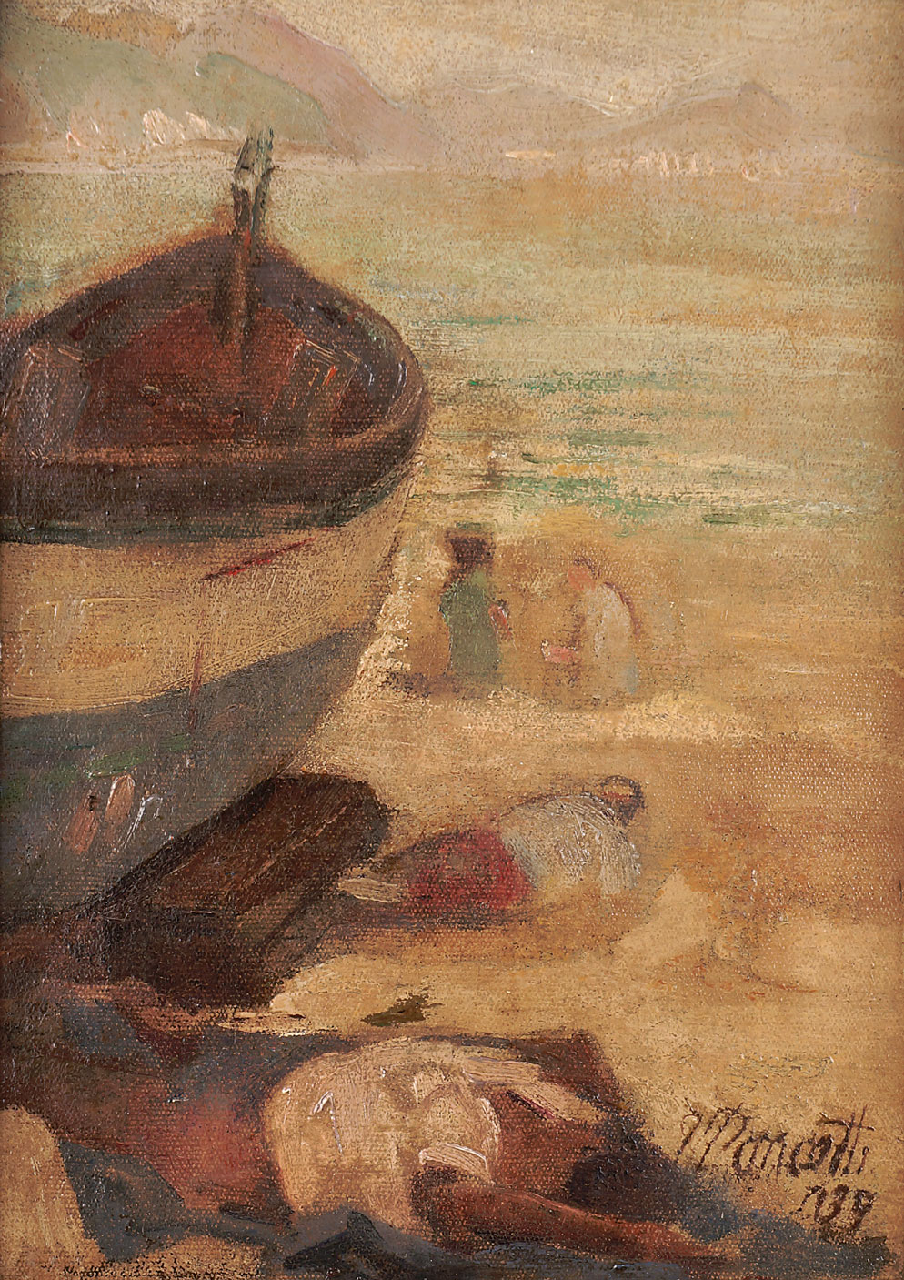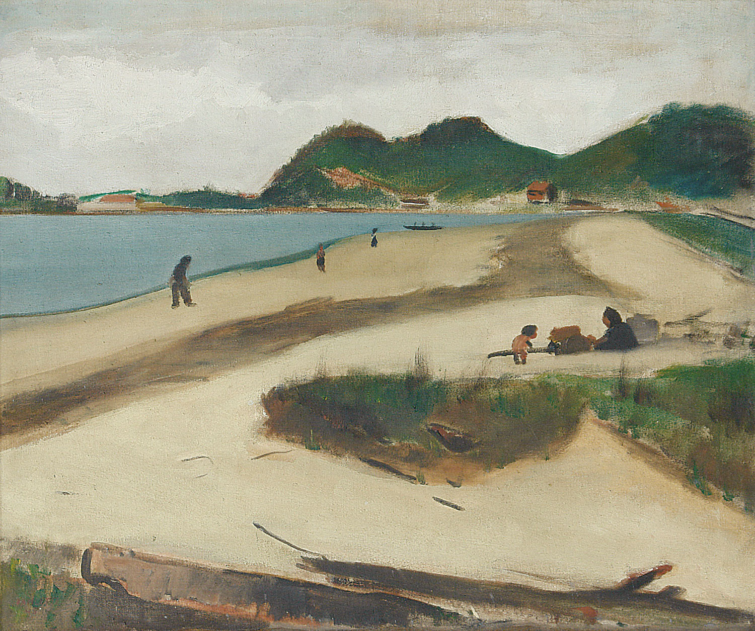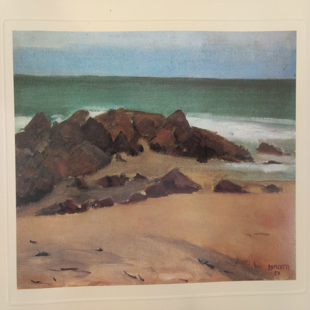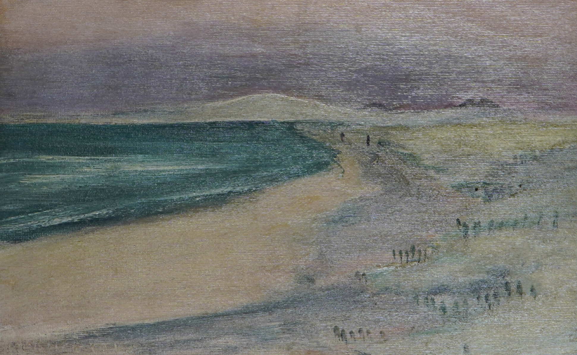 José Pancetti (1902–1958) – Marinha. Óleo sobre tela, dat. de 1945. Pintor brasileiro reconhecido sobretudo por suas marinhas, que evoluíram de uma construção analítica para soluções mais sintéticas e depuradas, aproximando-se da abstração, com forte ênfase na relação entre areia, luz e mar; integrou o Núcleo Bernardelli e consolidou-se como um dos principais nomes da pintura moderna brasileira. Ass. CIE. Dimensões: 32 × 49 cm.