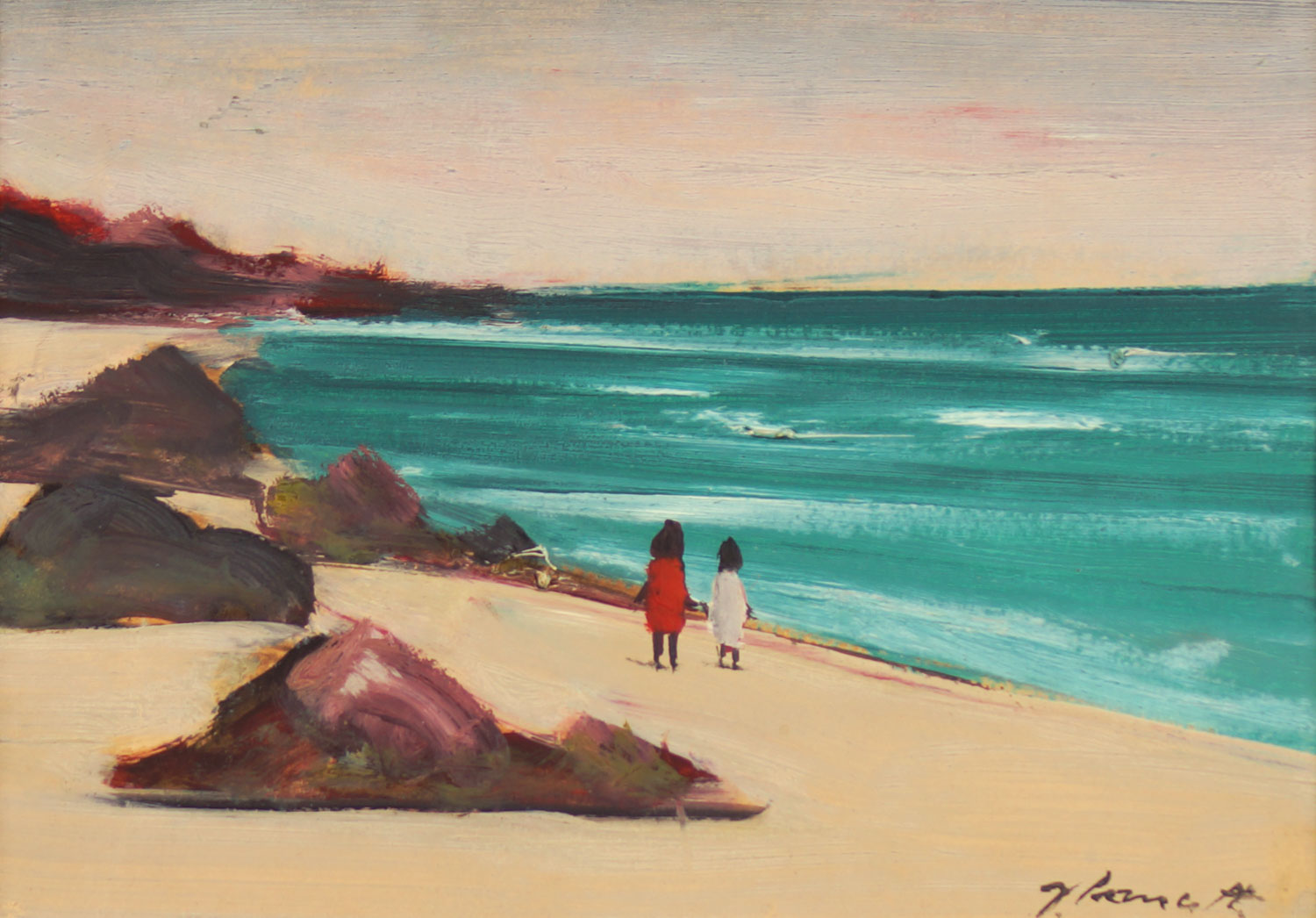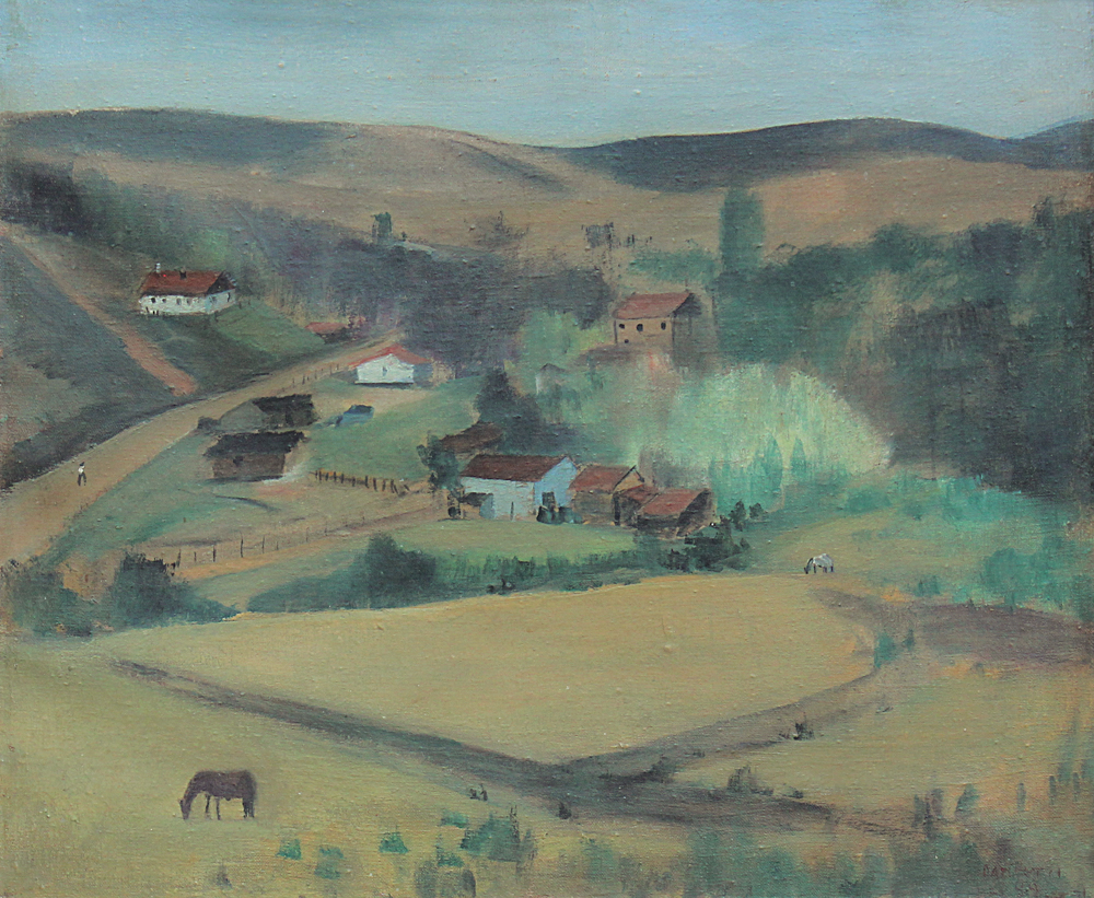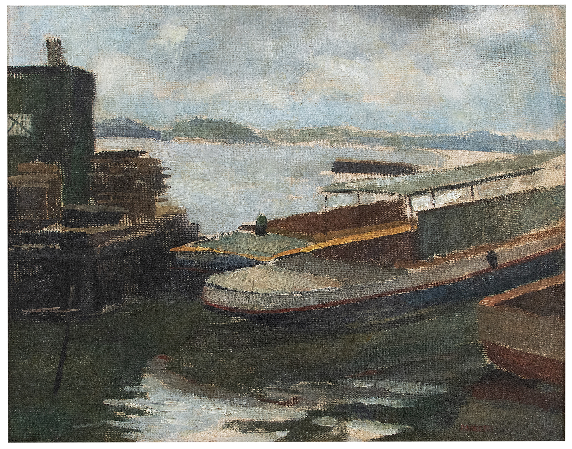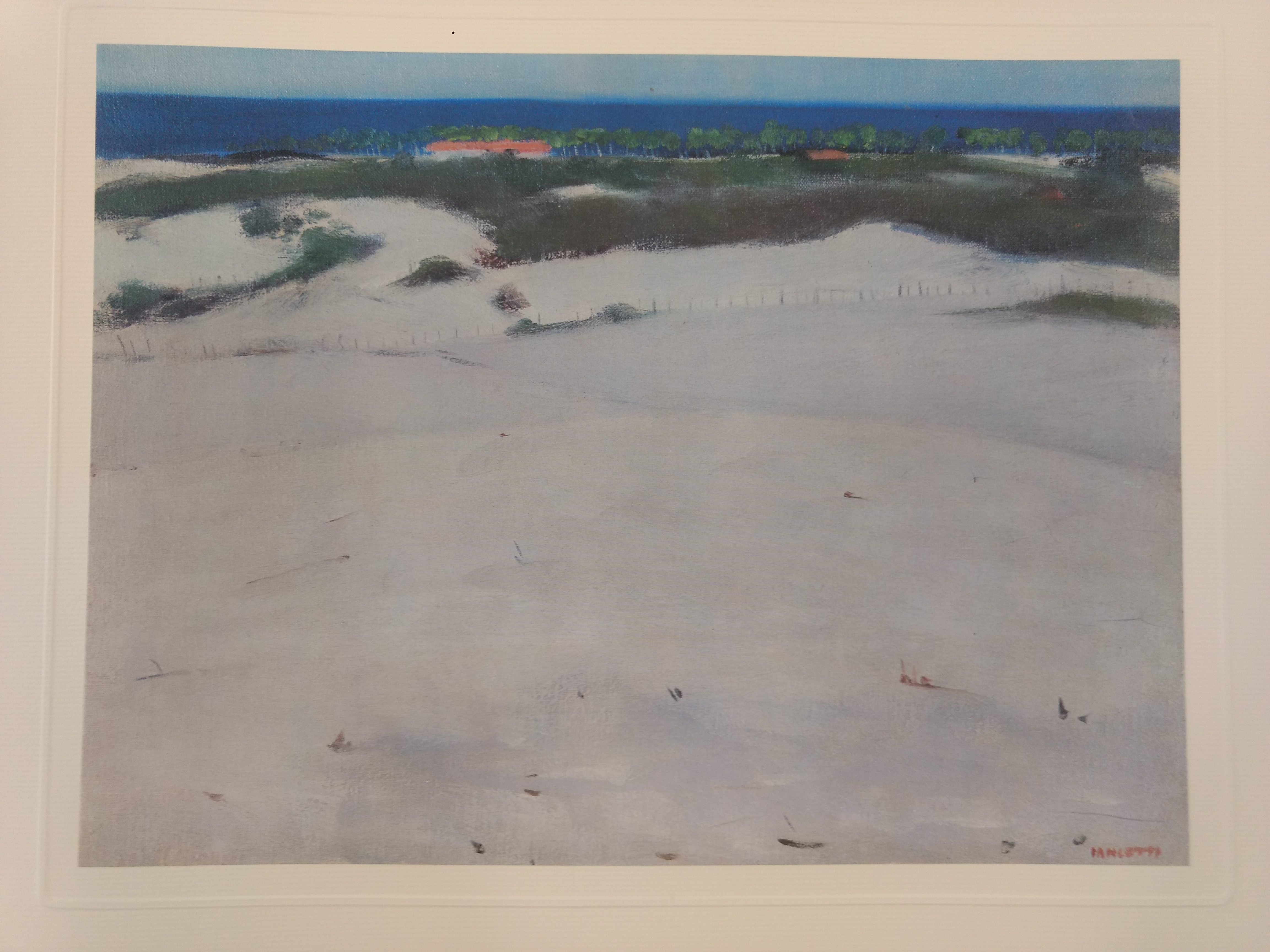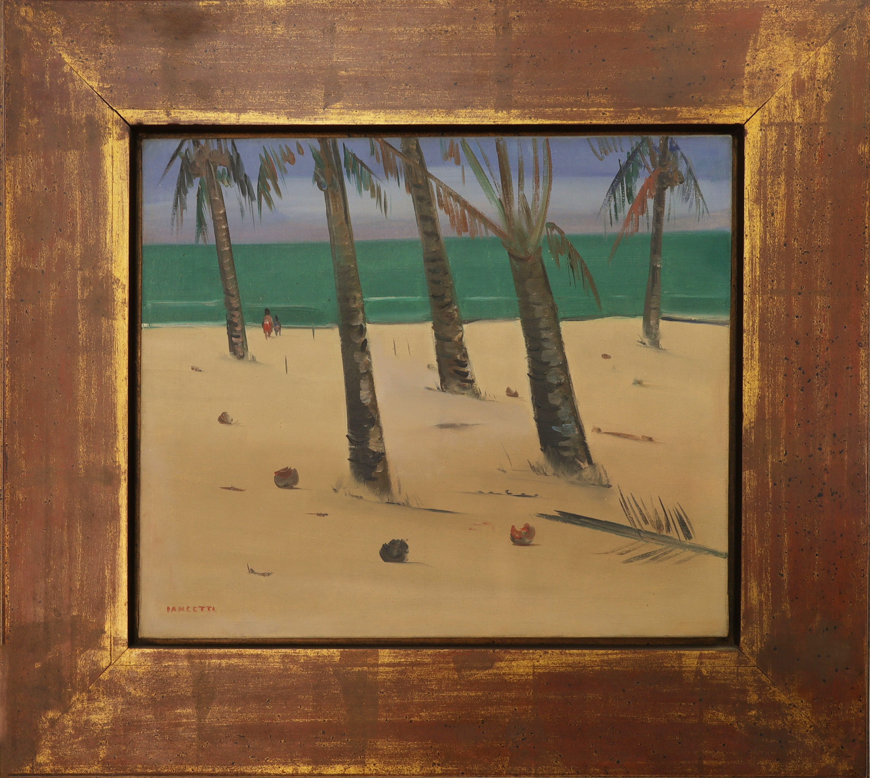 José Pancetti (1902–1958) – Marinha. Óleo sobre tela, dat. de 1945. Pintor brasileiro reconhecido sobretudo por suas marinhas, que evoluíram de uma construção analítica para soluções mais sintéticas e depuradas, aproximando-se da abstração, com forte ênfase na relação entre areia, luz e mar; integrou o Núcleo Bernardelli e consolidou-se como um dos principais nomes da pintura moderna brasileira. Ass. CIE. Dimensões: 32 × 49 cm.