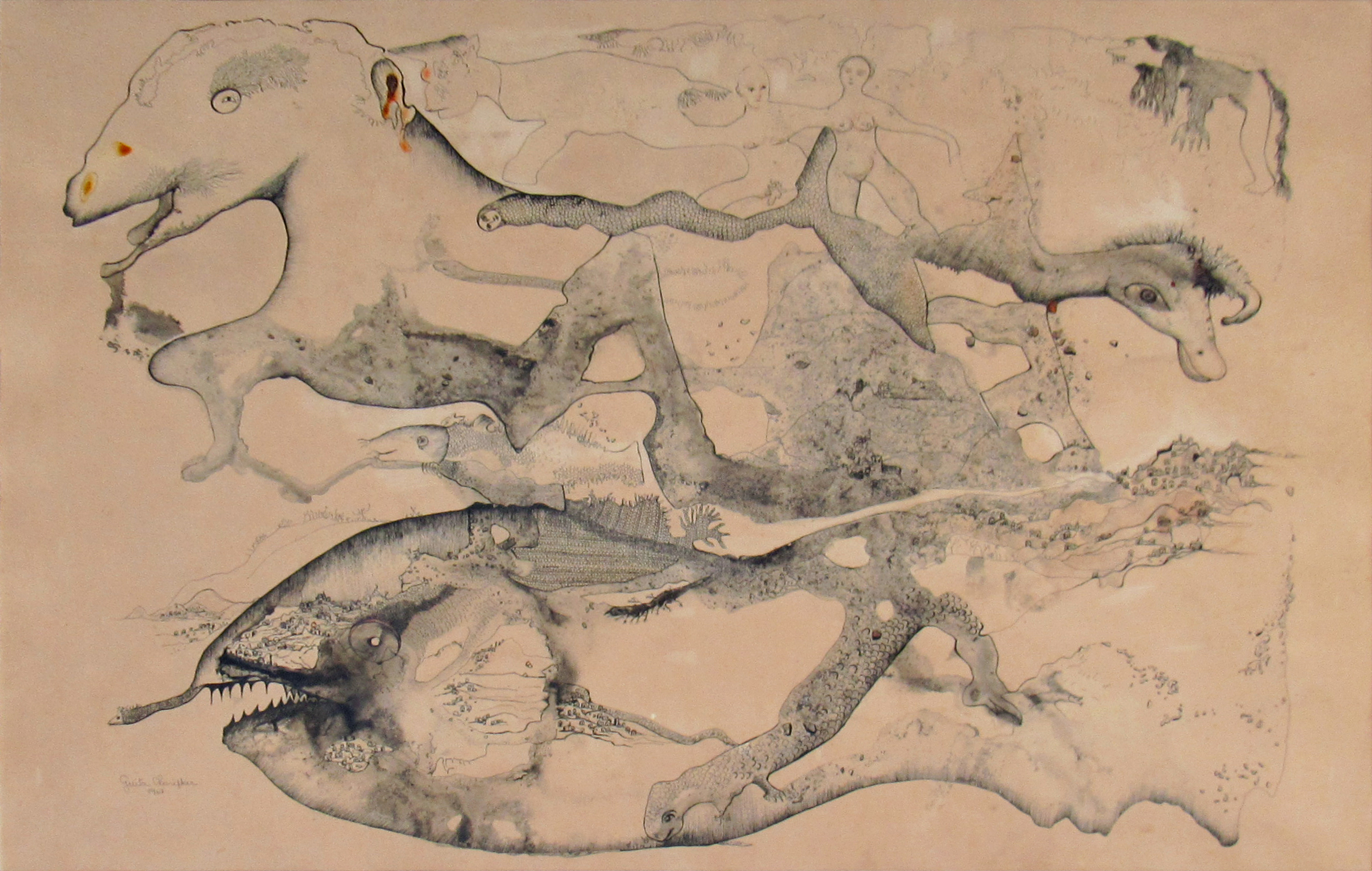 Desde o fim da década de 1960, Guita Charifker produz desenhos de inspiração surrealista, associando formas humanas a animais e vegetais, realizados com precisão de detalhes, em obras de forte erotismo. Trabalha de forma quase monocrômica, com traços tênues e manchas a bico-de-pena e aguada, revelando um universo onírico de formas simbólicas.
