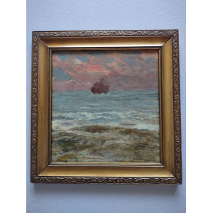 Helios Seelinger, marinha com barco e gaivota, óleo sobre placa, 26,3 x 25,3 cm
